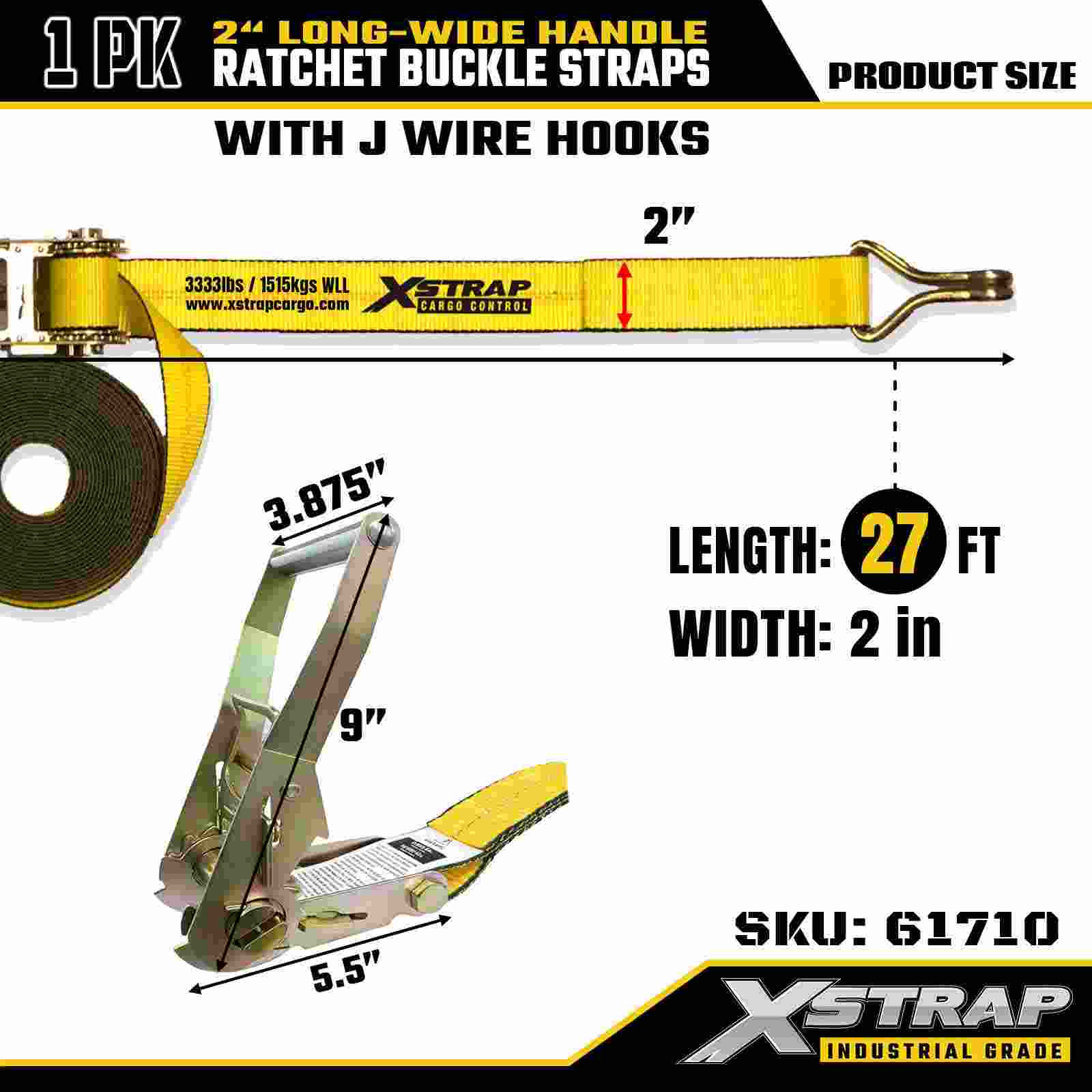 Xstrap 61710 Legatura a cricchetto Premium 2" x 27 piedi (confezione da 1) Resistenza alla rottura di 10.000 libbre Cinghie di carico con doppio gancio a J perfette per lo spostamento di elettrodomestici, attrezzature da prato e motocicli