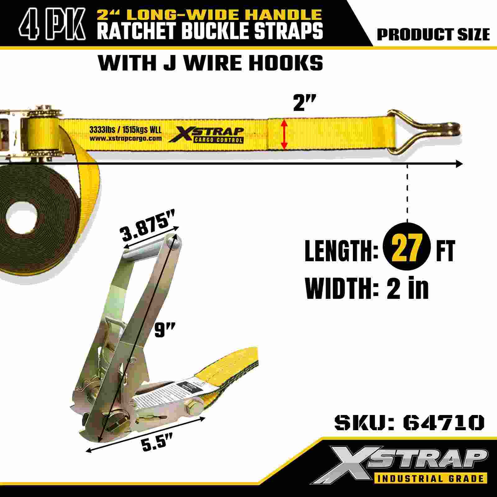 Xstrap 64710 Cinghie a cricchetto per il controllo del carico 2" x 27 piedi (confezione da 4) – Ganci in filo metallico, capacità nominale di 10.000 libbre, ancoraggio durevole per il trasporto di attrezzature
