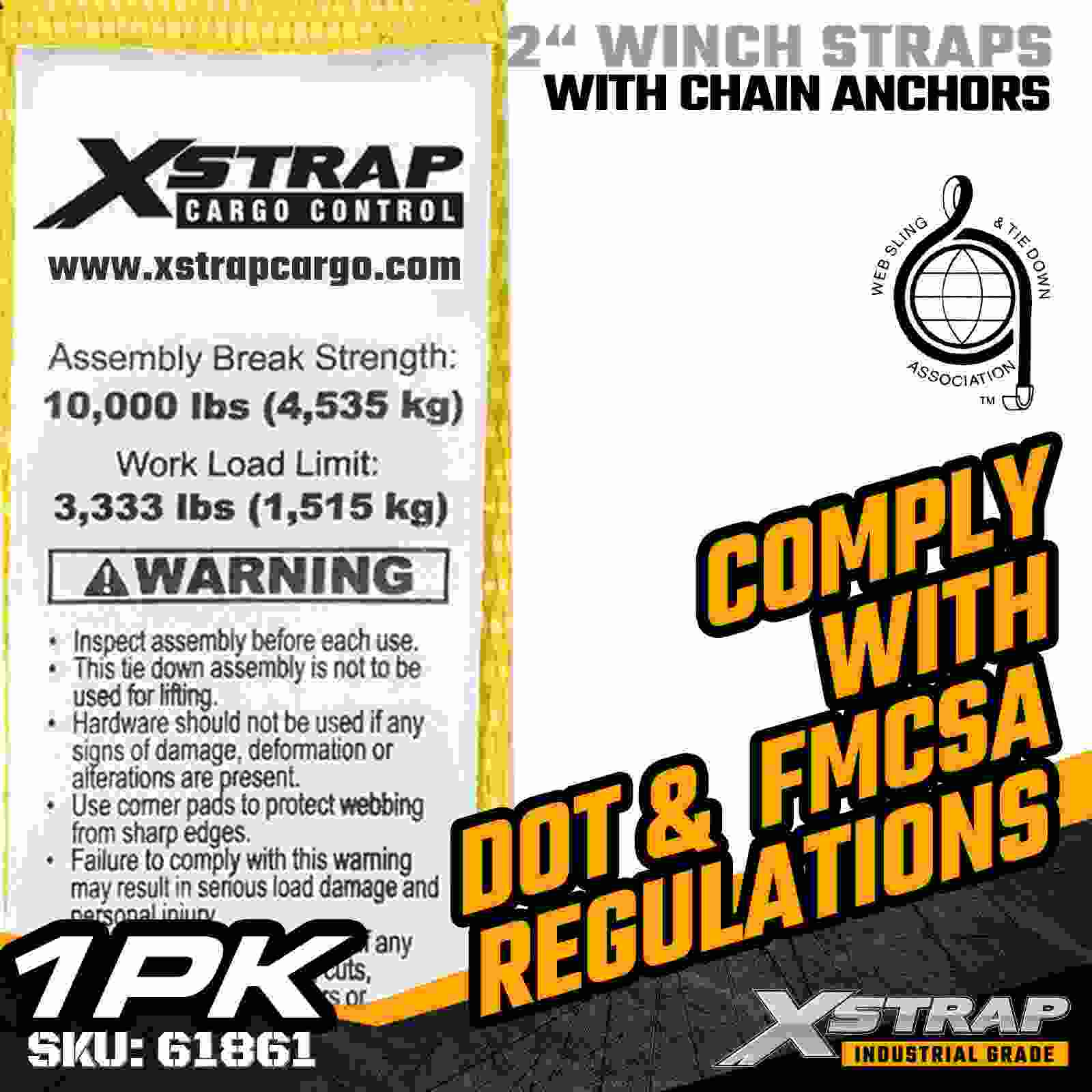 La cinghia per verricello standard Xstrap 61861 da 2" × 27 piedi è costruita per un fissaggio affidabile del carico a pianale, dotata di ancoraggi a catena durevoli e cinghie in poliestere ad alta resistenza. Con un limite di carico di lavoro di 3.333 libbre e una resistenza alla rottura di 10.000 libbre, fornisce prestazioni affidabili per il trasporto quotidiano di merci, carichi di pallet, legname, tubi e applicazioni logistiche generali.