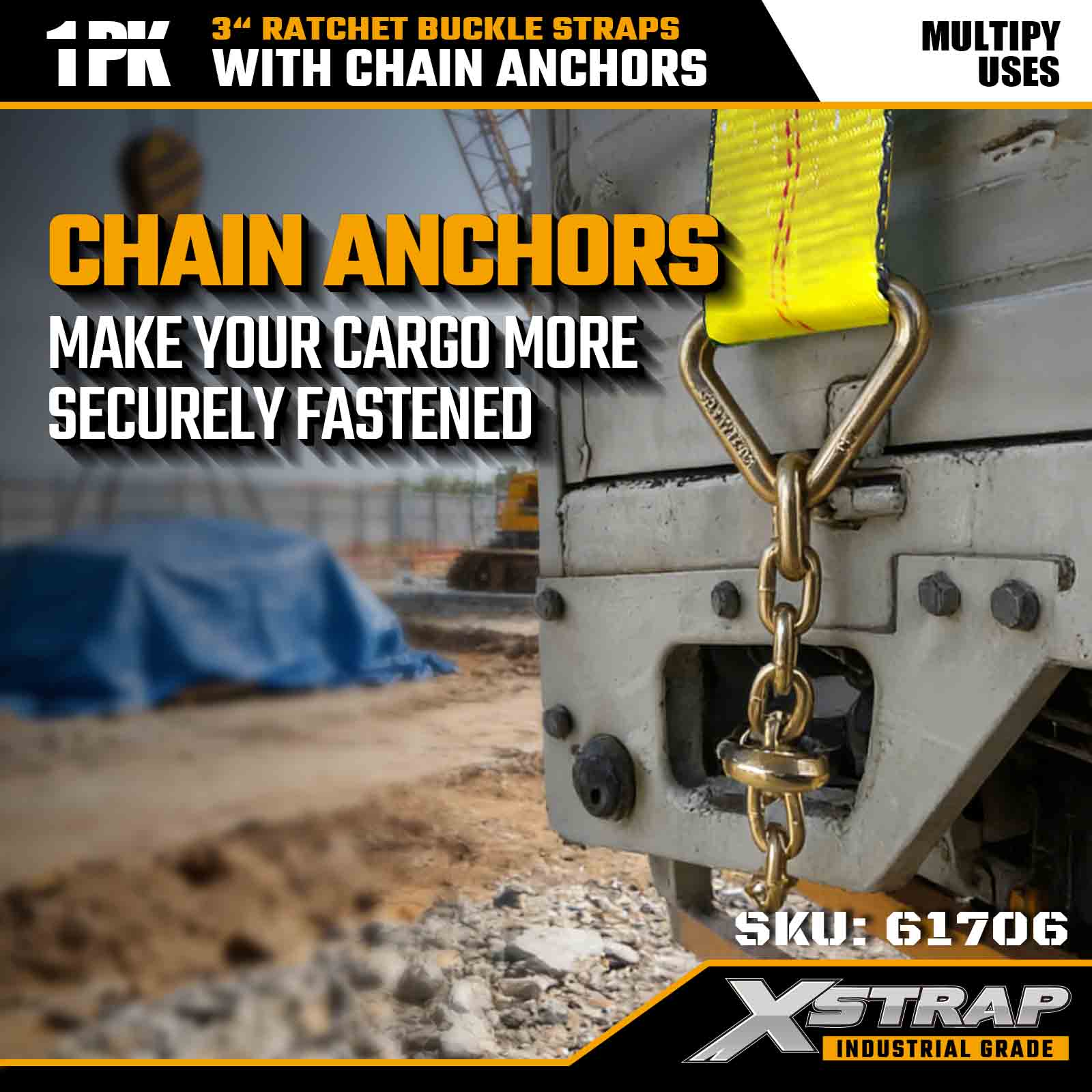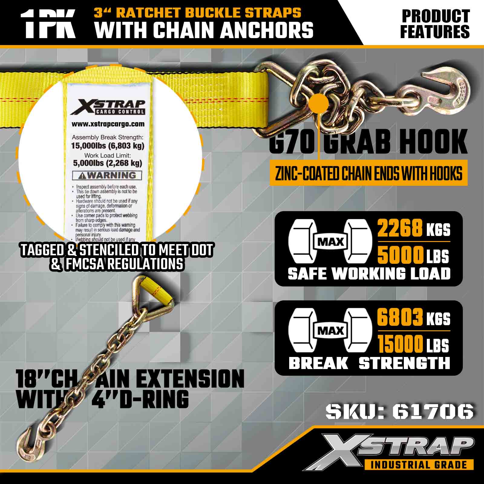 - Indice di carico di livello professionale per uso industriale: progettato per soddisfare rigorosi standard di trasporto con una resistenza alla rottura di 15.000 libbre e un WLL di 5.000 libbre, che lo rendono una scelta affidabile per flotte di autotrasporti e professionisti dell'edilizia.