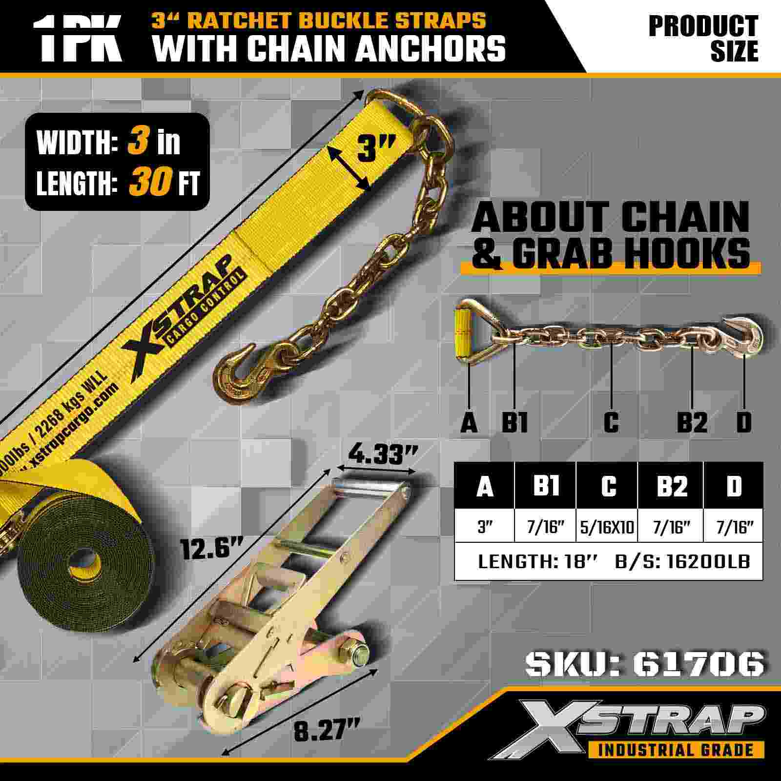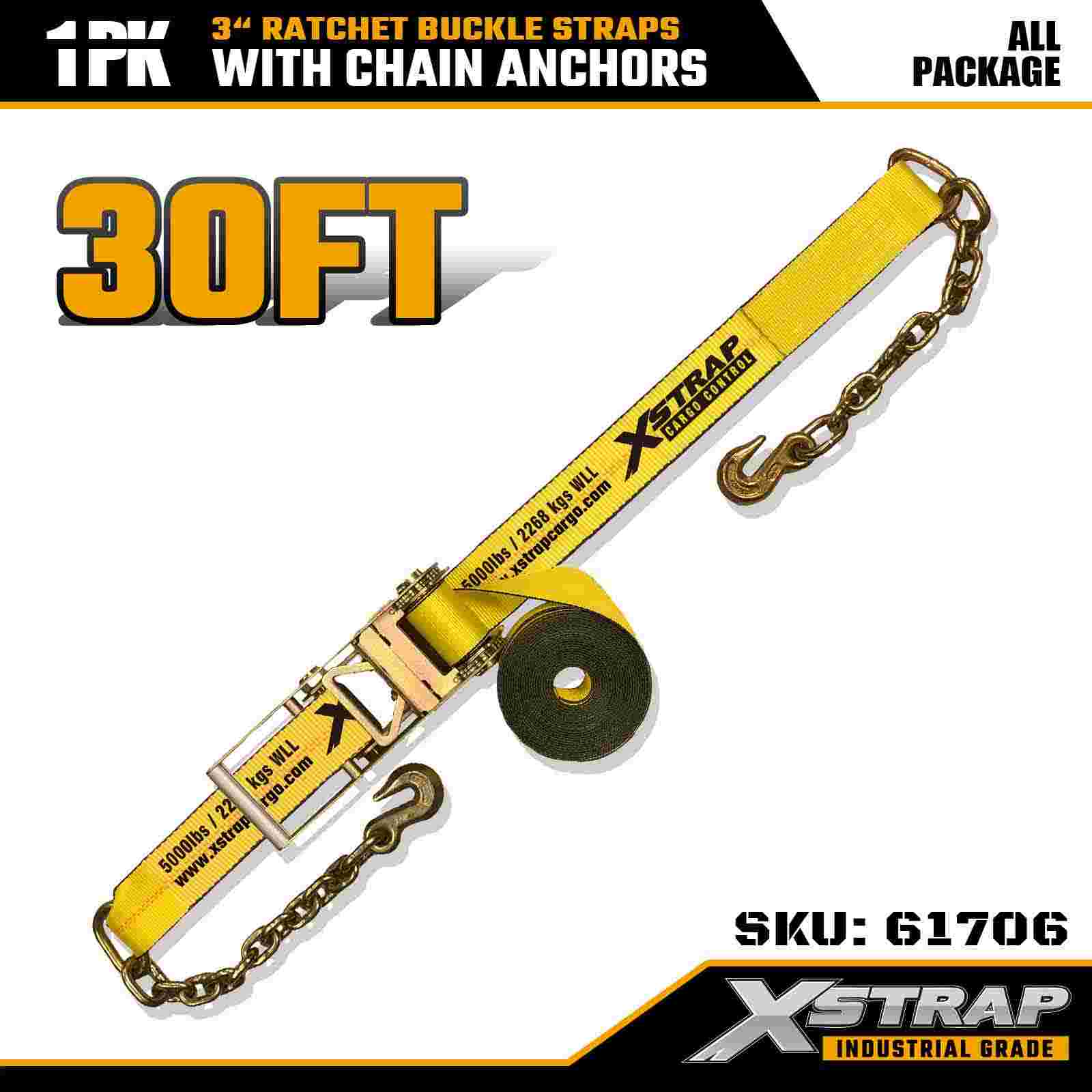 La cinghia con fibbia a cricchetto Xstrap 61706 da 3" x 30 piedi (confezione da 1) è progettata per il fissaggio di carichi pesanti, con ancoraggi a catena forgiati e un sistema a cricchetto ad alta tensione. Con un WLL di 5.000 libbre e una resistenza alla rottura di 15.000 libbre, offre prestazioni affidabili per pianali, trasporto di macchinari e trasporto industriale.