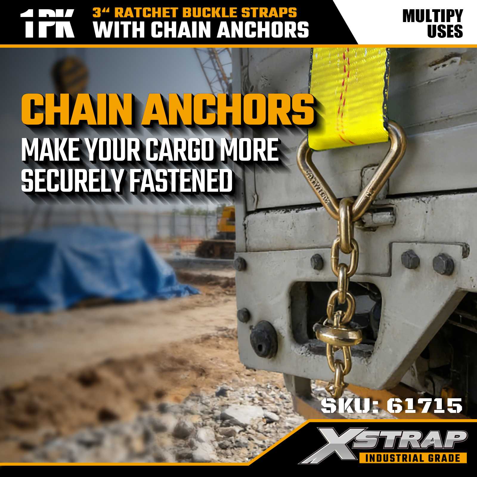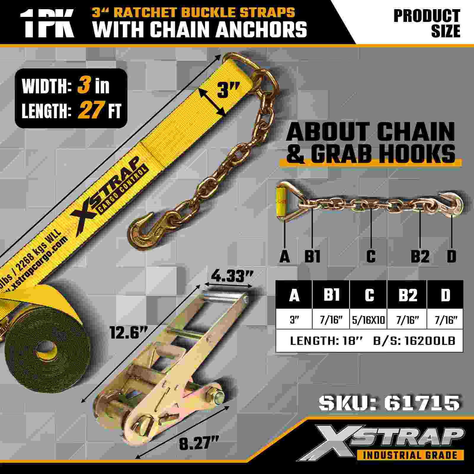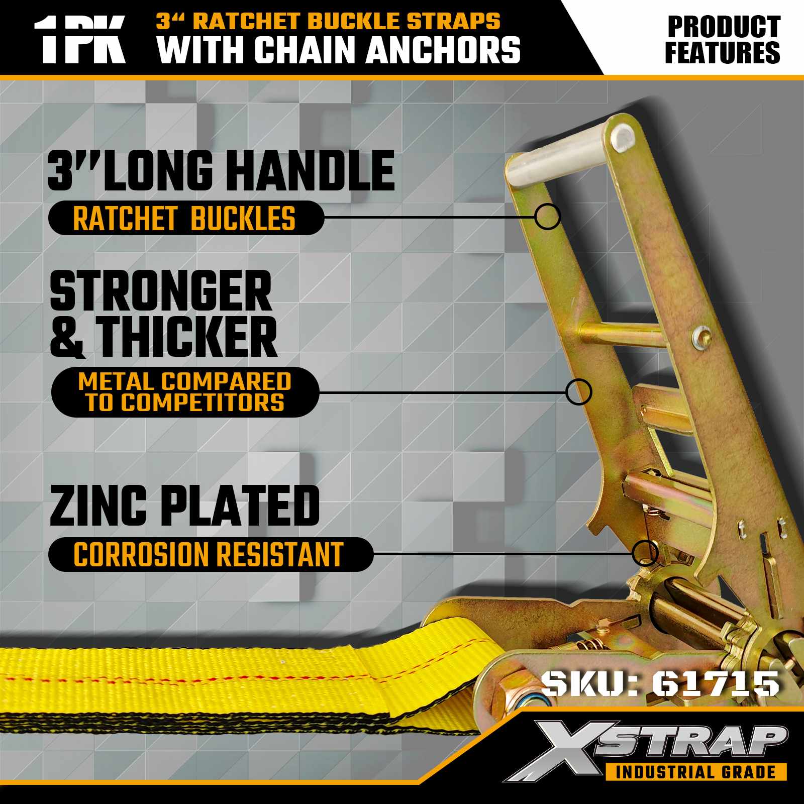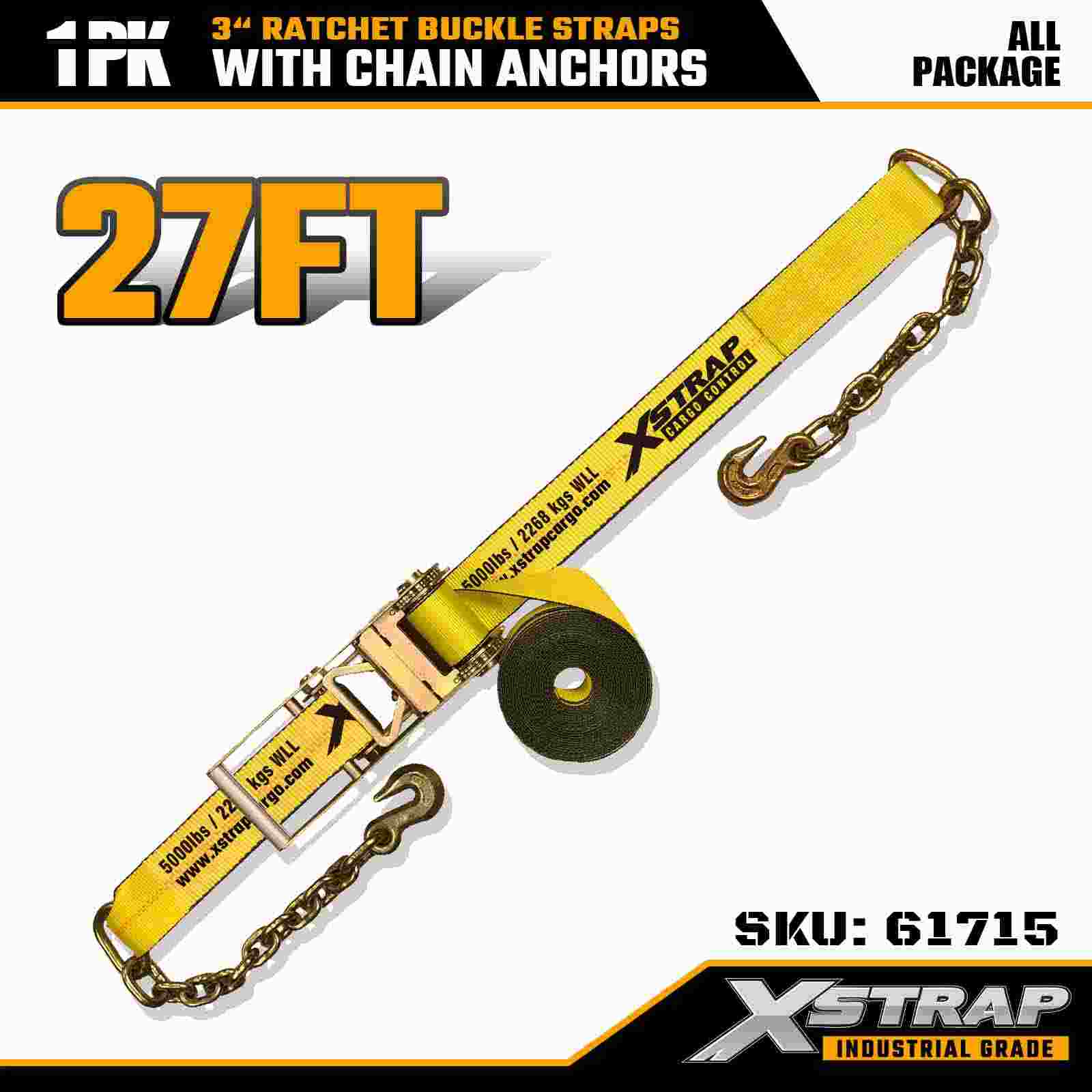 Xstrap 61715 Cinghie con fibbia a cricchetto da 3" x 27 piedi (confezione da 1) – Ancoraggi a catena, capacità di carico di 5.000 libbre, resistenza alla rottura di 15.000 libbre. Progettate per il controllo di carichi pesanti, queste cinghie combinano cinghie di livello industriale con estremità di ancoraggio della catena per la massima sicurezza in camion, rimorchi e trasporti edili.