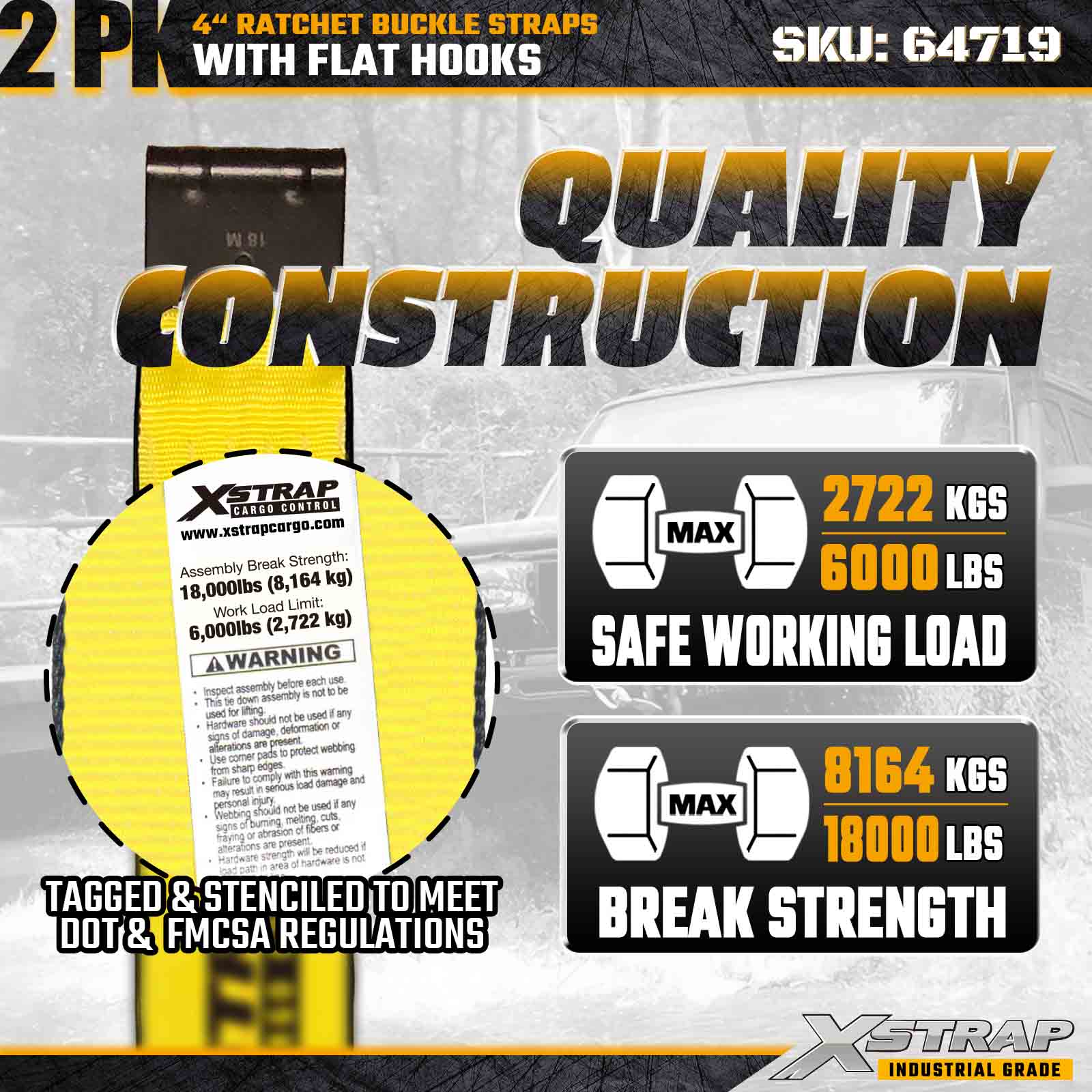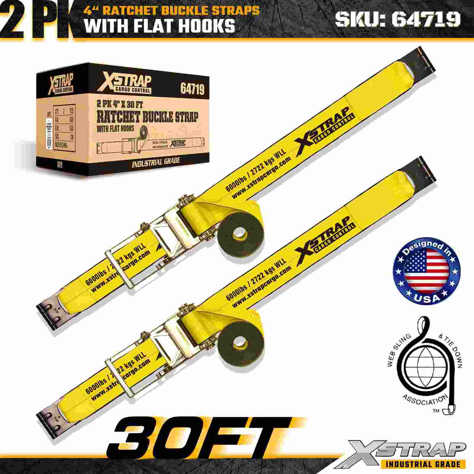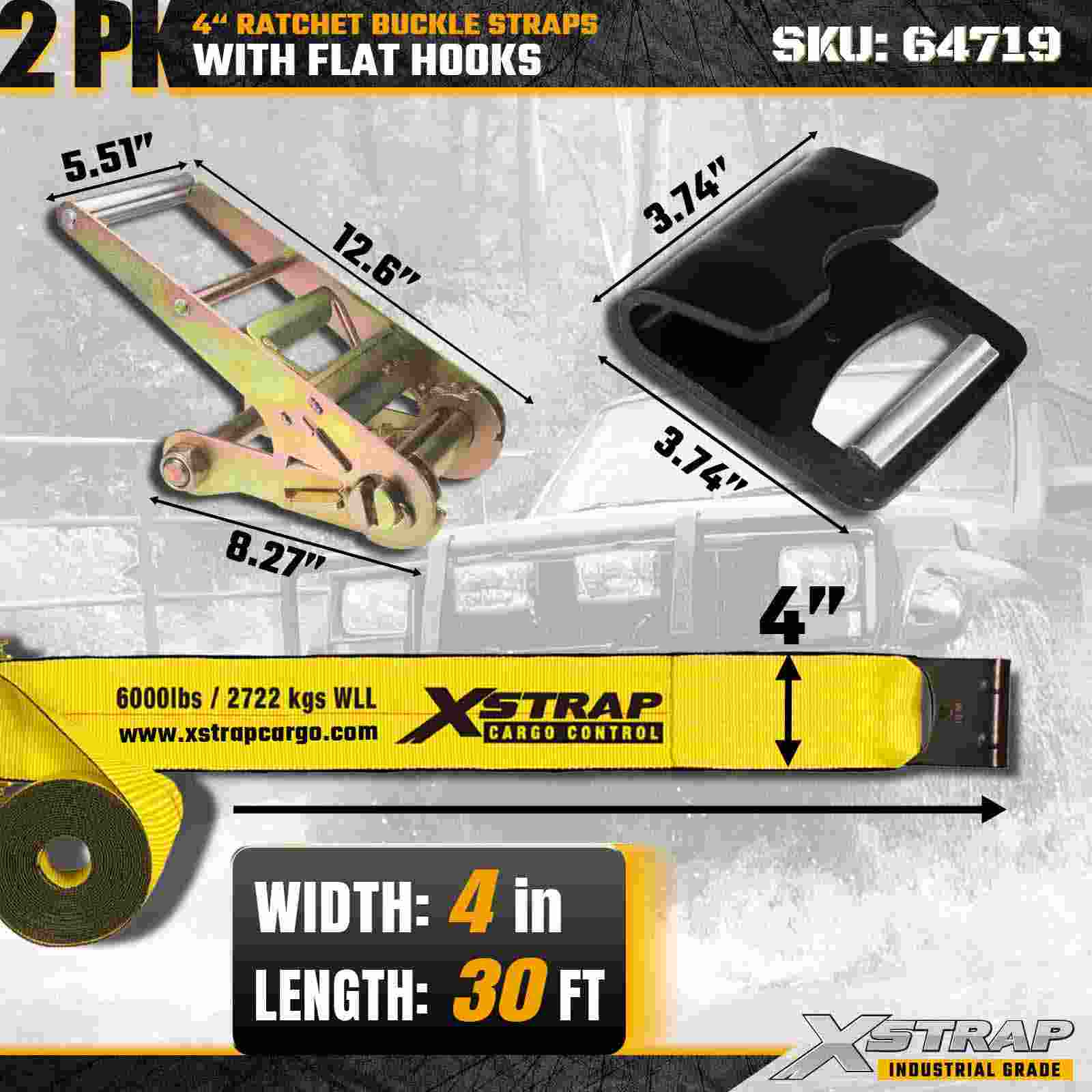 Le cinghie con fibbia a cricchetto Xstrap 64719 da 4" x 30 piedi (confezione da 2) garantiscono il fissaggio del carico per carichi pesanti con ganci piatti rinforzati e un meccanismo a cricchetto durevole. Con una resistenza alla rottura di 6.000 libbre e 18.000 libbre, sono ideali per il trasporto su pianale, il trasporto di macchinari e le applicazioni di carico industriale.