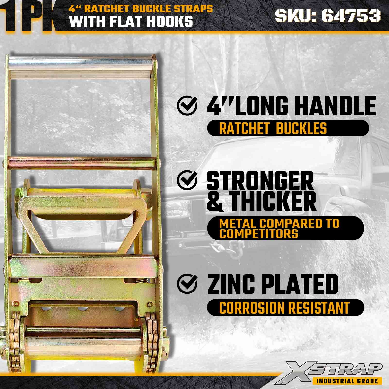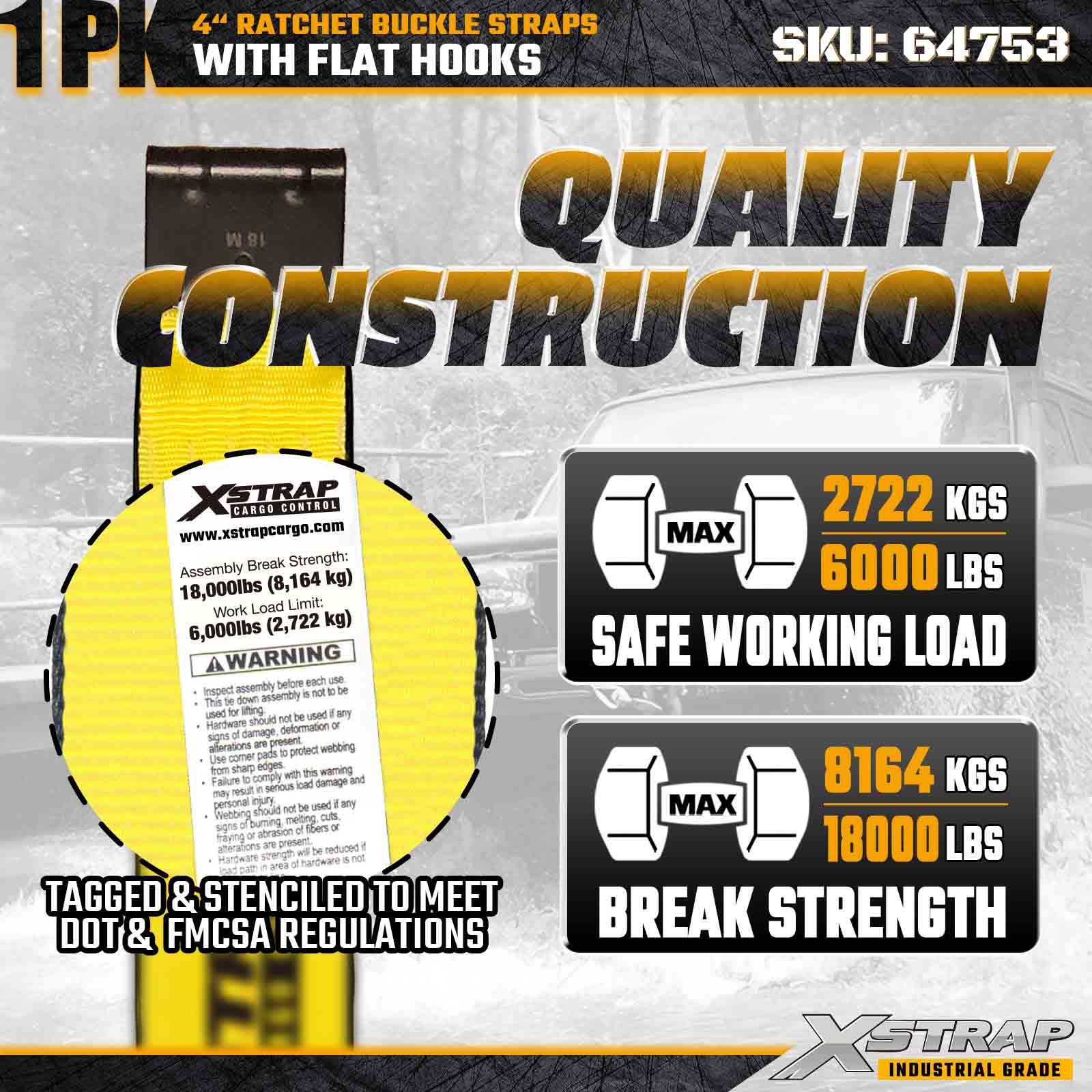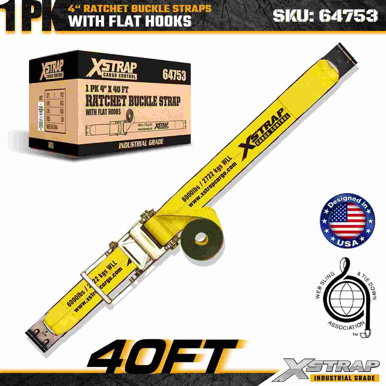 La cinghia con fibbia a cricchetto Xstrap 64753 da 4" x 40 piedi (confezione da 1) è progettata per il fissaggio di carichi pesanti, dotata di ganci piatti rinforzati e un meccanismo a cricchetto durevole. Con un limite di carico di lavoro di 6.000 libbre e una resistenza alla rottura di 18.000 libbre, questa cinghia extra lunga è ideale per il trasporto su pianale, carichi di grandi dimensioni, trasporto di macchinari e applicazioni di carico industriale.
