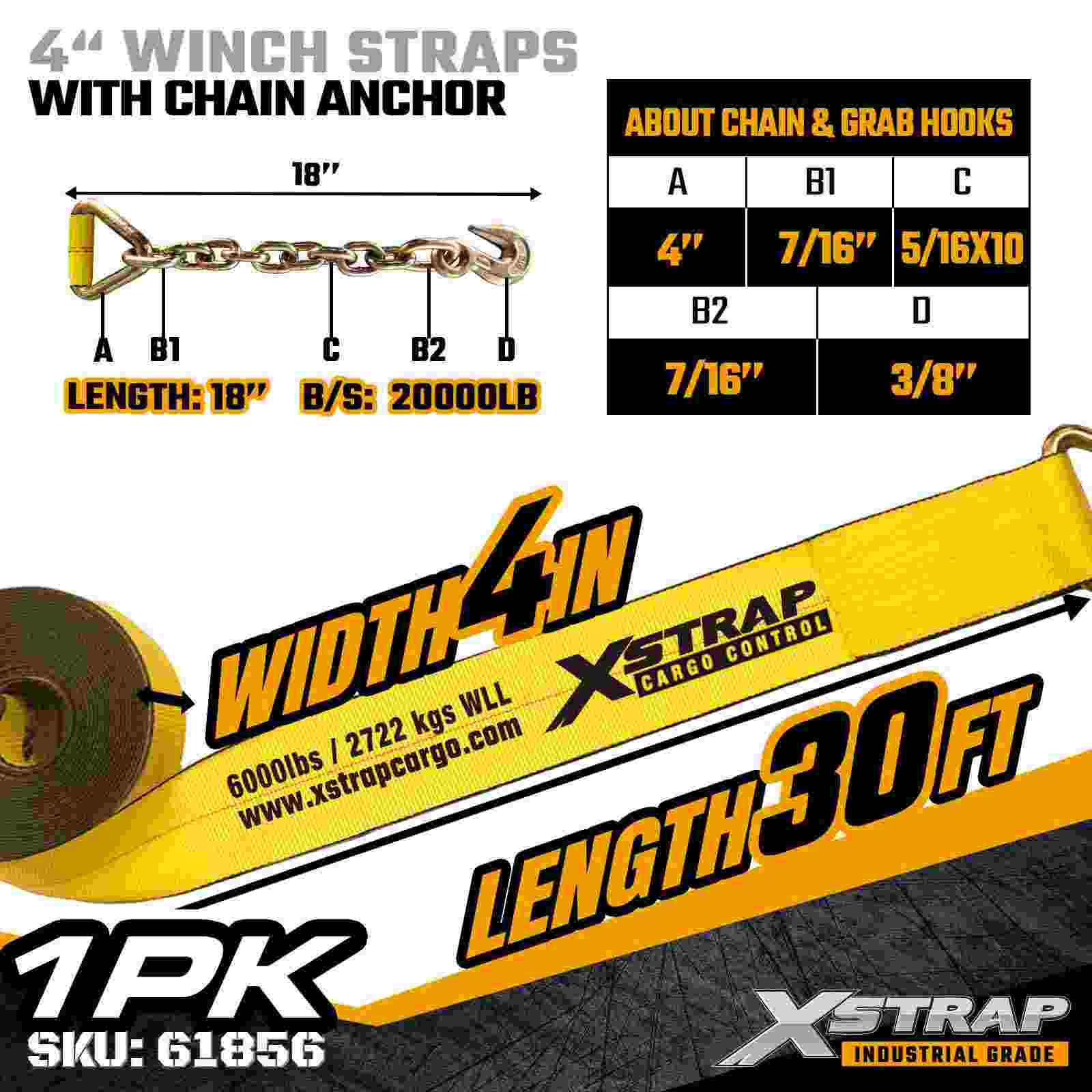 La cinghia per verricello standard Xstrap 61856 4" × 30 piedi è una cinghia di fissaggio del carico ad alta capacità e con portata estesa progettata per rimorchi a pianale e merci industriali di grandi dimensioni. Dotata di un'ancora a catena forgiata e di una cinghia in poliestere ultra larga da 4 pollici, questa cinghia per verricello da 4 pollici offre un limite di carico di lavoro di 6.000 libbre e una resistenza alla rottura di 18.000 libbre. La lunghezza estesa di 30 piedi fornisce una portata aggiuntiva per il fissaggio di ampi, carichi alti o di forma irregolare che richiedono la massima forza di tenuta e stabilità.