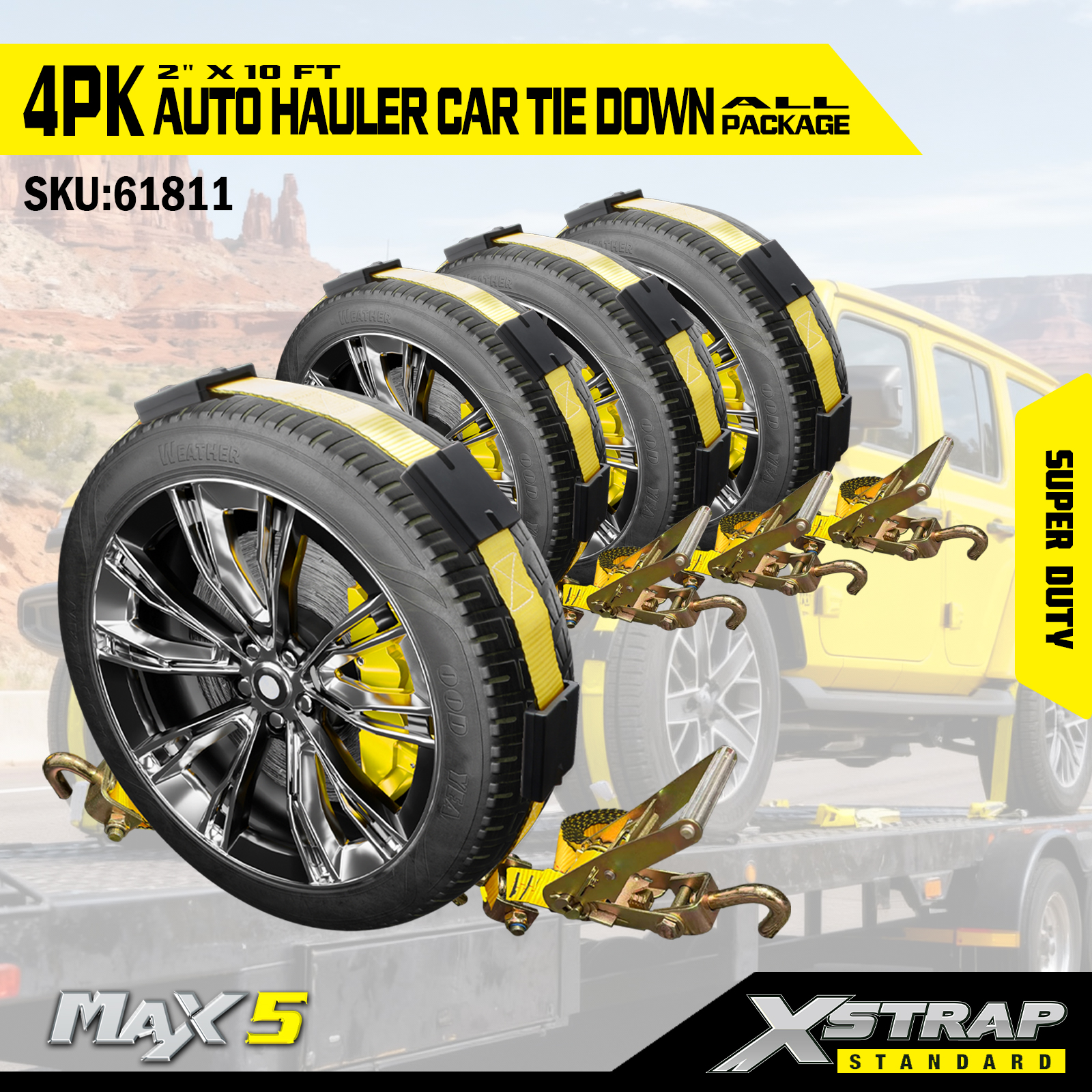 Xstrap Cinghie per trasportatore per auto Resistenti alla rottura di 6.600 libbre - Cinghie di ancoraggio per pneumatici per rimorchi, Cinghie di ancoraggio sopra le ruote con tacchetti in gomma per SUV, camion, ATV, UTV