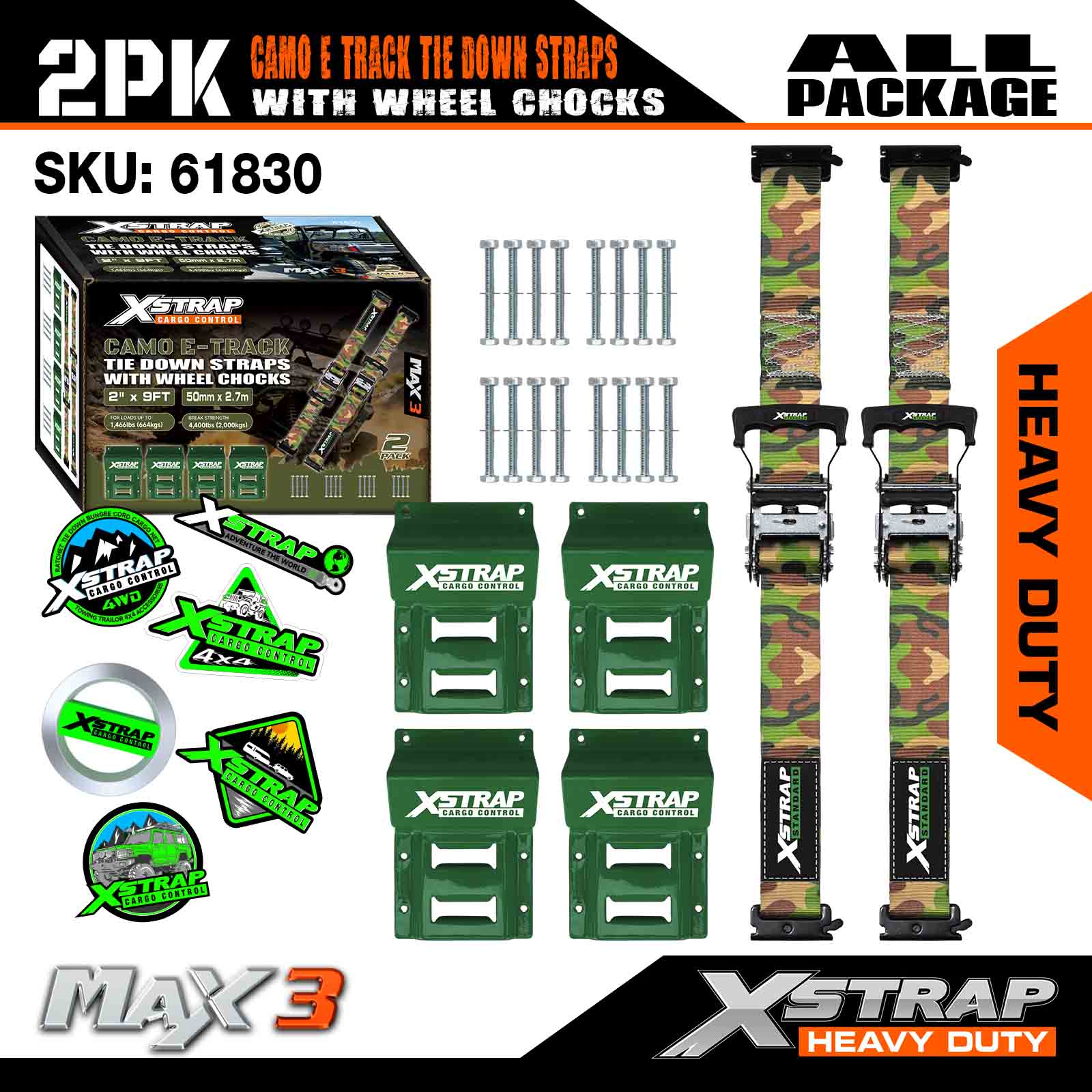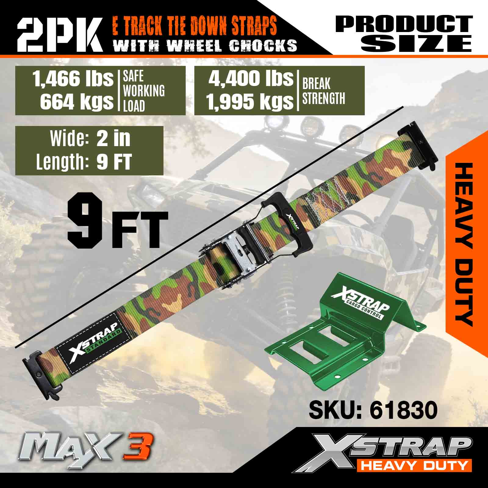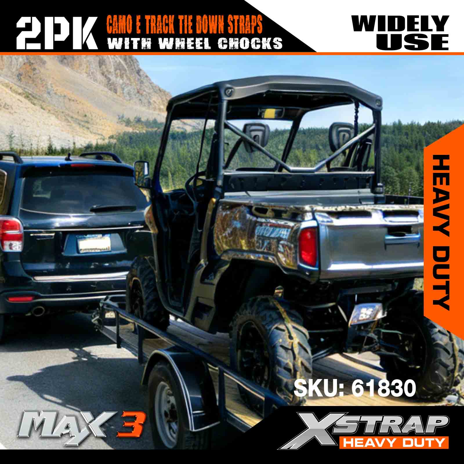 Kit di fissaggio cunei per ruote Xstrap, resistenza alla rottura di 4.400 libbre (2) cinghie a cricchetto per pneumatici per rimorchio per carichi pesanti (4) cunei per ruote - Sistema E Track per ATV, UTV, tosaerba a quattro ruote - CAMO