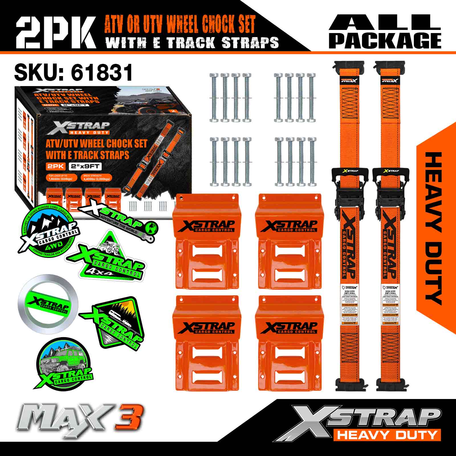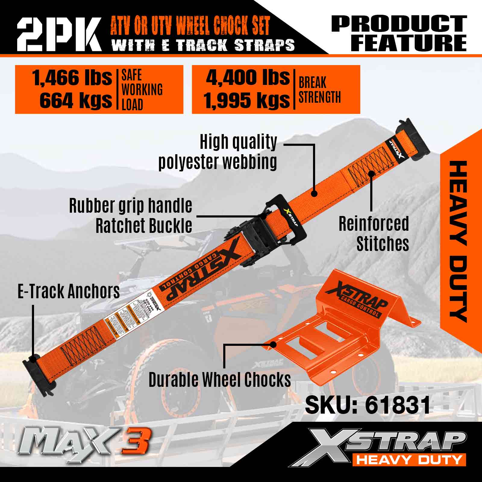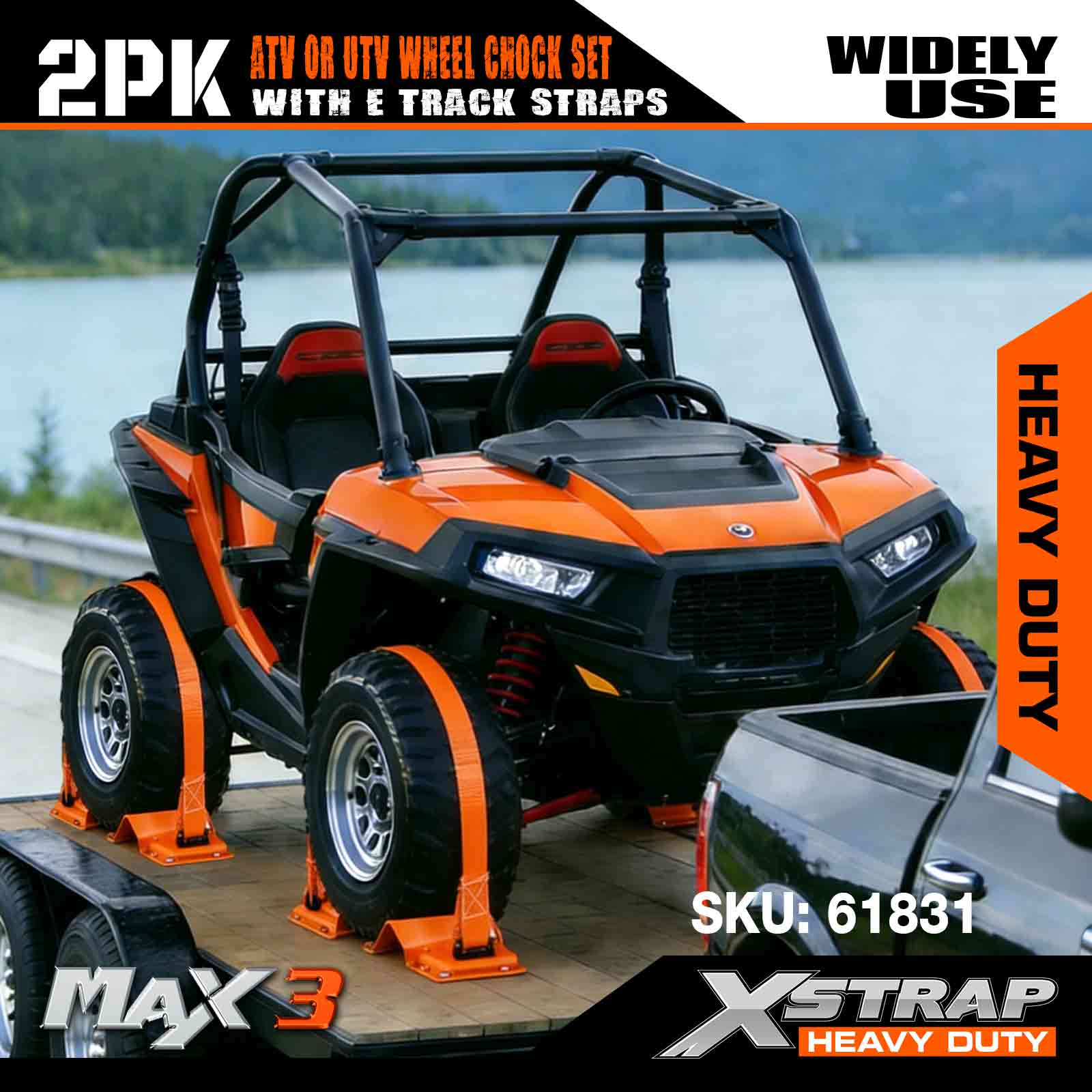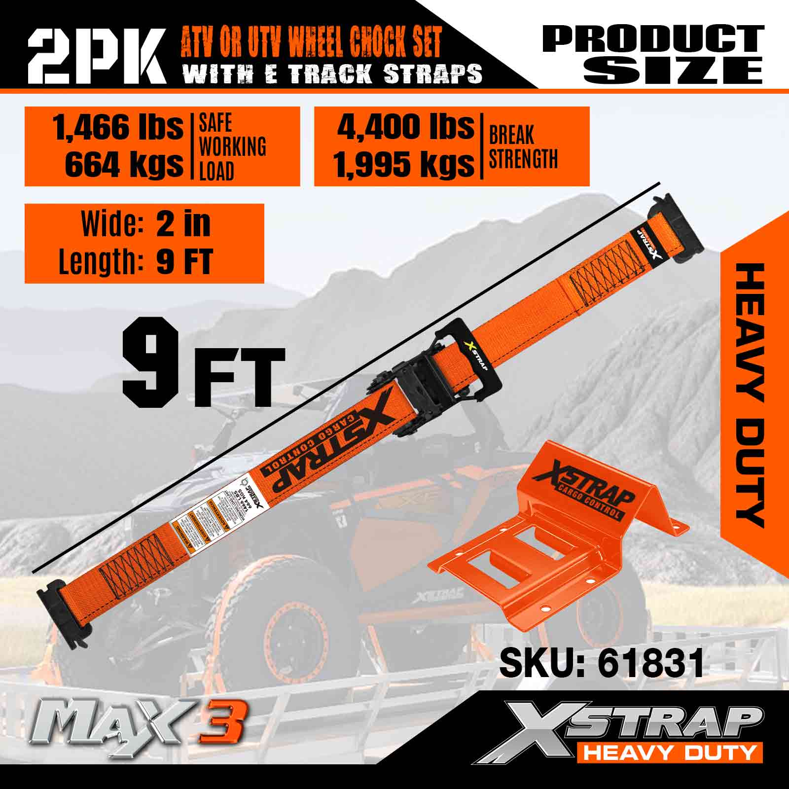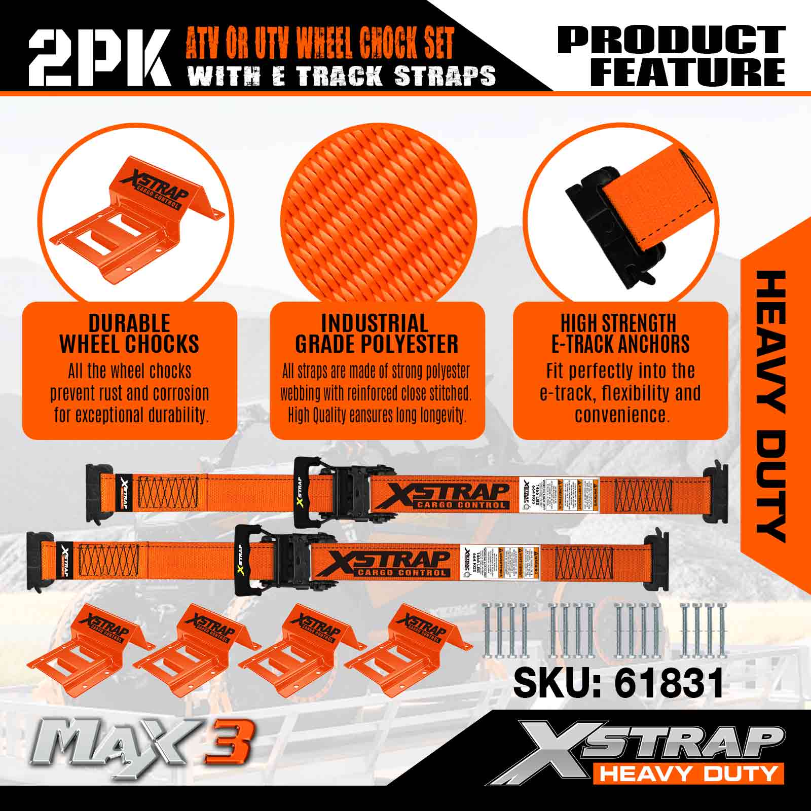 Kit di ancoraggio per cunei per ruote Xstrap UTV, resistenza alla rottura di 4.400 libbre (4) cinghie a cricchetto per pneumatici per rimorchio per carichi pesanti (8) cunei per ruote - Sistema di cingoli E per ATV, UTV, tosaerba a quattro ruote - Arancione