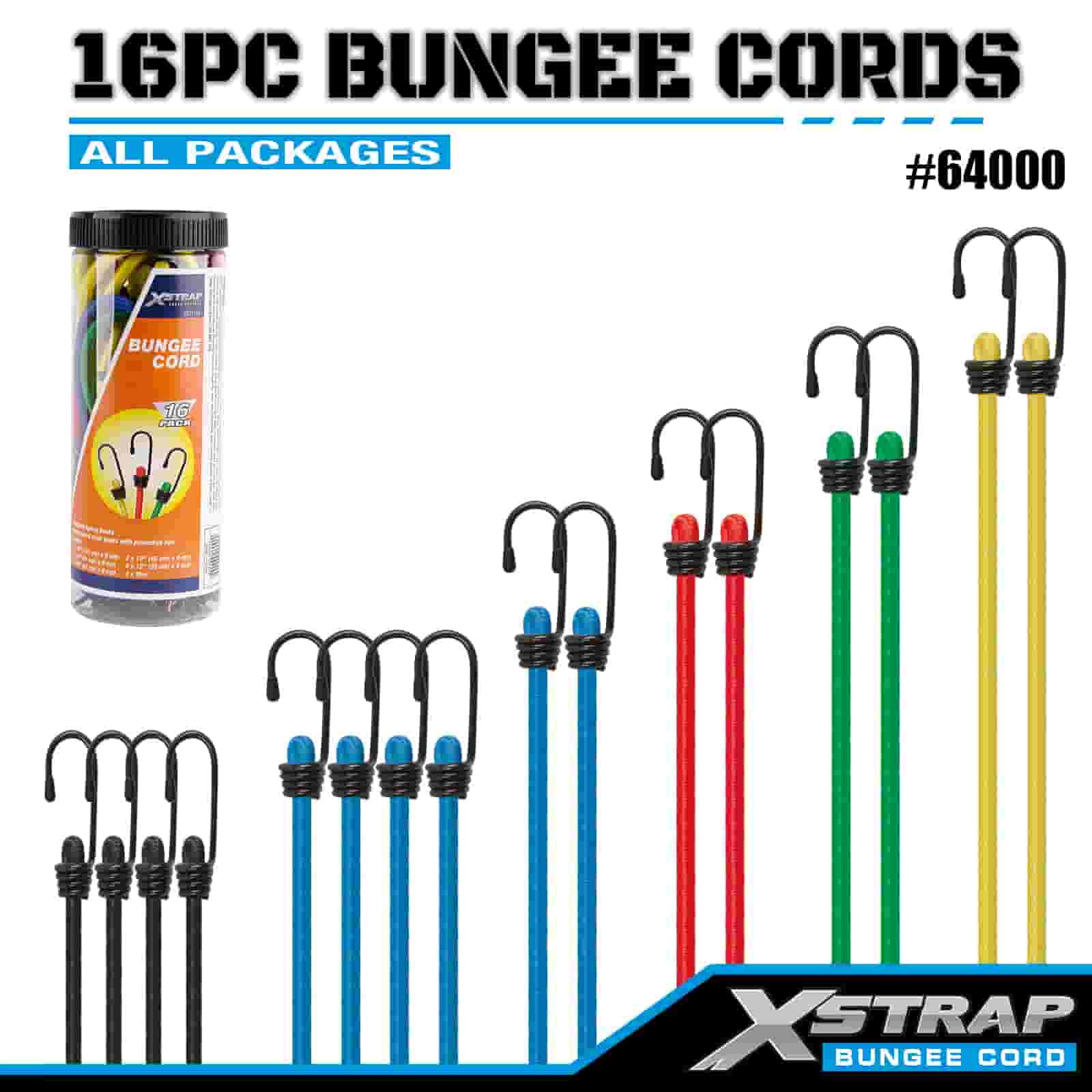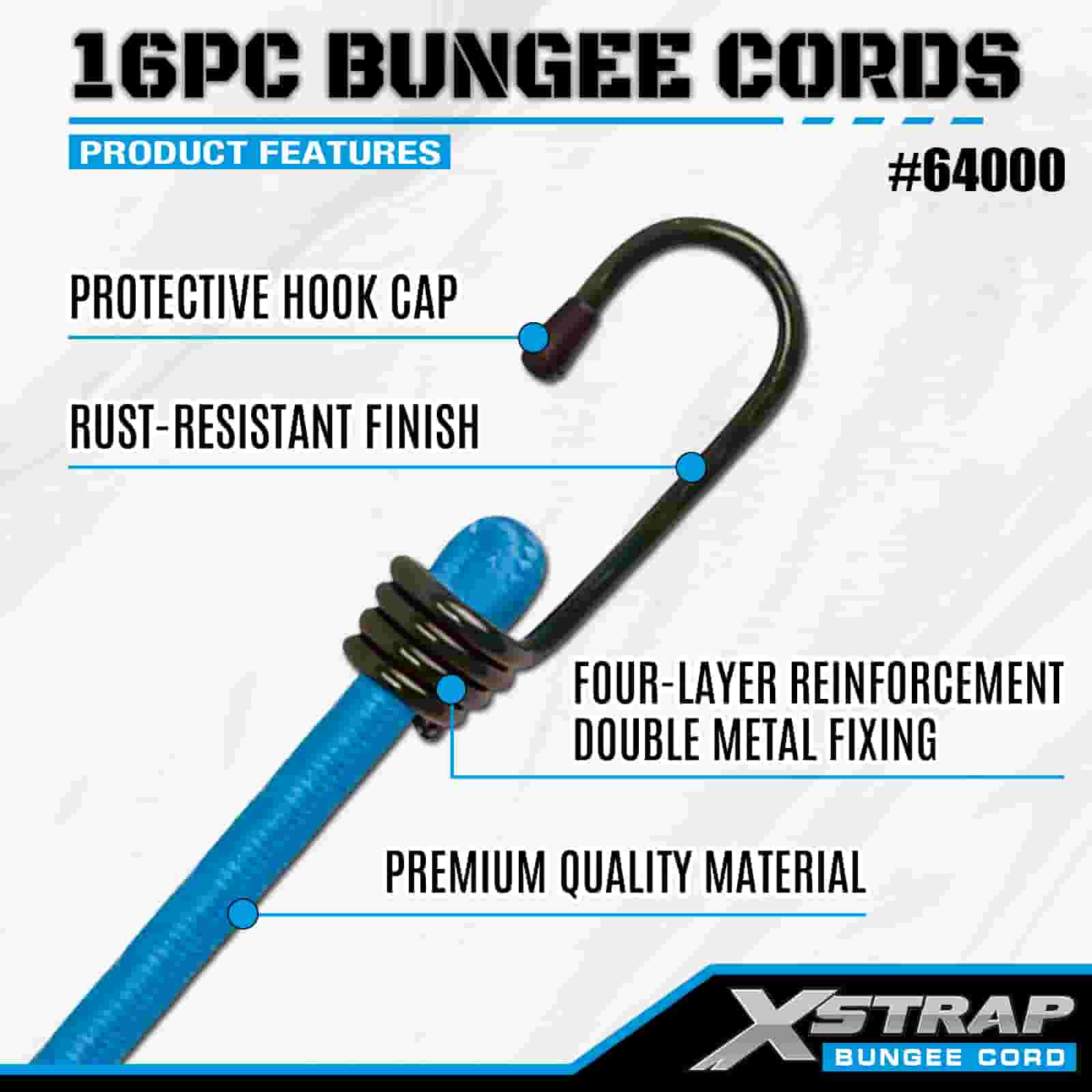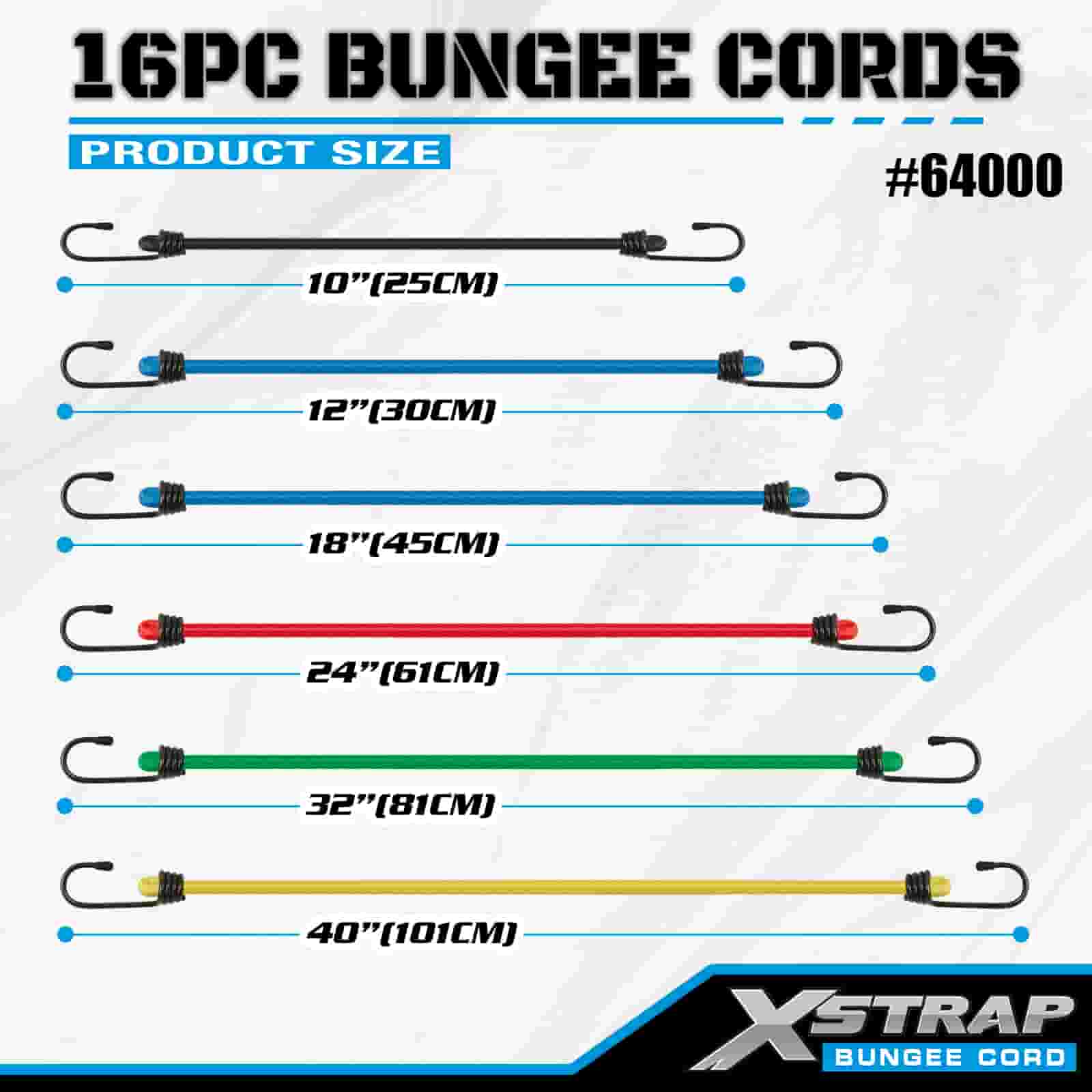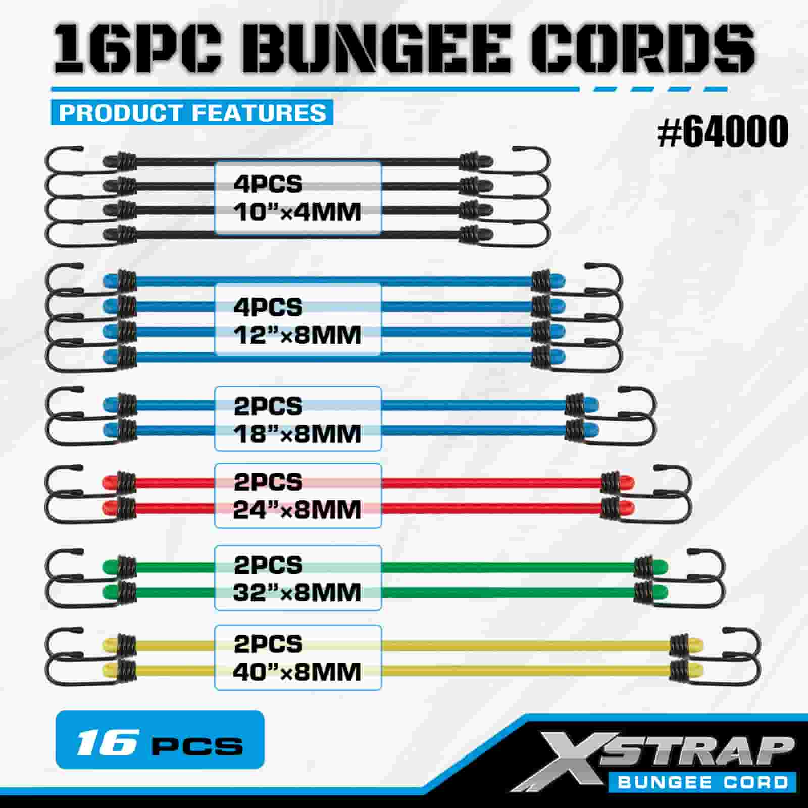 Set corde elastiche Xstrap 16PK 16PK 8 mm x 12"/18"/24"/ 32"/40"; MINI Bungee 4 mm x 10", resistenza alla rottura di 44-55 libbre con ganci in acciaio rivestiti in vinile con punte protettive e ganci a molla standard.