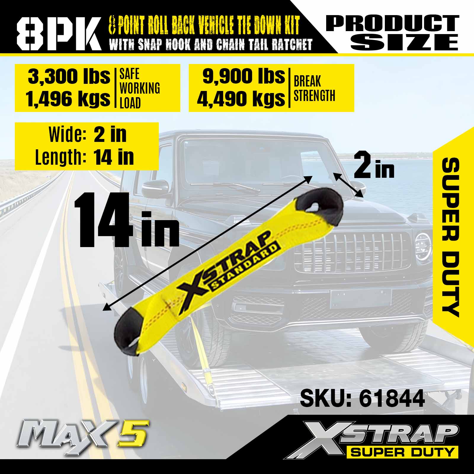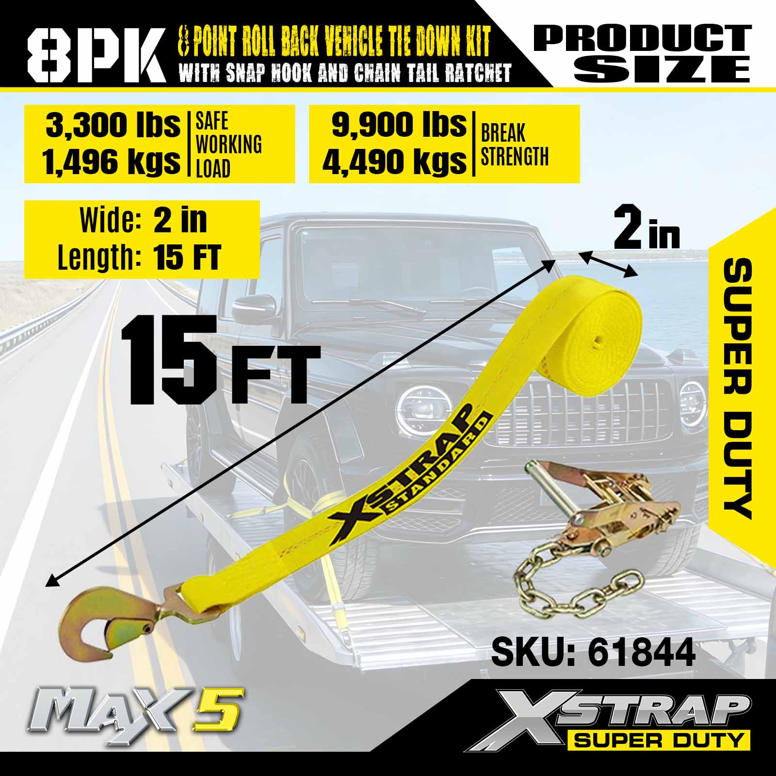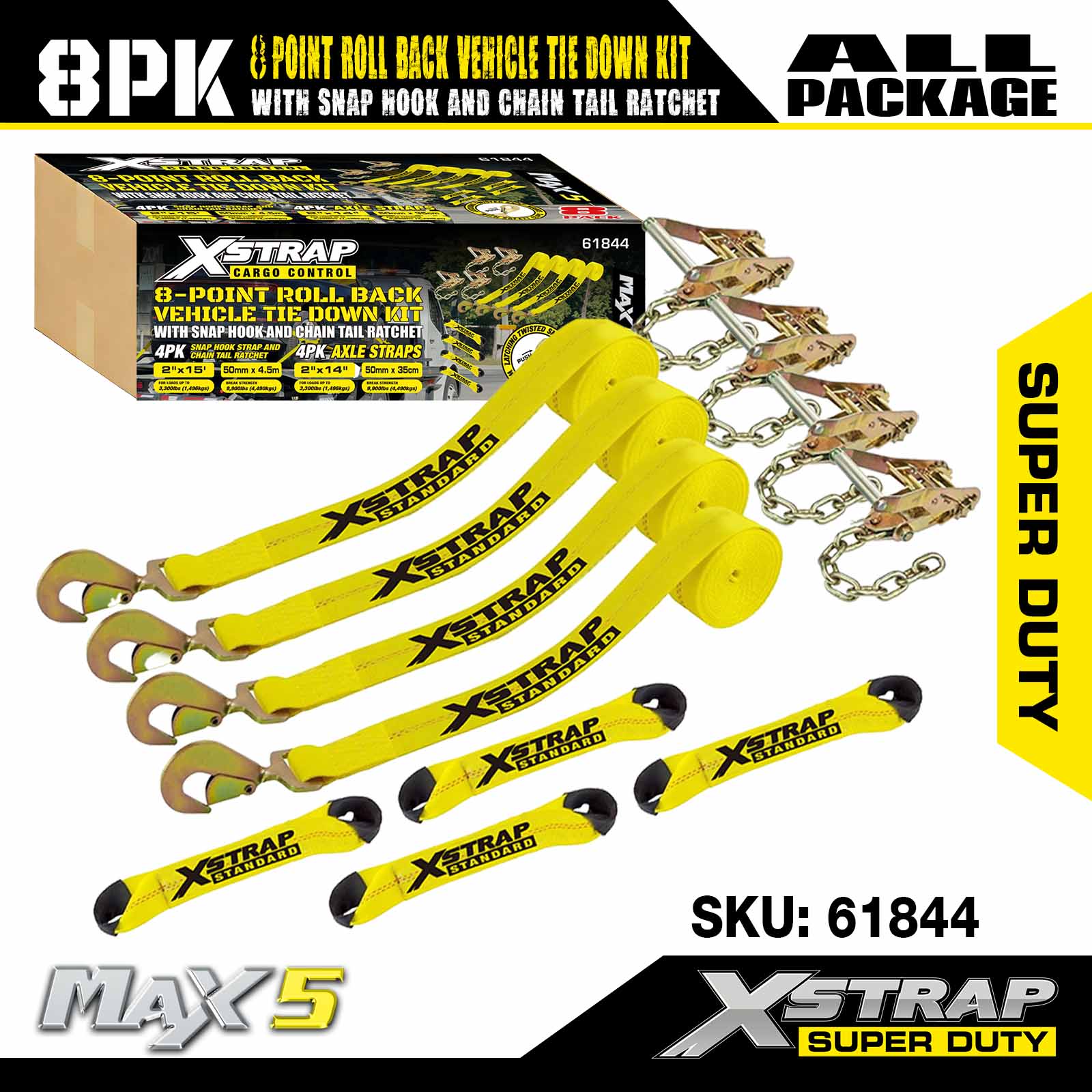 Xstrap Kit di ancoraggio per veicolo con rollback a 8 punti con moschettoni e cricchetto a catena su entrambe le estremità - Set di 4 - Giallo classico