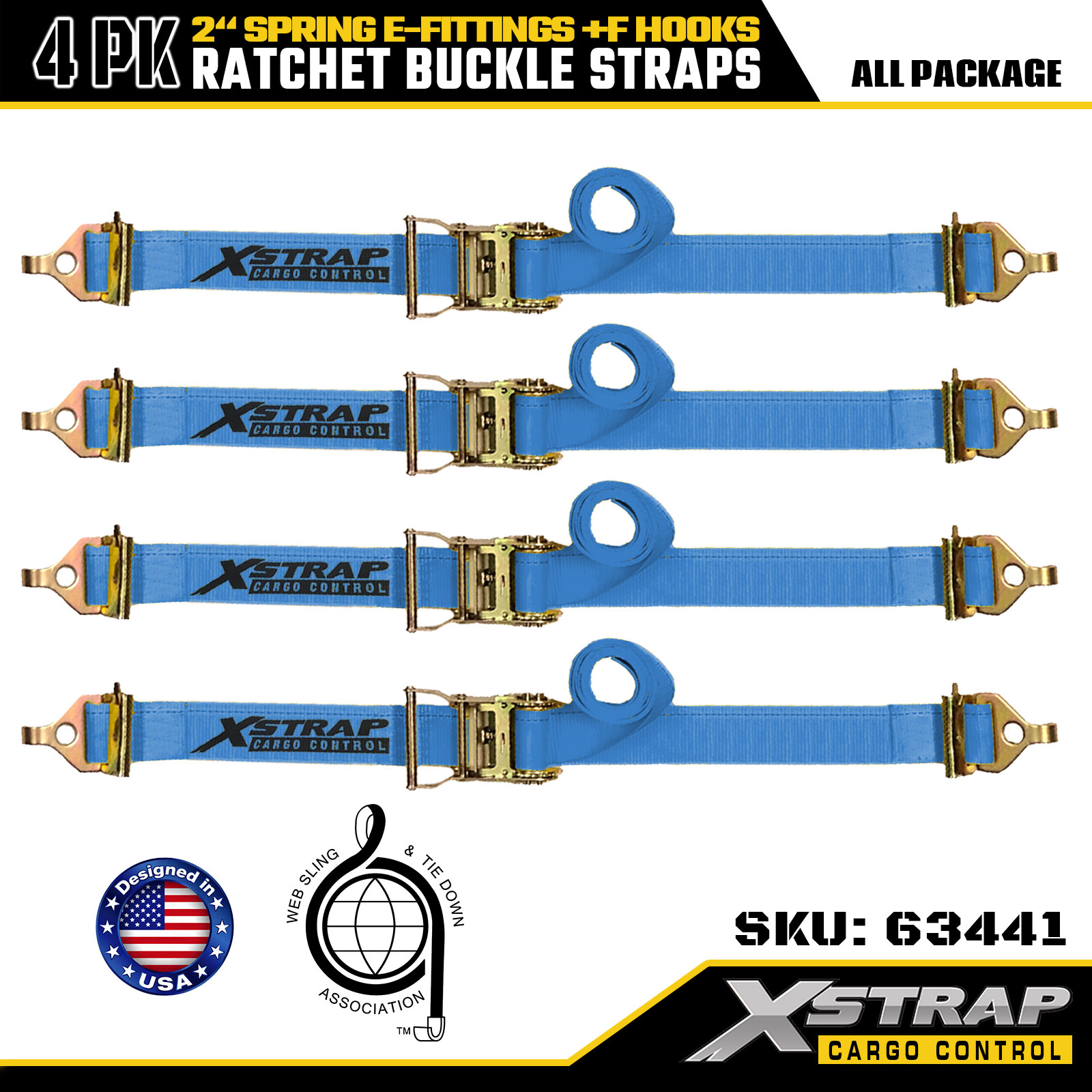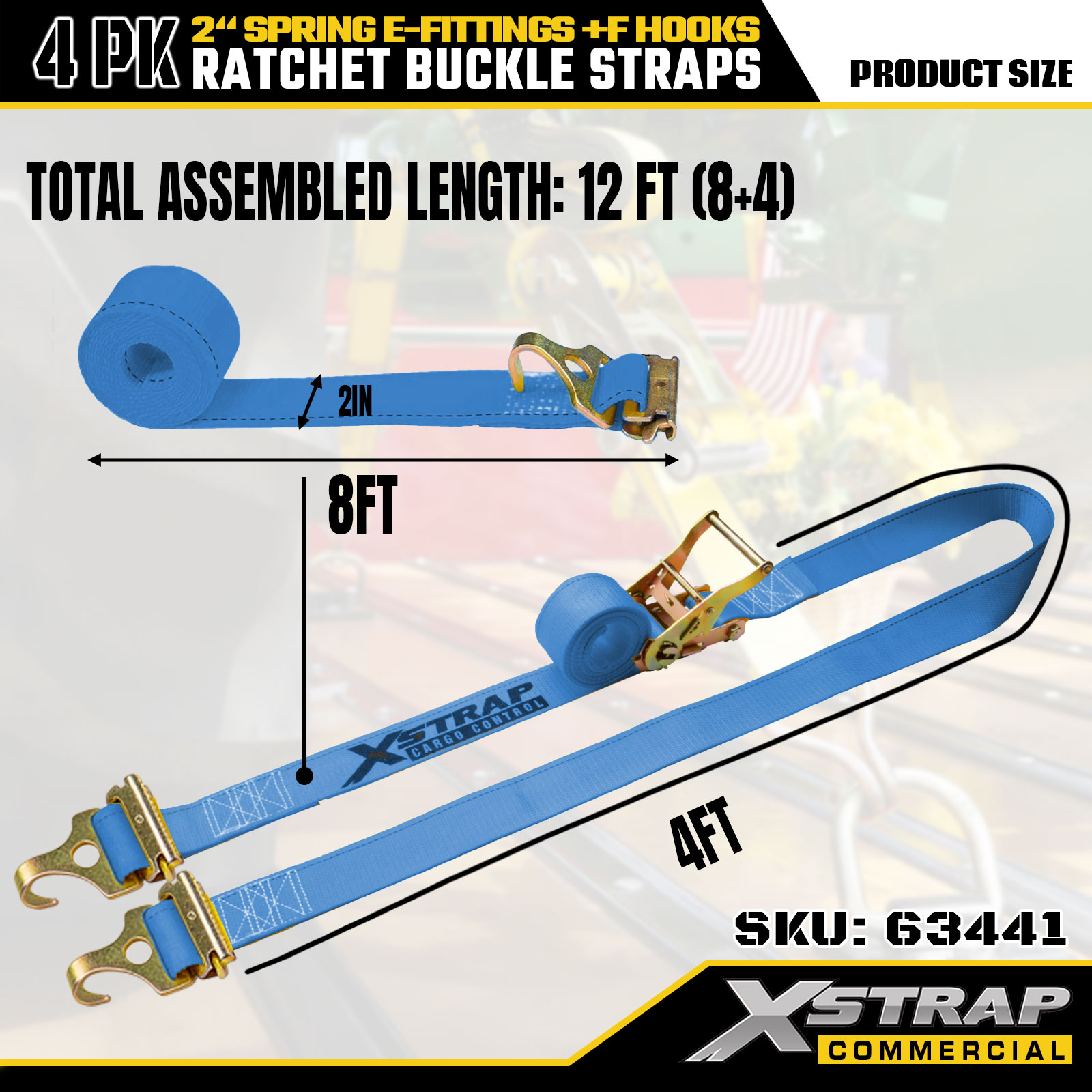 Xstrap Confezione da 4 Cinghie di ancoraggio a cricchetto 2"x12' in poliestere con raccordi a molla e ganci a F, 733 libbre di SWL e 332 libbre di resistenza alla rottura per camion, traslochi e trasporto di merci generiche