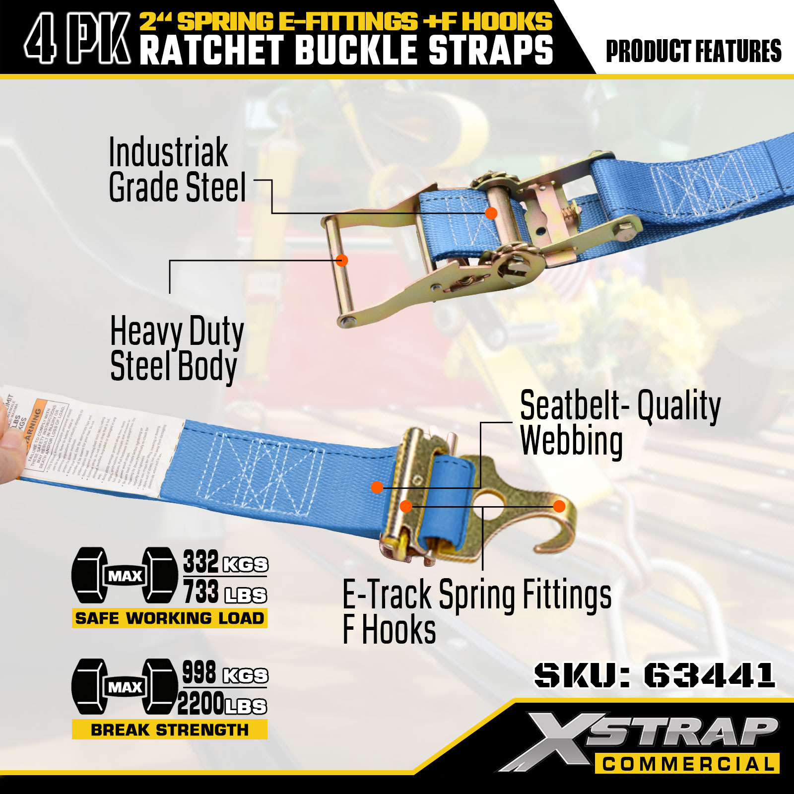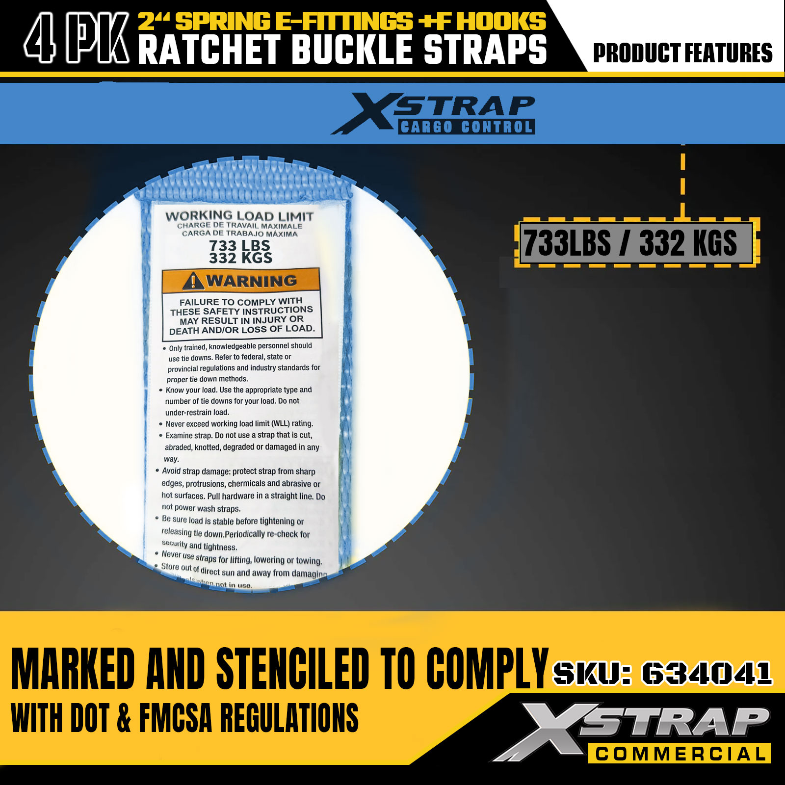 - Indicatori di sicurezza leggibili: ogni cinghia è chiaramente etichettata con il carico di lavoro sicuro (SWL) di 733 libbre e la capacità di carico massima di 332 libbre, offrendo istruzioni di sicurezza essenziali per un'applicazione corretta e sicura.