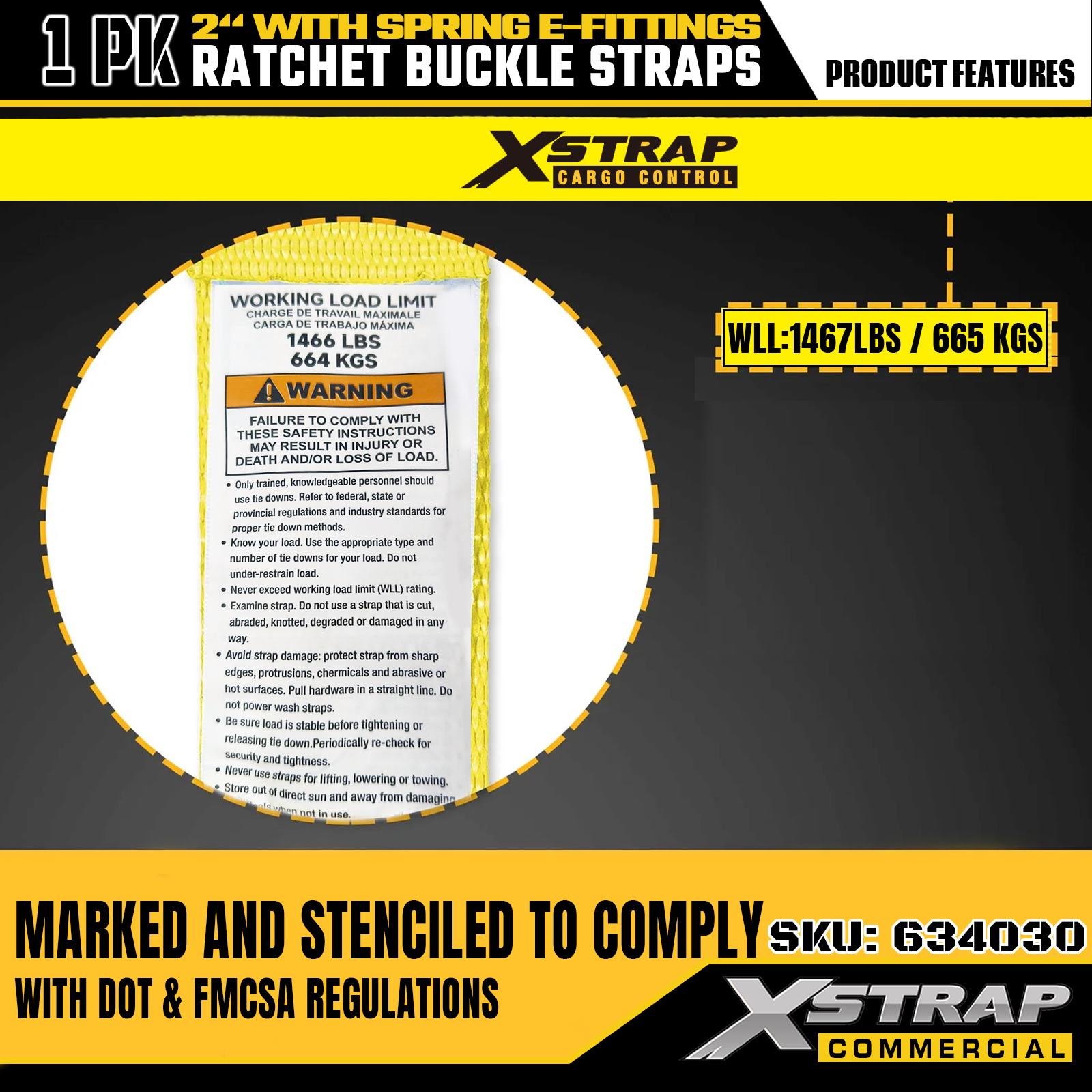 - Segnali di sicurezza chiari: ogni cinghia è chiaramente etichettata con il carico di lavoro sicuro (SWL) di 1467 libbre e la resistenza massima alla rottura di 4401 libbre, fornendo informazioni di sicurezza essenziali per garantire un utilizzo corretto e sicuro negli scenari di controllo, spostamento e trasporto del carico.
