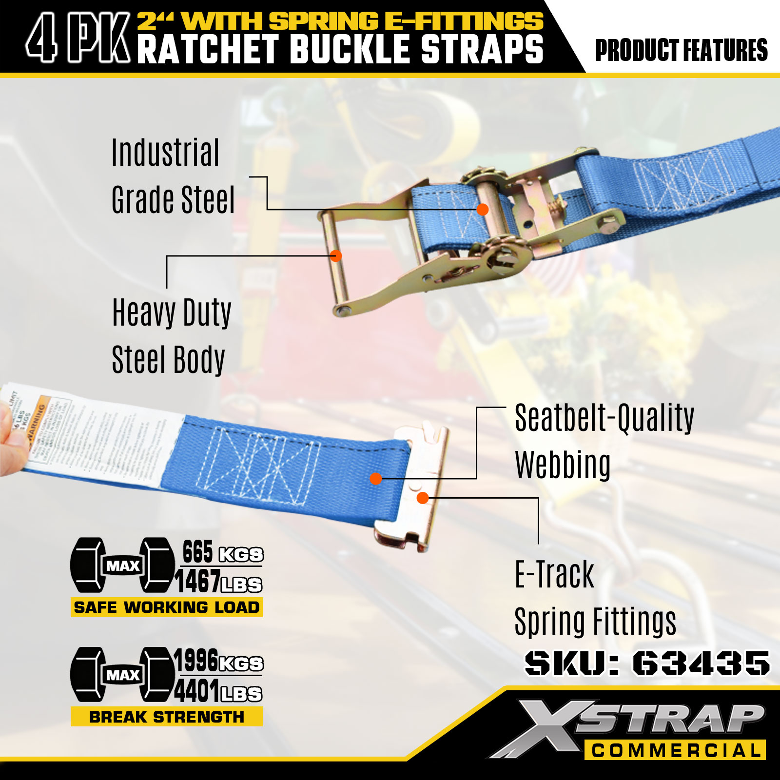 Xstrap Confezione da 4 Cinghie di Ancoraggio a Cricchetto, Cinghie di Fissaggio del Carico in Poliestere da 2"x12' con Raccordi E a Molla, Carico di Lavoro Sicuro (SWL) di 1467 libbre e Resistenza alla Rottura di 4401 libbre, per Camion, Tosaerba, ATV