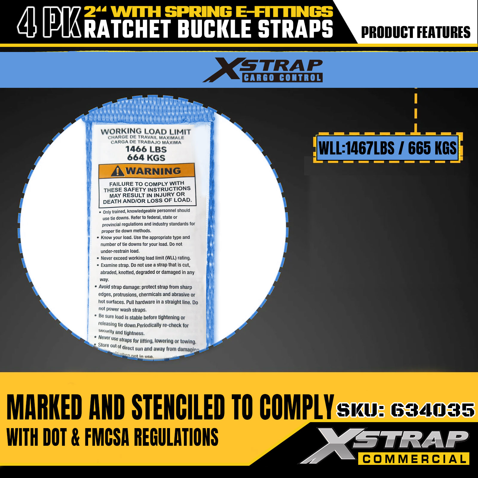 - Etichette chiare SWL e resistenza alla rottura per la prevenzione del sovraccarico: ogni cinghia è chiaramente etichettata con un carico di lavoro sicuro (SWL) di 1467 libbre e una resistenza alla rottura massima di 4401 libbre, fornendo informazioni di sicurezza essenziali per prevenire il sovraccarico.