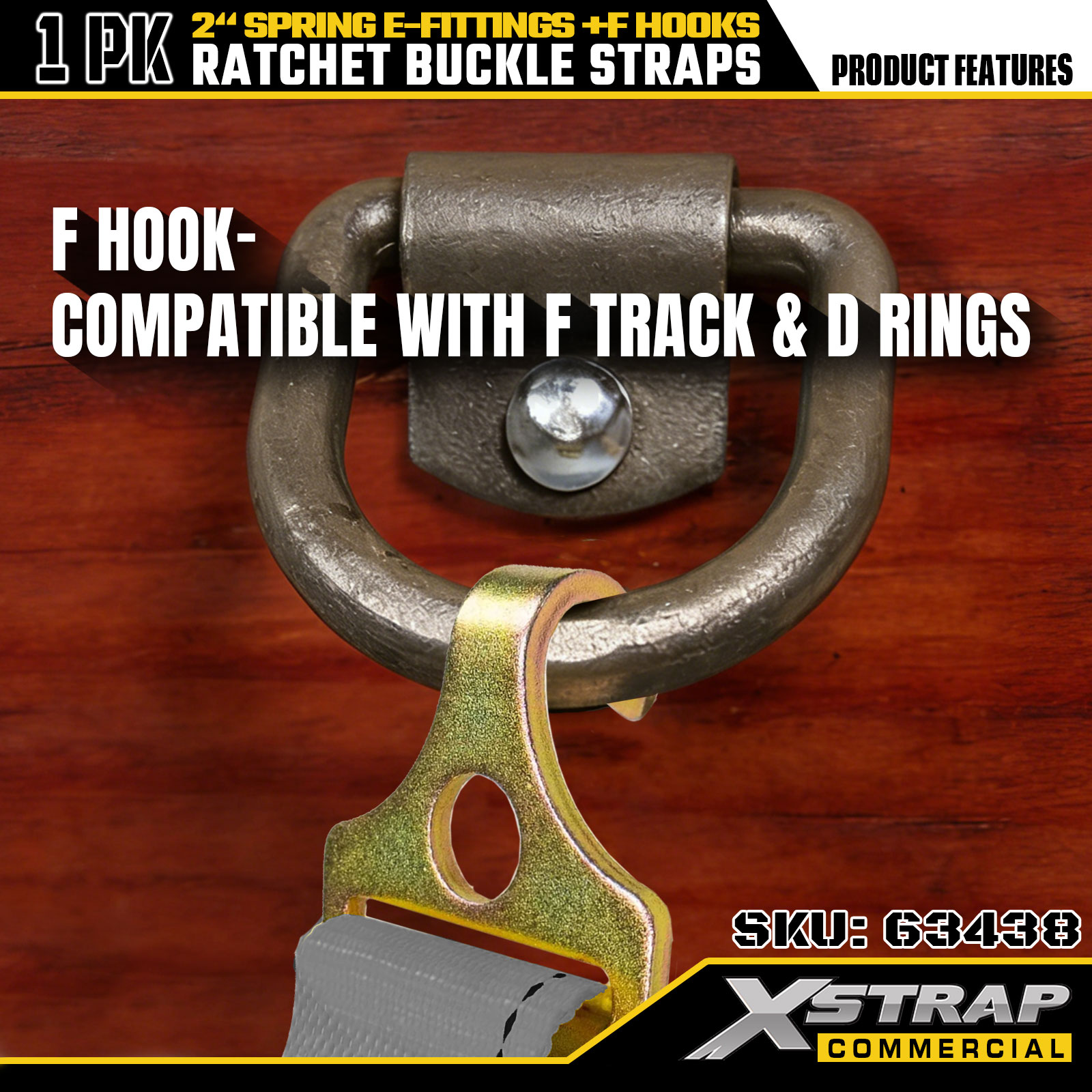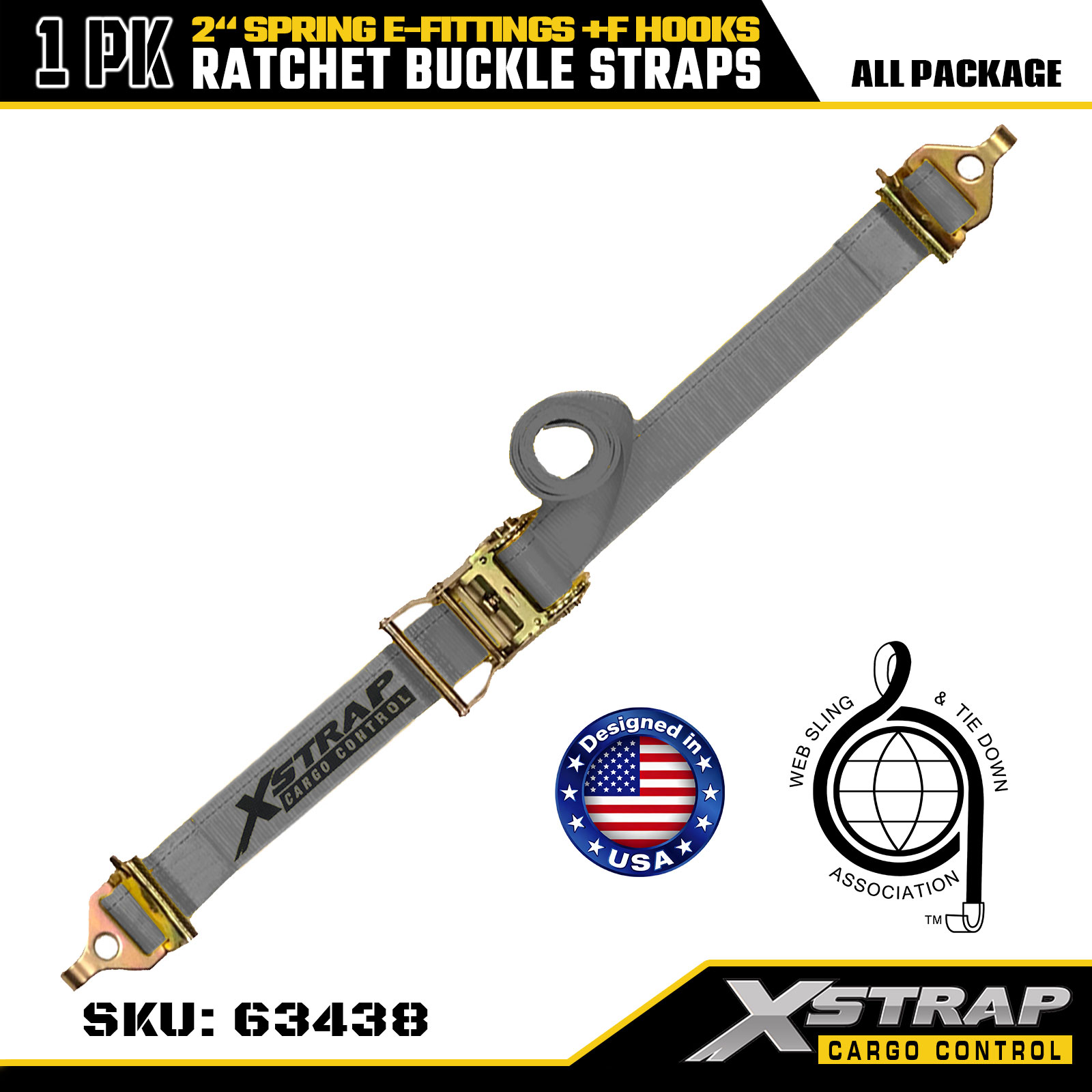 Cinghie a cricchetto 1 pezzo da 2" x 16' con raccordi a E a molla e ganci a F