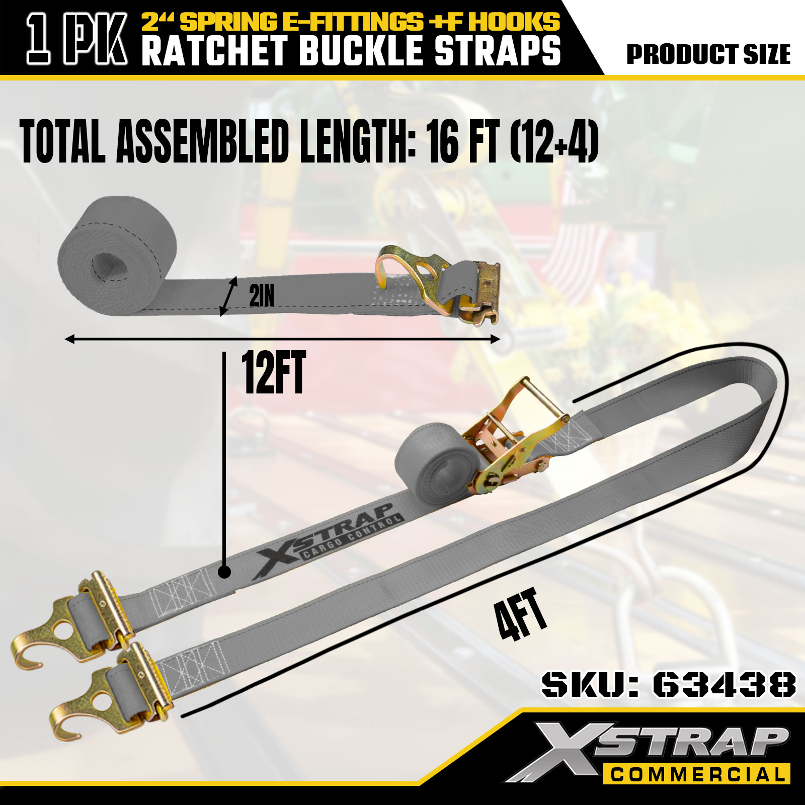 Xstrap 1 confezione di cinghie di ancoraggio a cricchetto 2" x 16' in poliestere con raccordi a molla e ganci a F, 733 libbre di SWL e 332 libbre di resistenza alla rottura per camion, traslochi, trasporto di merci generiche