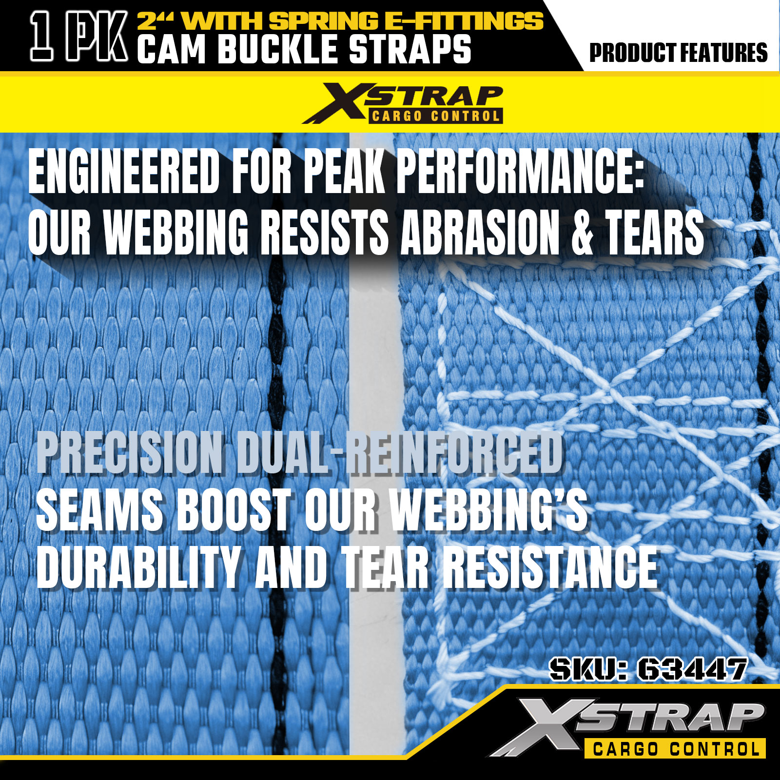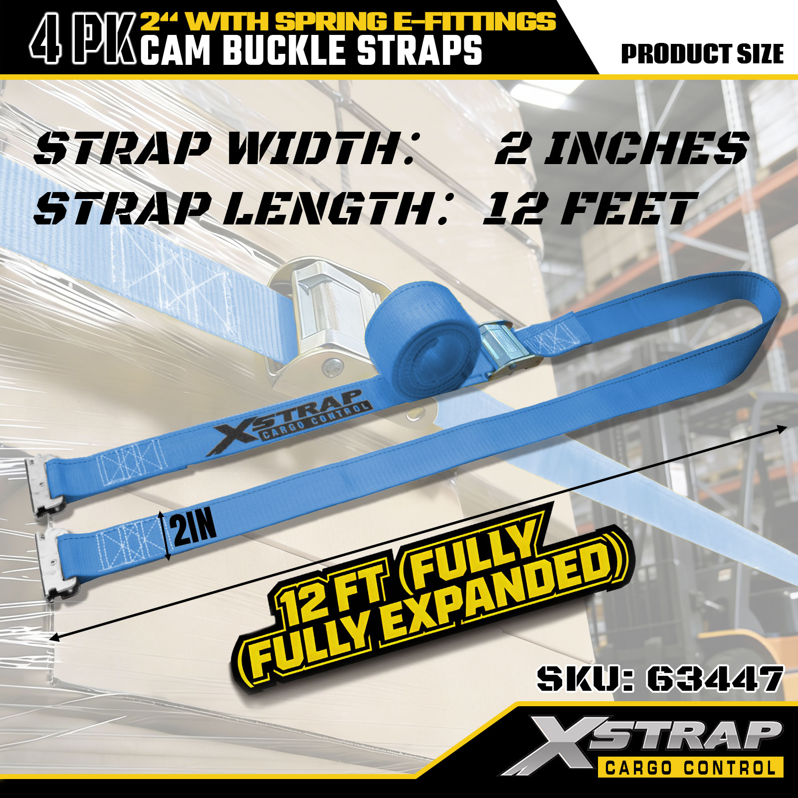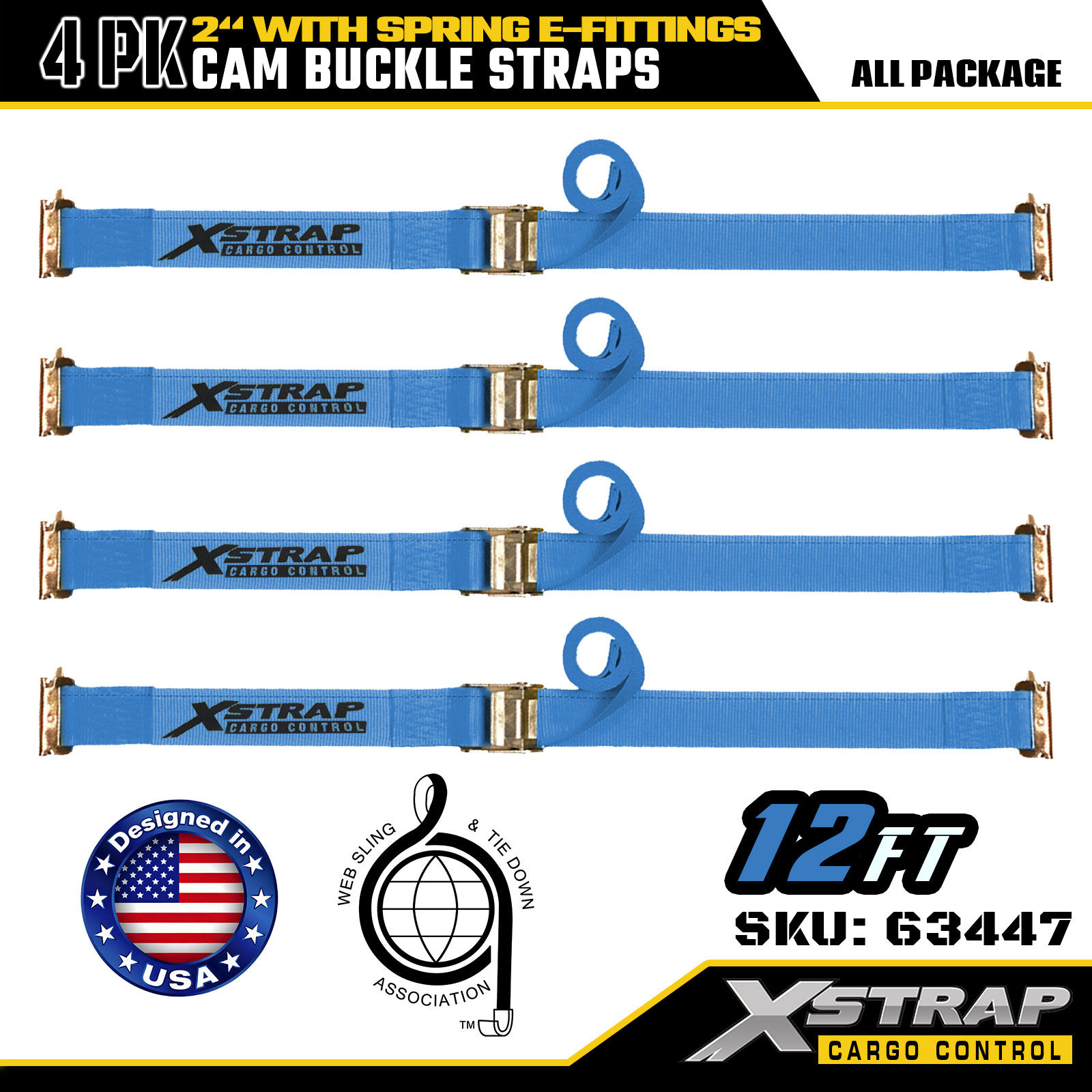 Xstrap 63447 Confezione da 4 cinghie a cricchetto blu da 2" x 12' con raccordi a E a molla e ganci a F, 733 libbre di SWL e 332 libbre di resistenza alla rottura per il controllo del carico, lo spostamento e il trasporto