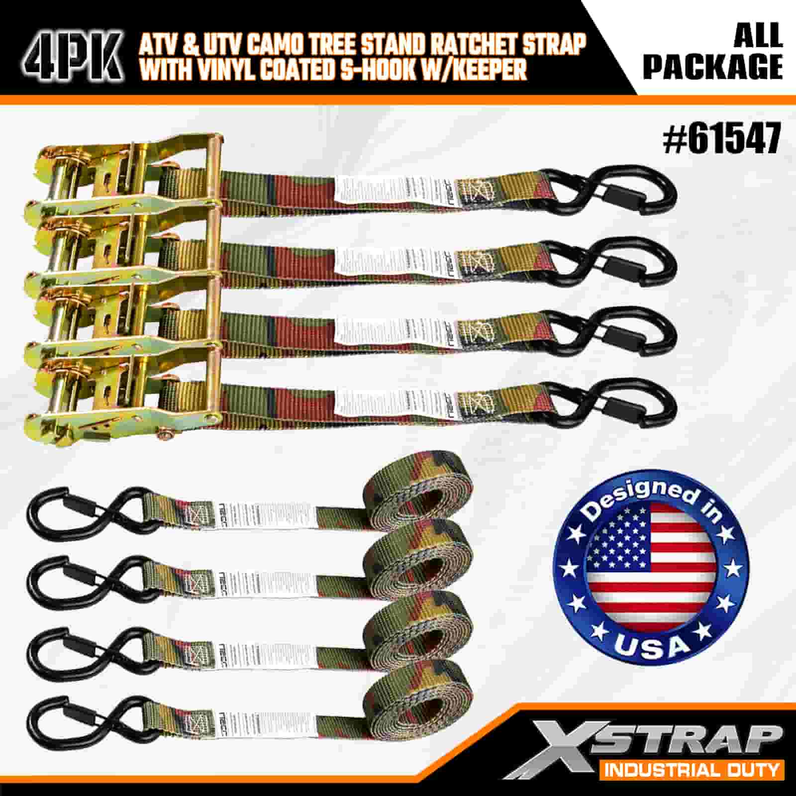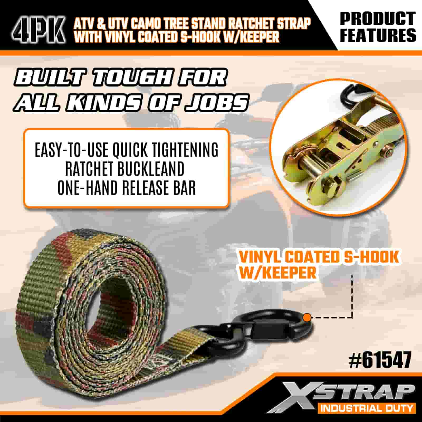 Xstrap 4PK Cinghia a cricchetto con ganci di sicurezza a S rivestiti in vinile, cinghia a cricchetto in poliestere da 1" x 8', Cinghie di fissaggio per carico con capacità di 400 libbre con ganci di sicurezza a S per rimorchi, rimorchi a pianale piatto, barche da sci, piccole auto, attrezzature pesanti.