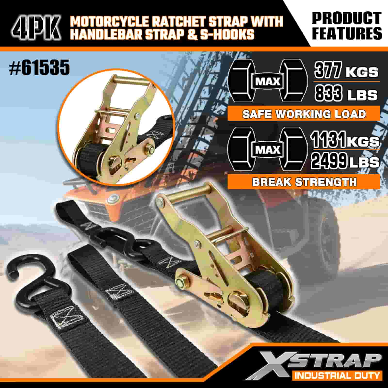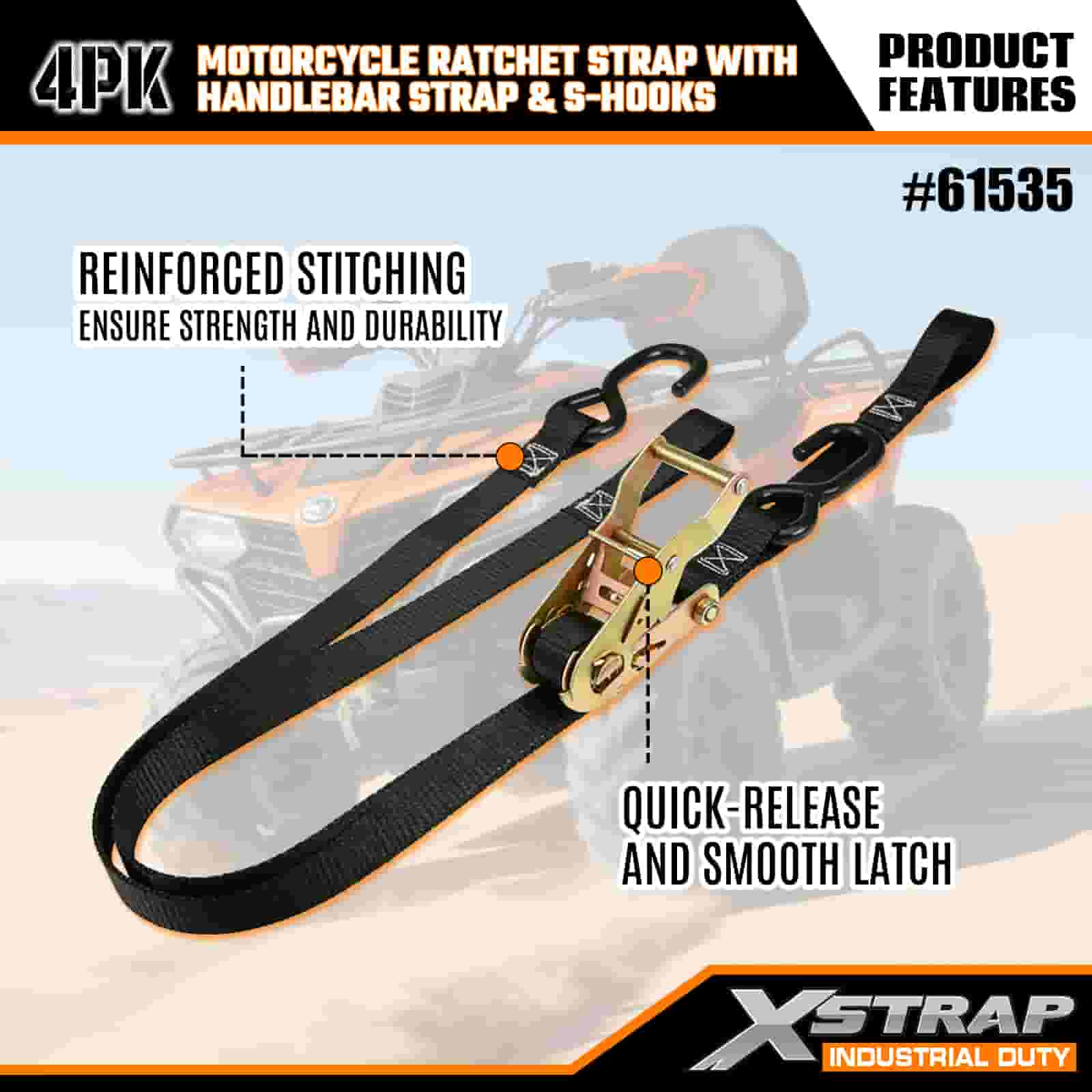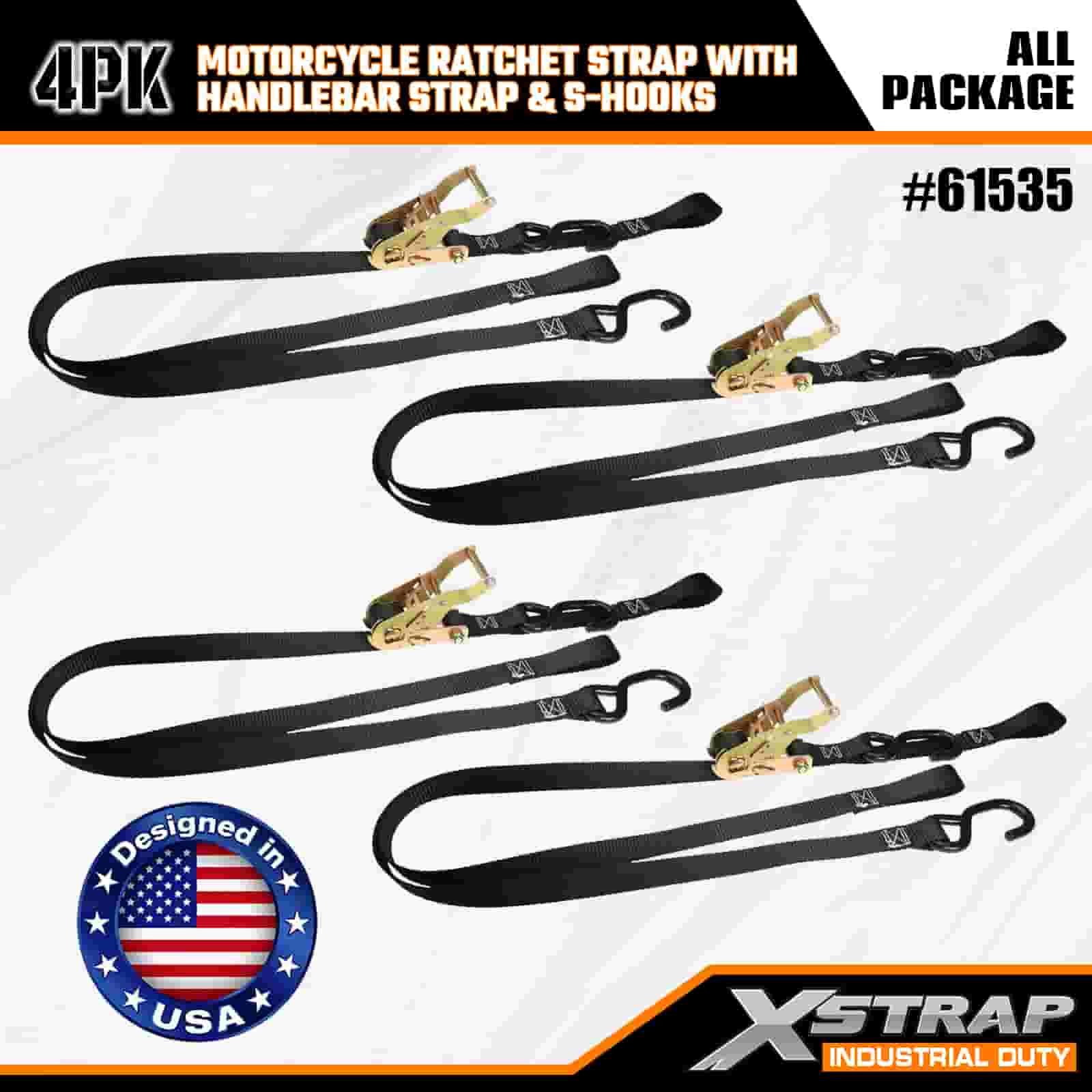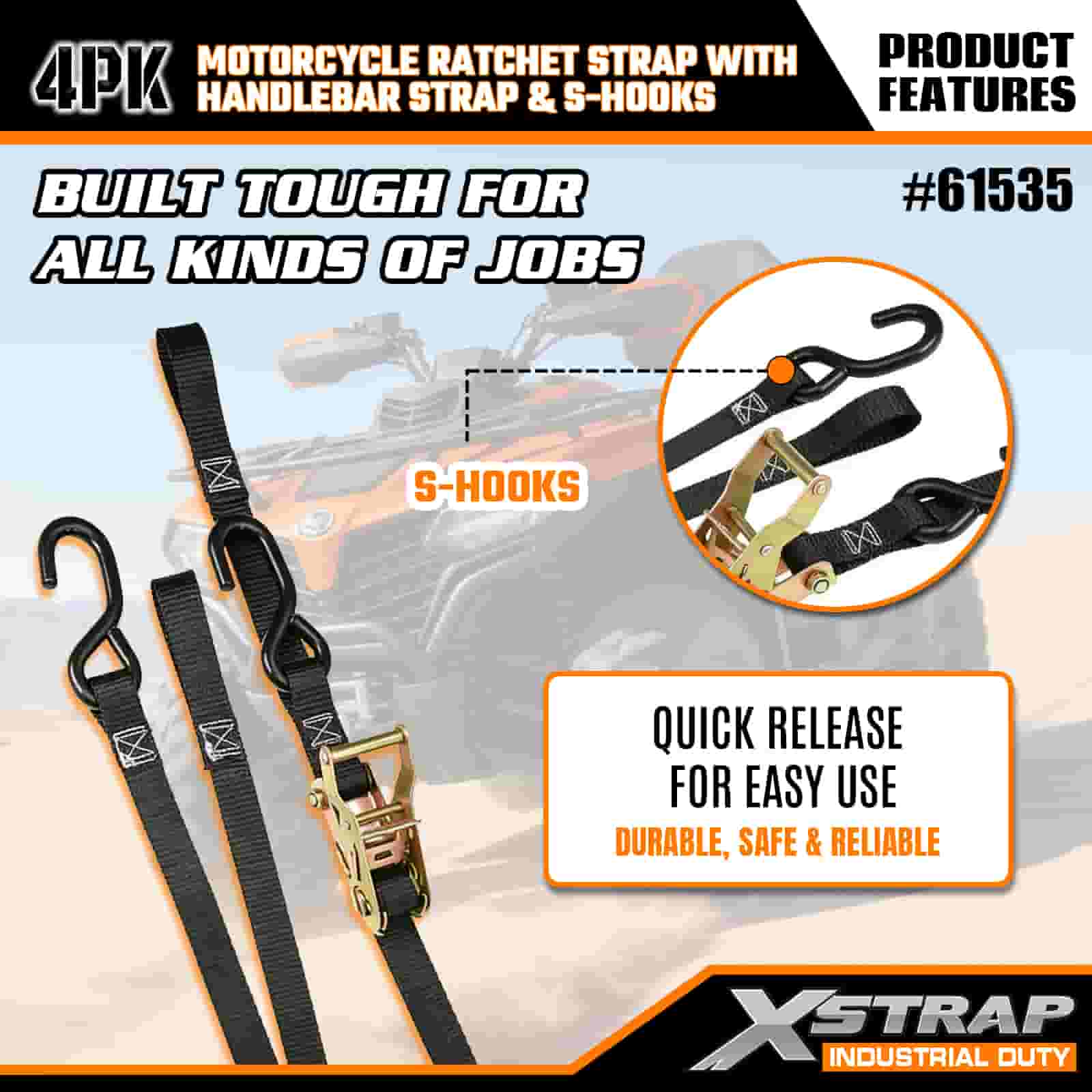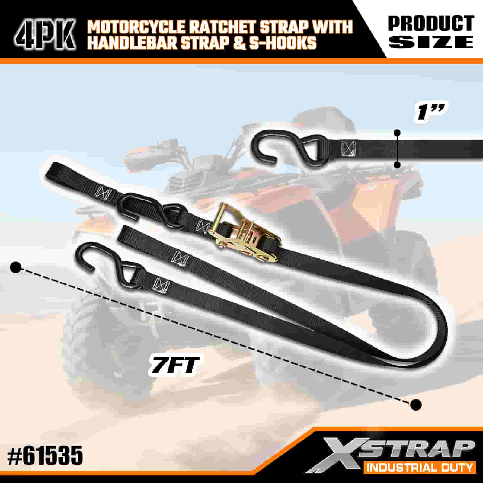 Xstrap 4PK Cinghia a cricchetto per moto con cinghia per manubrio e ganci a S, cinghia in poliestere da 1" x 7', cinghia a cricchetto da tirare, capacità di 833 libbre Cinghie di fissaggio per carico con gancio a S per i professionisti seri per fissare rimorchi di carico, rimorchi a pianale, barche da sci, piccole auto.
