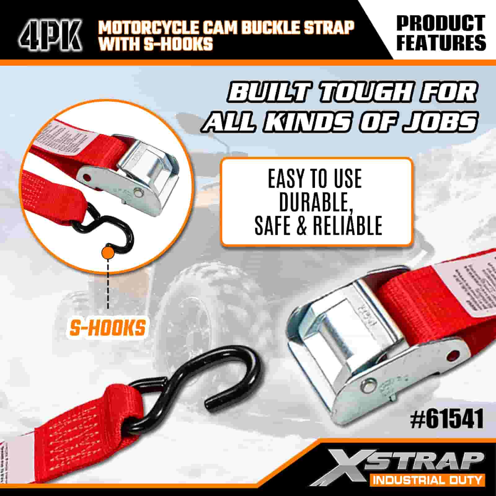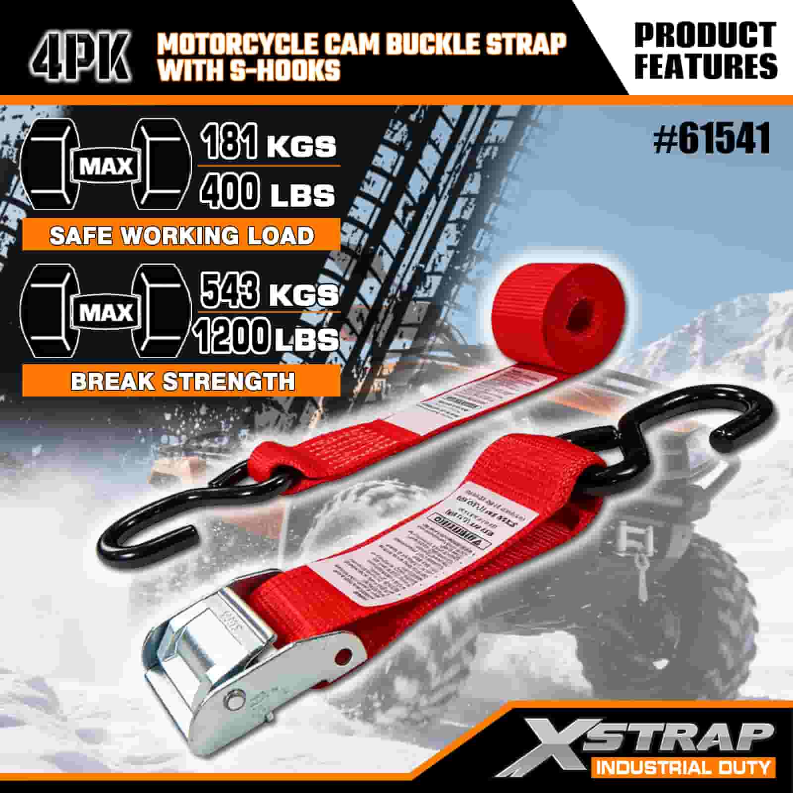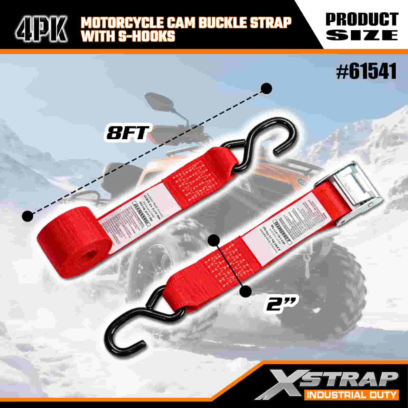 Xstrap 4 pezzi cinturino con fibbia a camma per moto con gancio a S, cinturino in poliestere da 2" x 8' cinturino con fibbia a cricchetto, capacità di 400 libbre Cinghie di ancoraggio per carico con gancio a S per i professionisti seri per fissare rimorchi di carico, rimorchi a pianale, barche da sci, piccole auto.