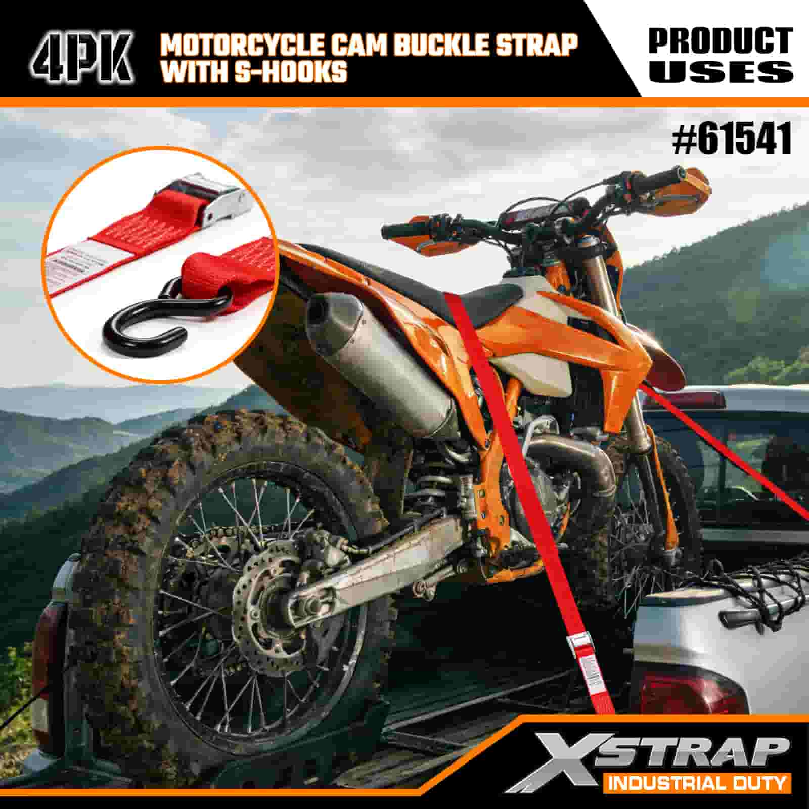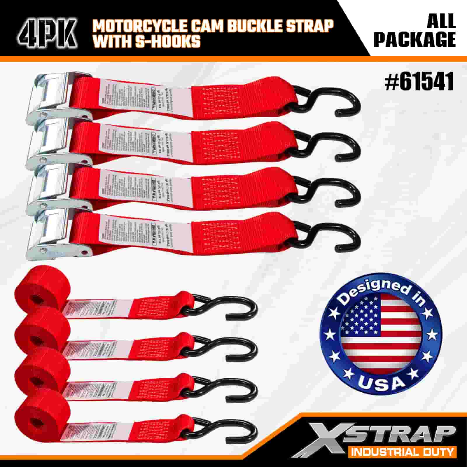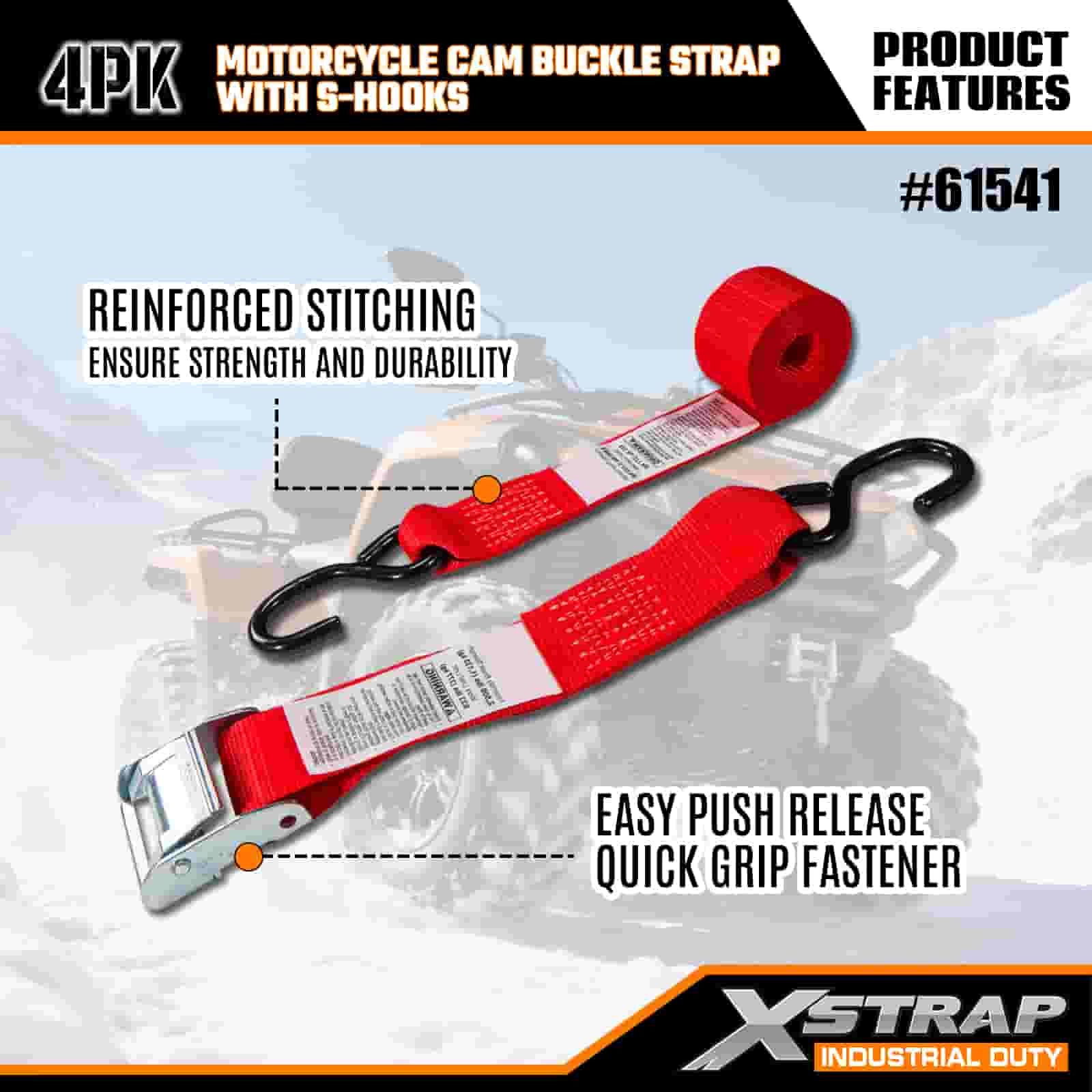 Xstrap 4 pezzi cinturino con fibbia a camma per moto con gancio a S, cinturino in poliestere da 2" x 8' cinturino con fibbia a cricchetto, capacità di 400 libbre Cinghie di ancoraggio per carico con gancio a S per i professionisti seri per fissare rimorchi di carico, rimorchi a pianale, barche da sci, piccole auto.