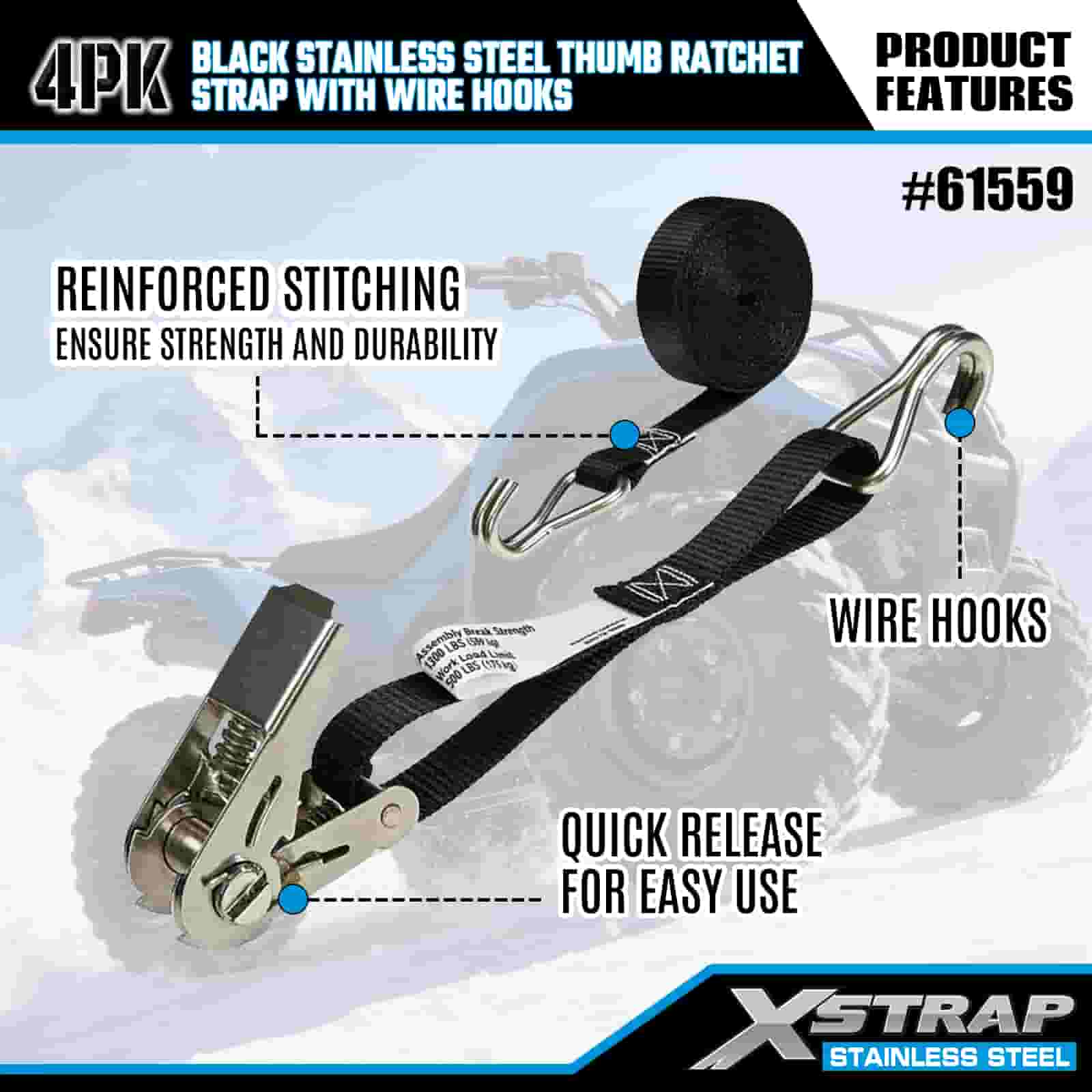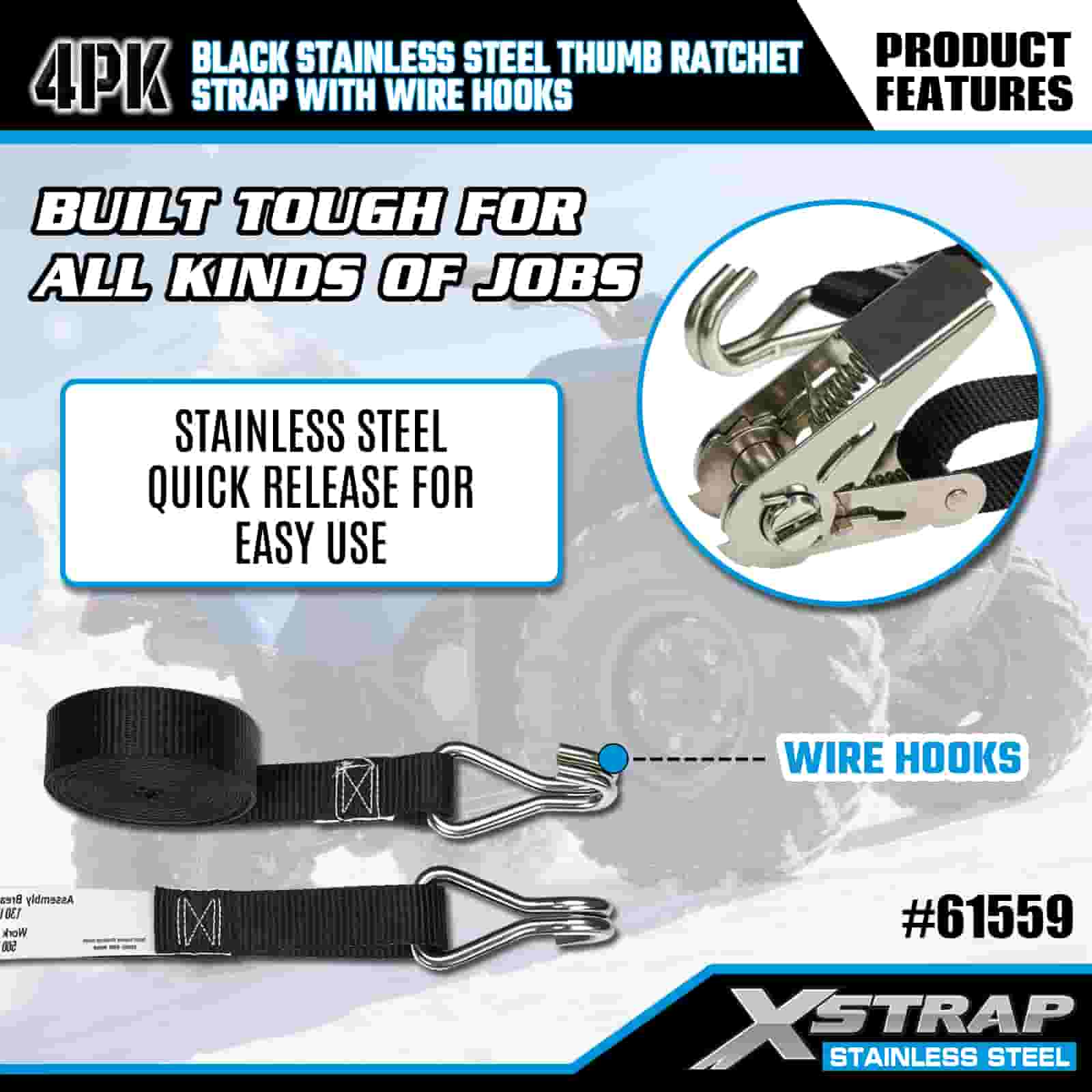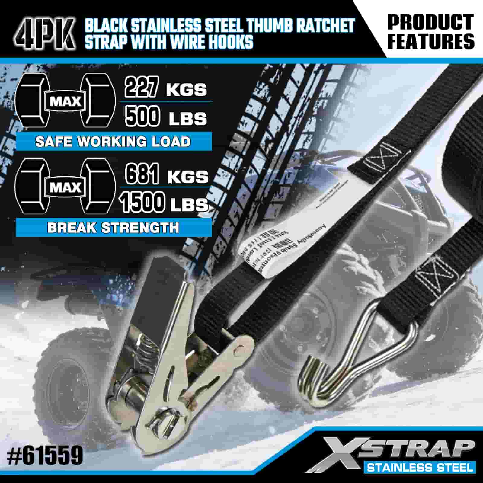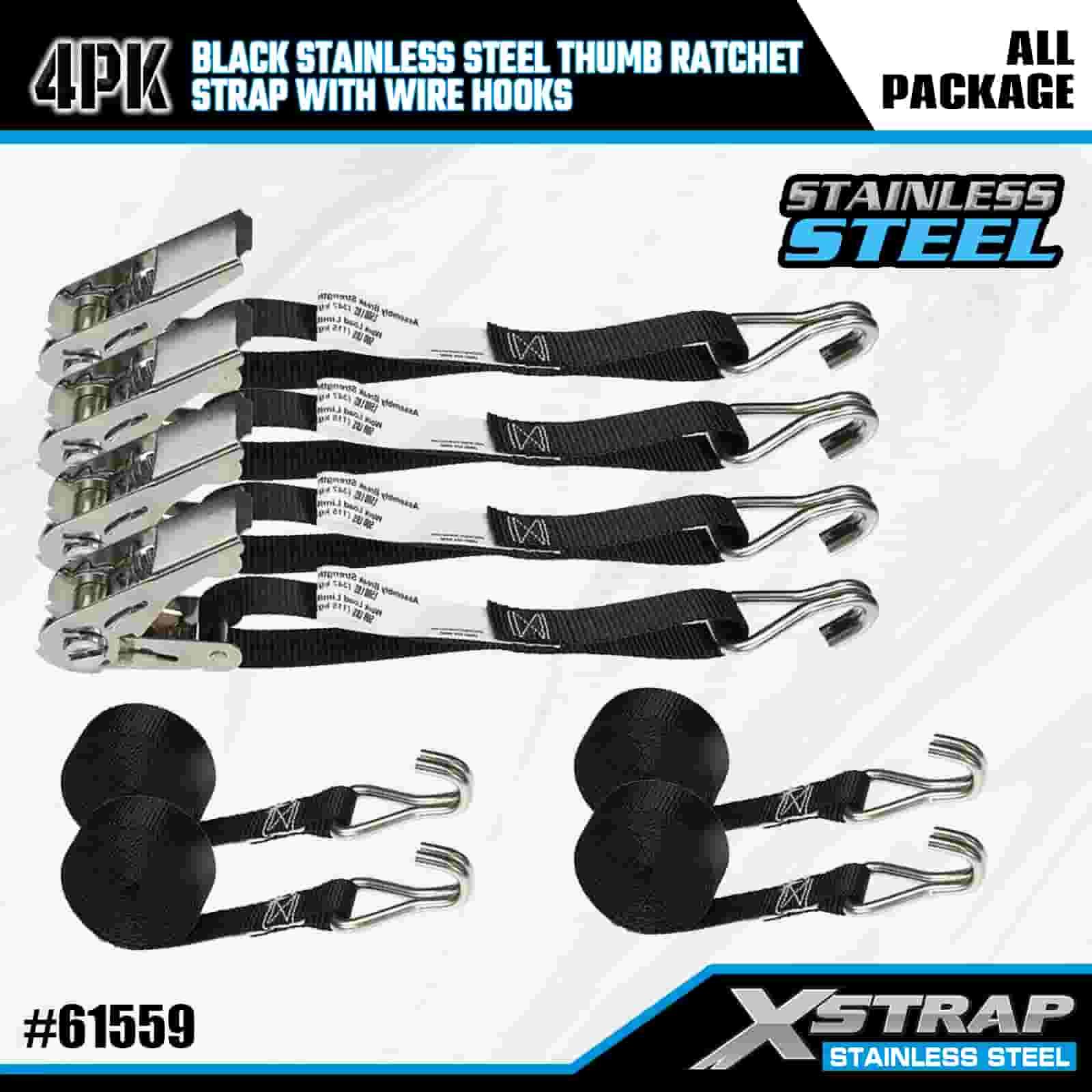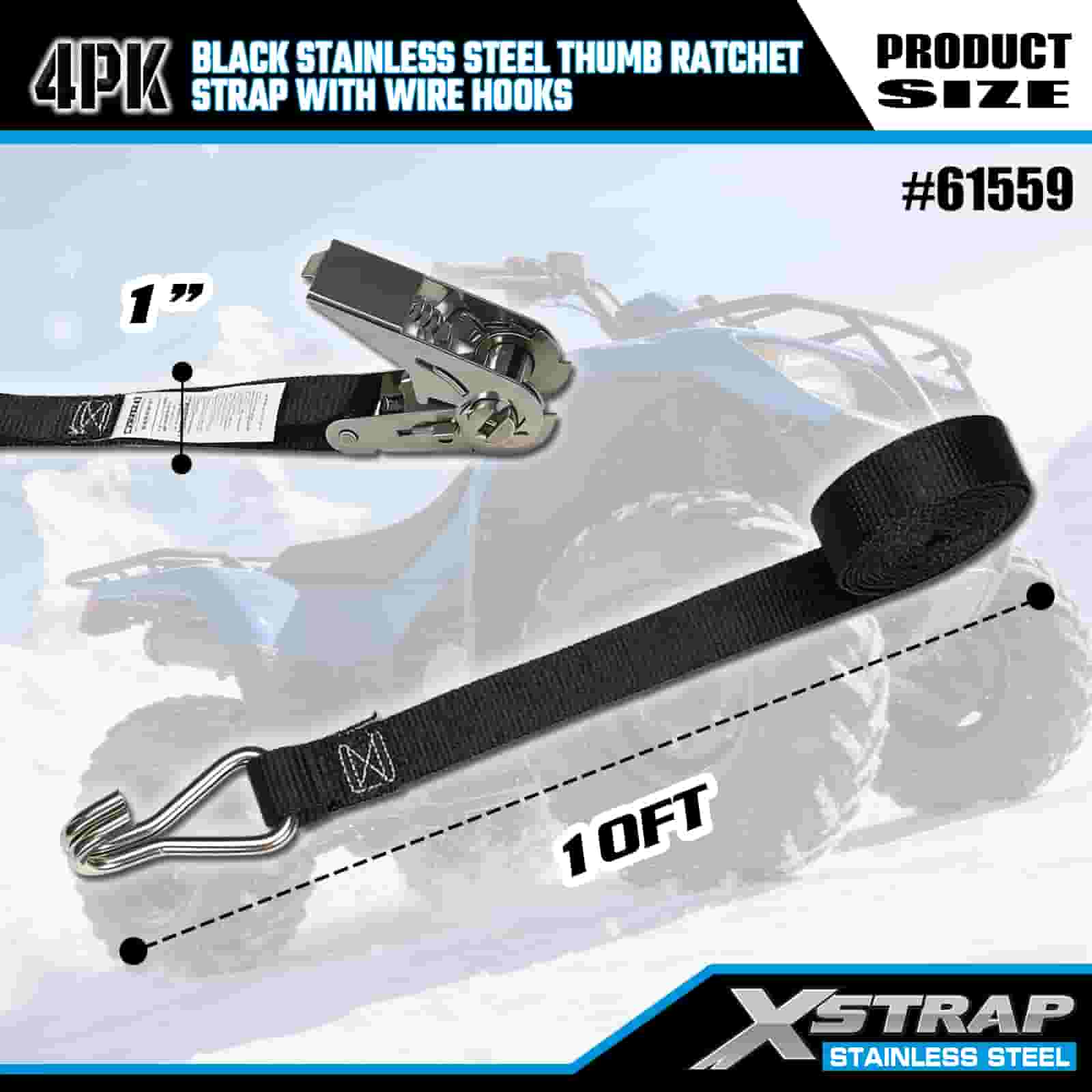 Xstrap 4PK Cricchetto per pollice in acciaio inossidabile nero con ganci in filo, cinghia a cricchetto in poliestere da 1" x 10', cinghie di fissaggio per carico con capacità di 500 libbre con ganci in filo per rimorchio, rimorchio a pianale piatto, barca da sci, piccola auto, attrezzatura pesante.
