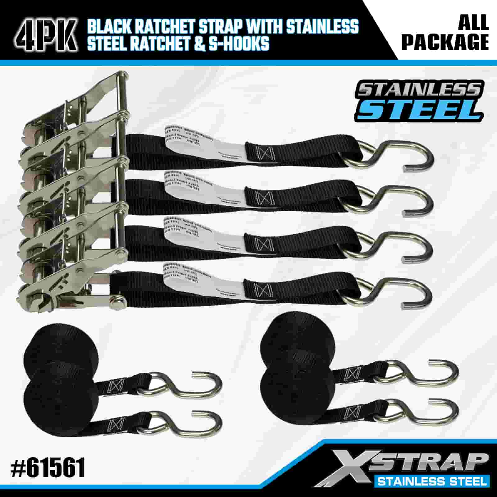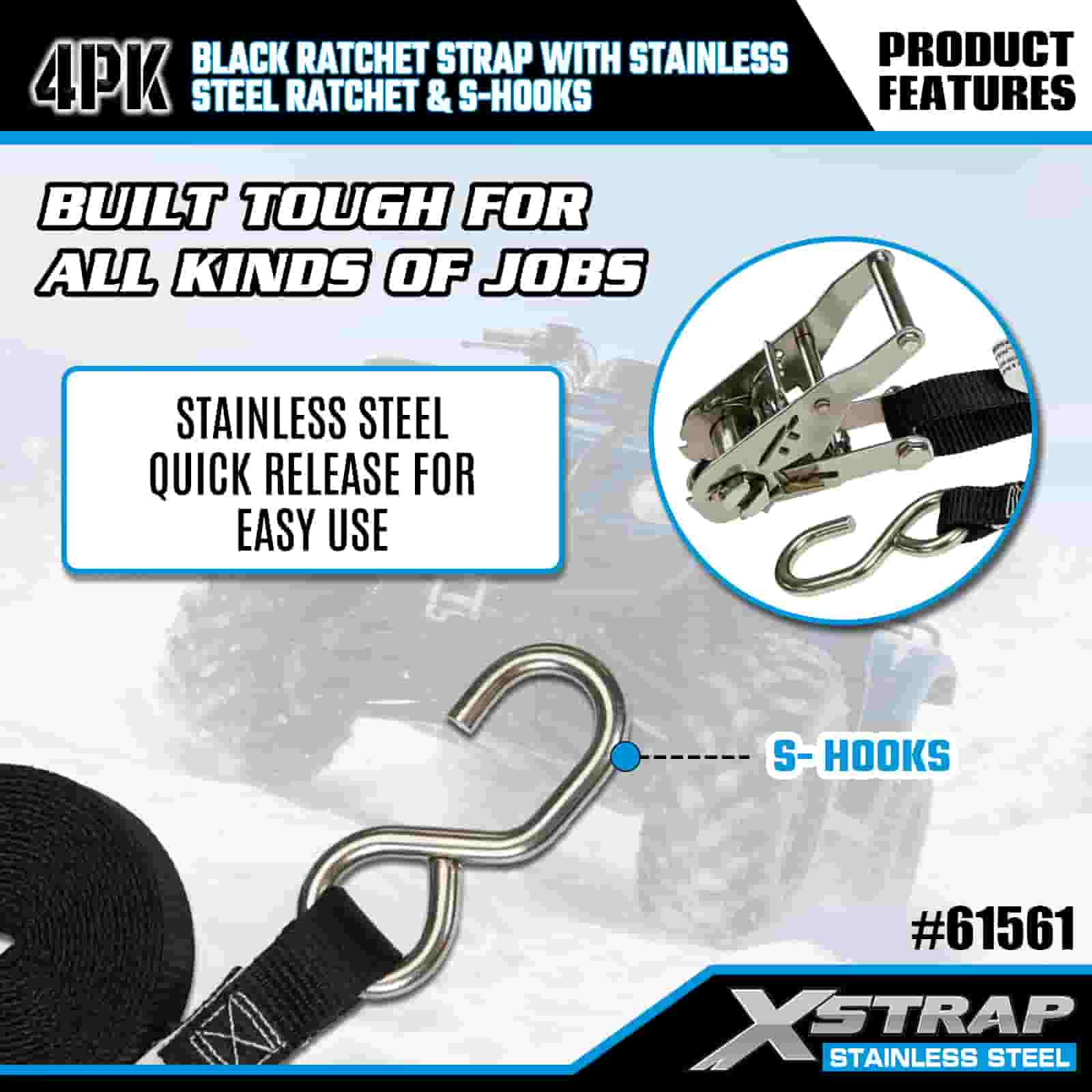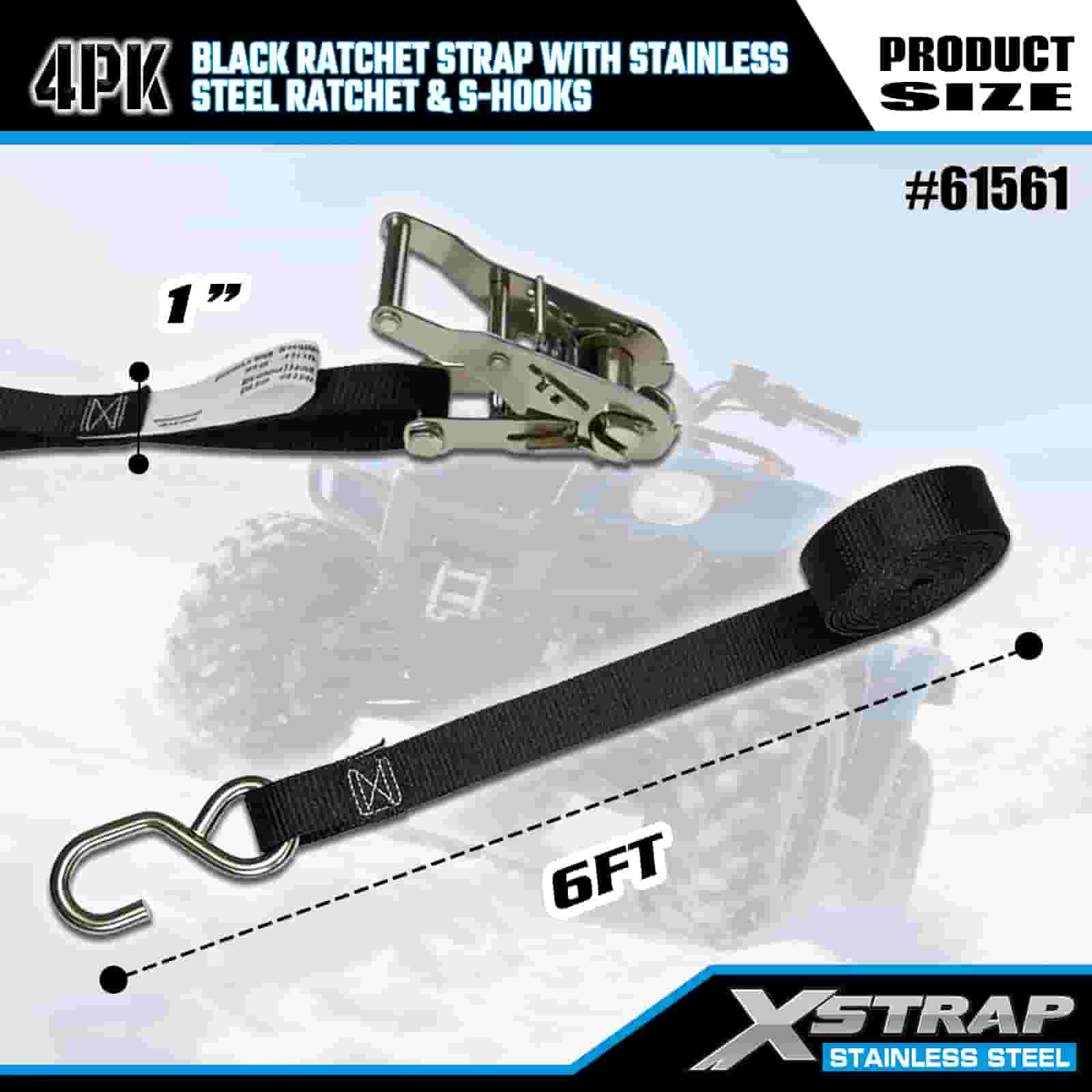 Xstrap 4 pezzi cinghia a cricchetto nera con cricchetto in acciaio inossidabile e ganci a S, cinghia a cricchetto in poliestere da 1" x 6', cinghie di fissaggio per carico con capacità di 400 libbre con ganci a S per rimorchio, rimorchio a pianale piatto, barca da sci, piccola auto, attrezzatura pesante.