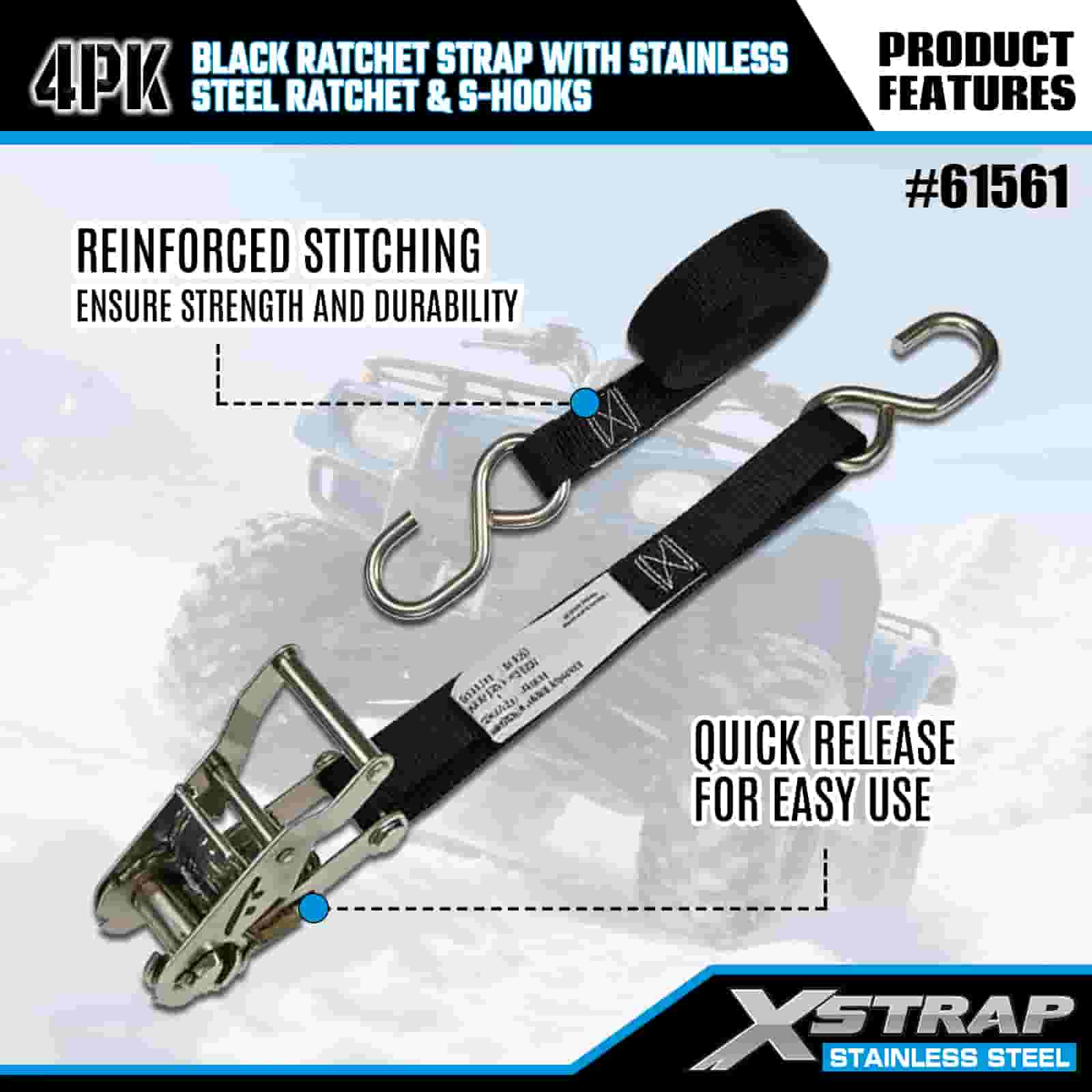 - Un concentrato di potenza compatto, costruito per il trasporto di motociclette e ATV: progettato specificamente per fissare motociclette e ATV sui rimorchi, questa confezione da 4 cinghie a cricchetto offre una presa affidabile senza ingombro. I 20 anni di esperienza di XStrap nel controllo del carico assicurano che la tua corsa rimanga bloccata sul posto, anche su strade di montagna sconnesse.