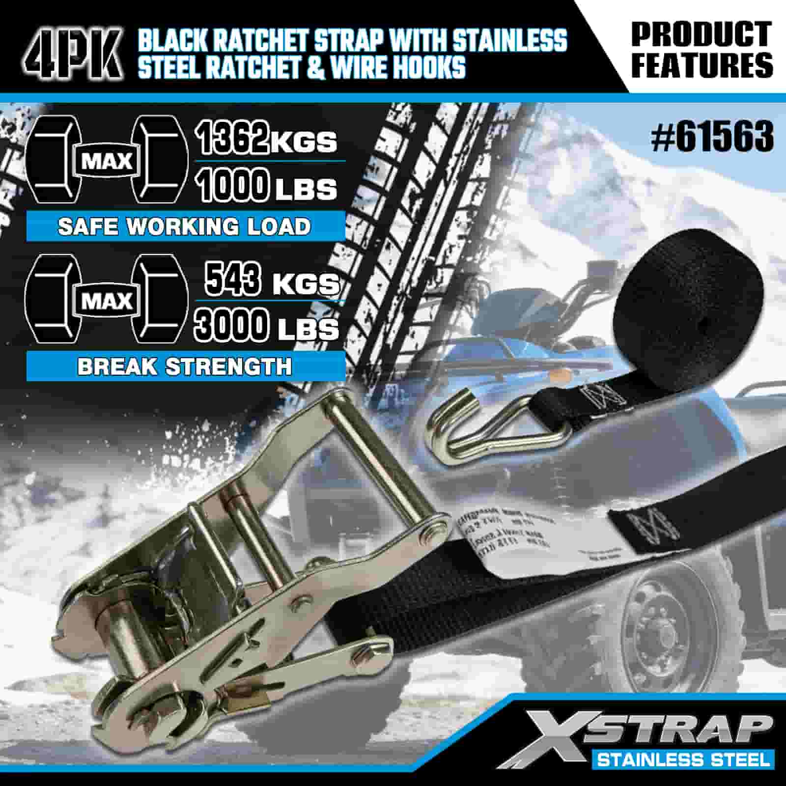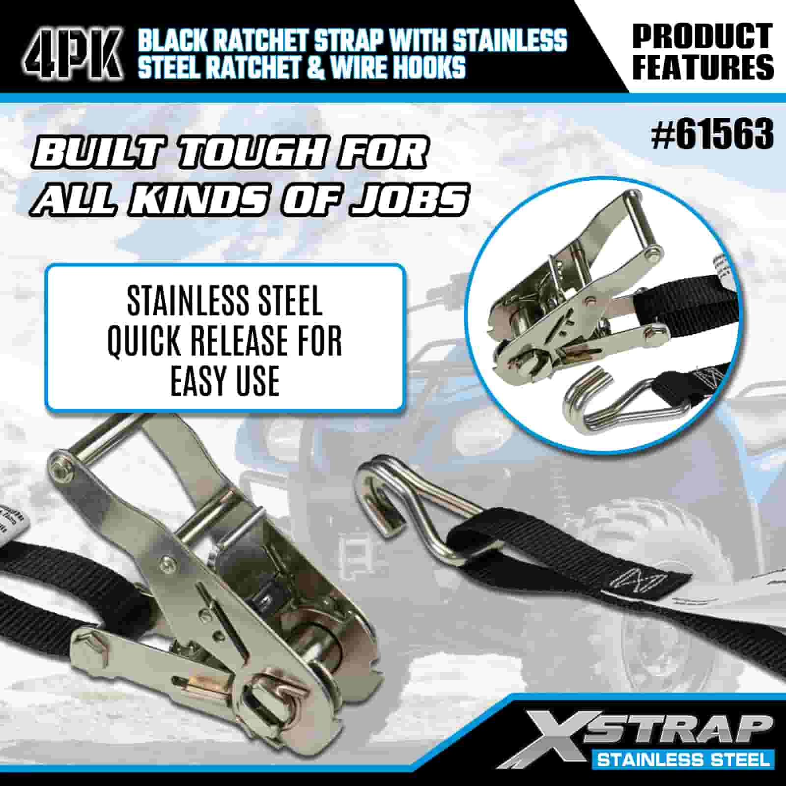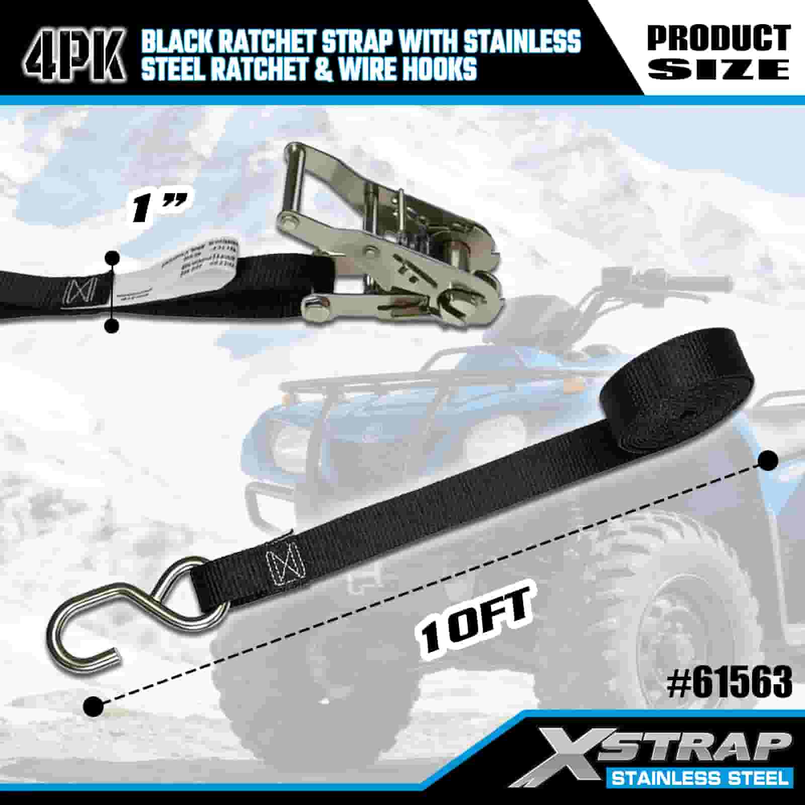 Xstrap 4PK Cinghia a cricchetto nera con cricchetto in acciaio inossidabile e ganci in filo, cinghia in poliestere da 1" x 10', cinghia a cricchetto, capacità di 1000 libbre Cinghie di fissaggio per carico con ganci in filo per rimorchio, rimorchio a pianale, barca da sci, piccola auto, attrezzatura pesante.