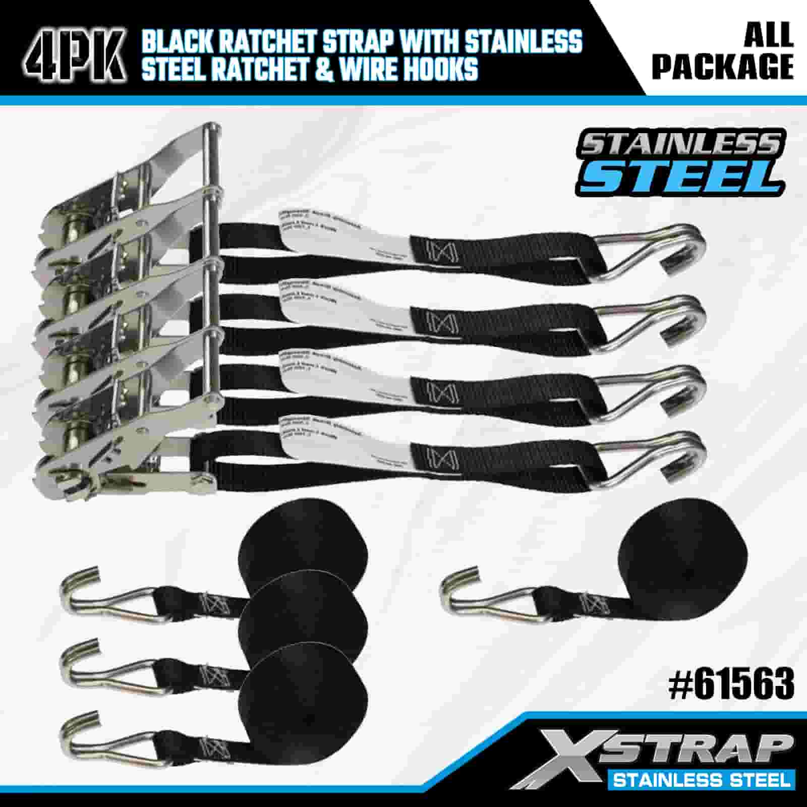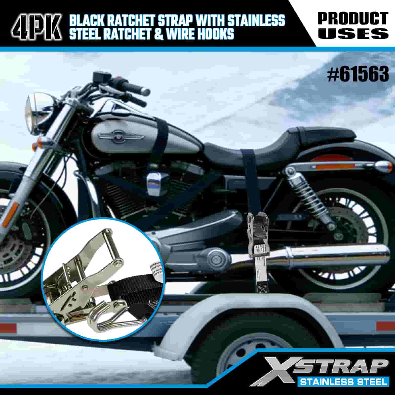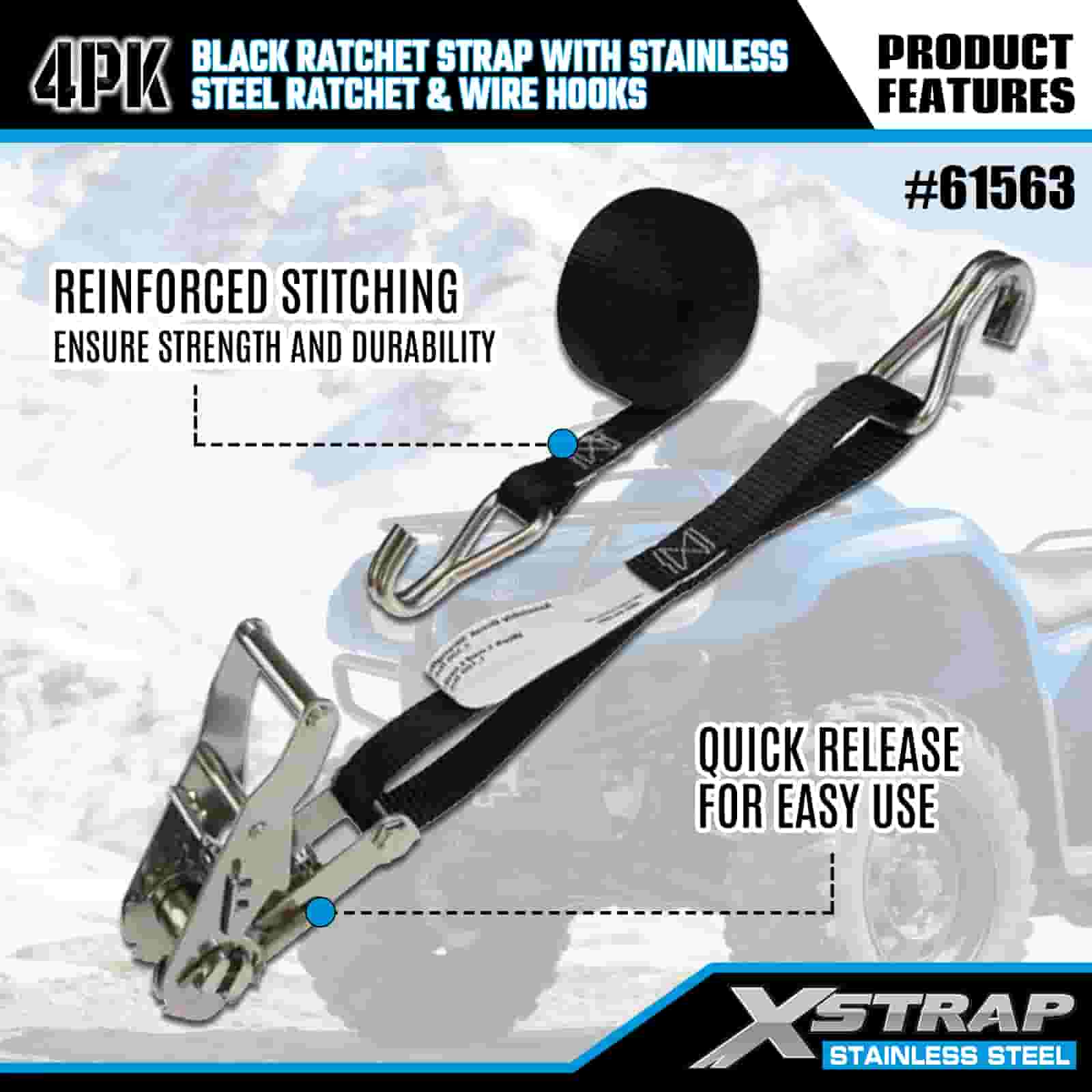 Xstrap 4PK Cinghia a cricchetto nera con cricchetto in acciaio inossidabile e ganci in filo, cinghia in poliestere da 1" x 10', cinghia a cricchetto, capacità di 1000 libbre Cinghie di fissaggio per carico con ganci in filo per rimorchio, rimorchio a pianale, barca da sci, piccola auto, attrezzatura pesante.
