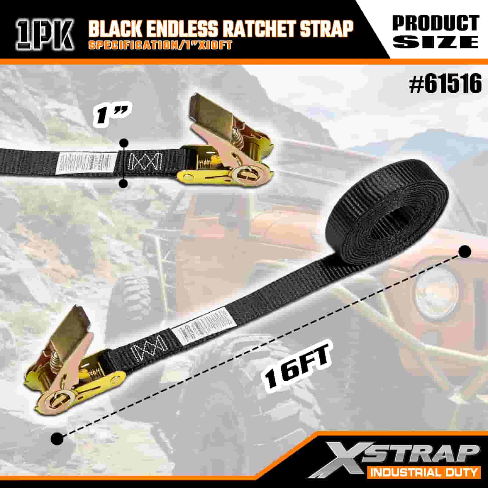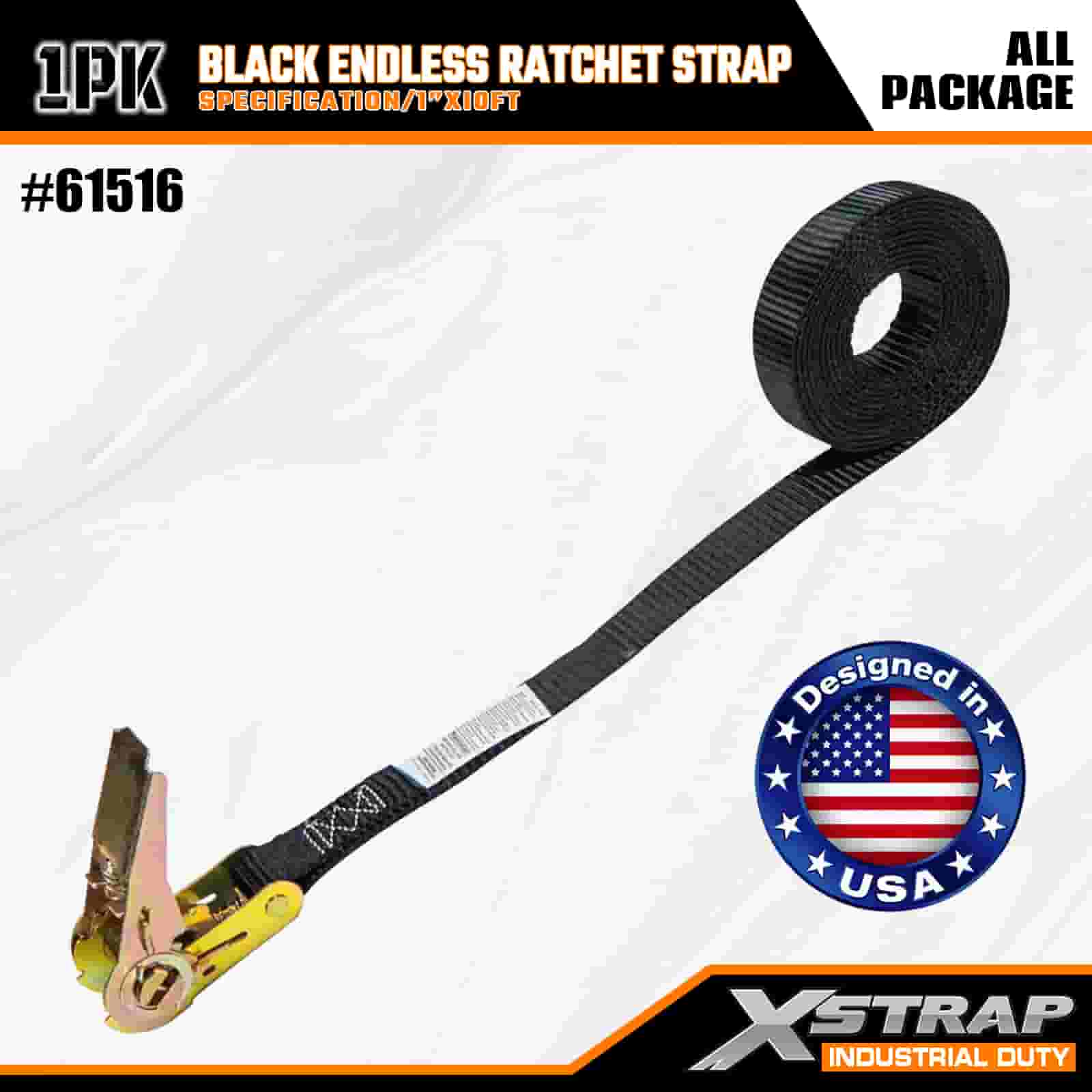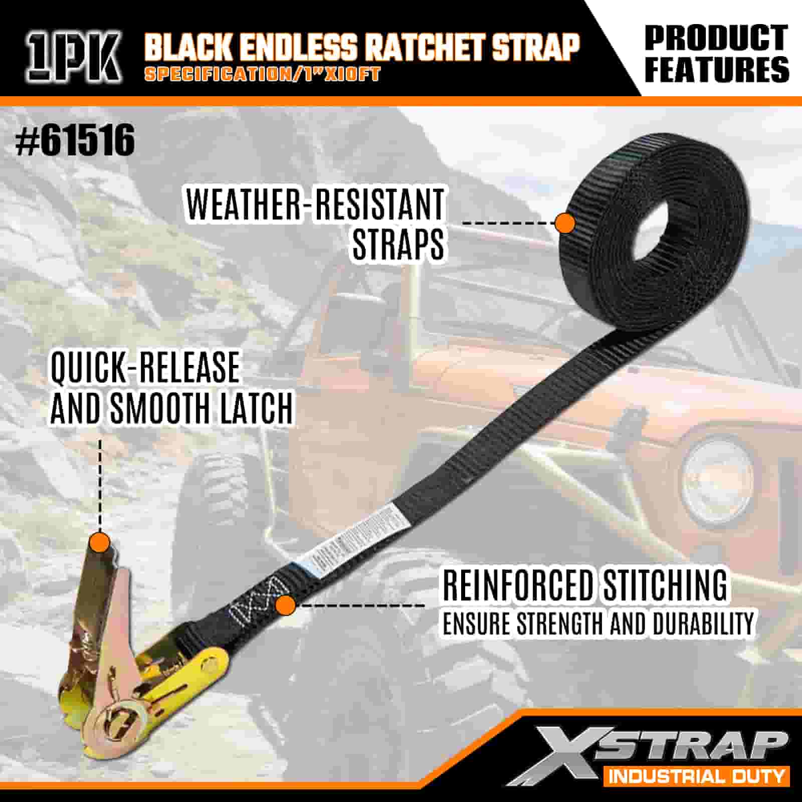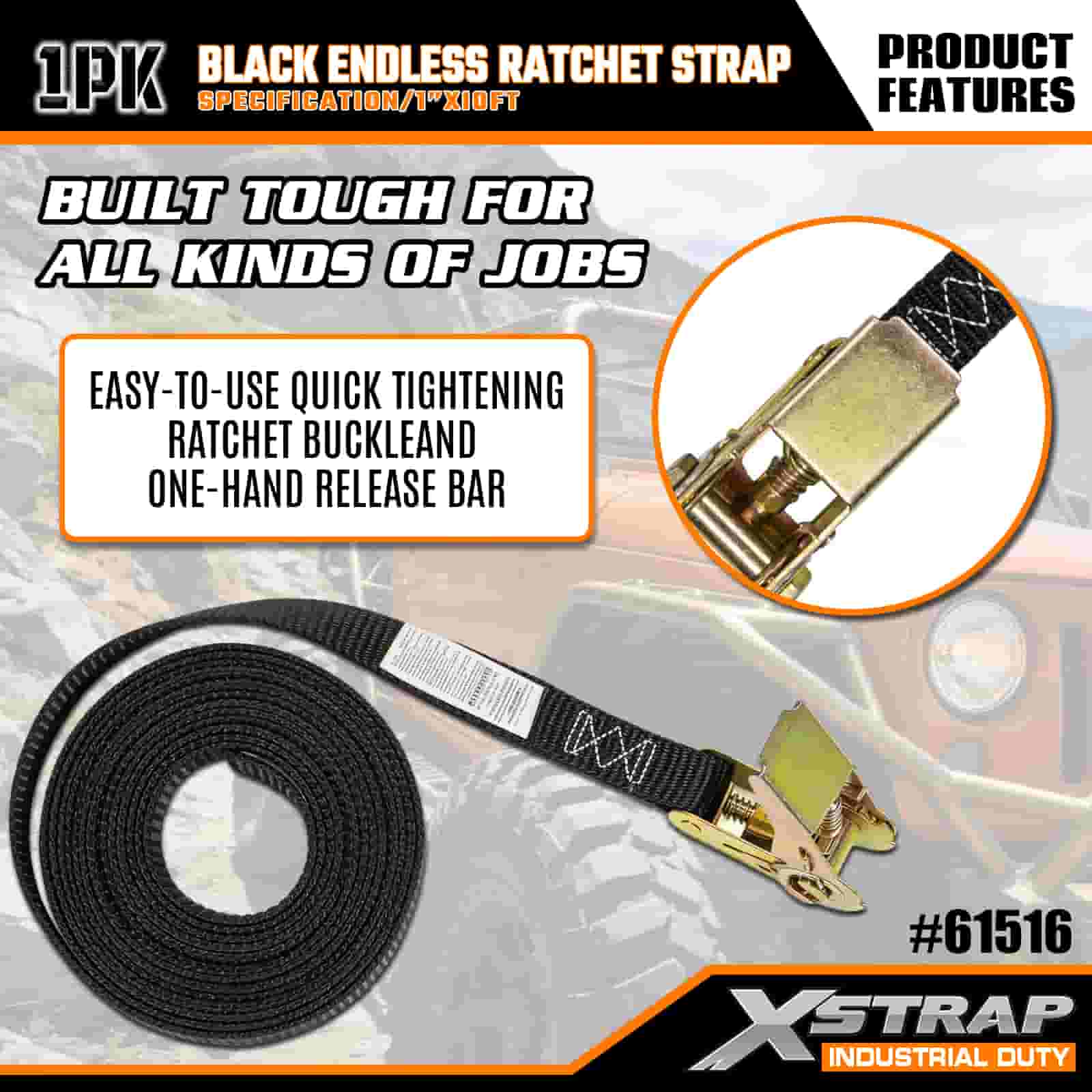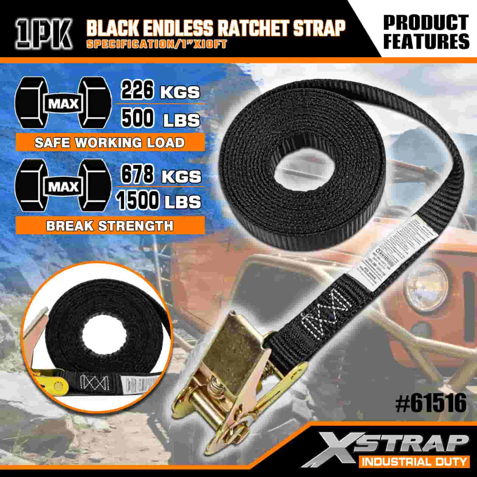 Xstrap Cinghia a cricchetto infinita nera, cinghia a cricchetto in poliestere da 1" x 10', cinghie di fissaggio per carico con capacità di 500 libbre per professionisti seri per proteggere rimorchi da carico, rimorchi a pianale, barche da sci, piccole auto.