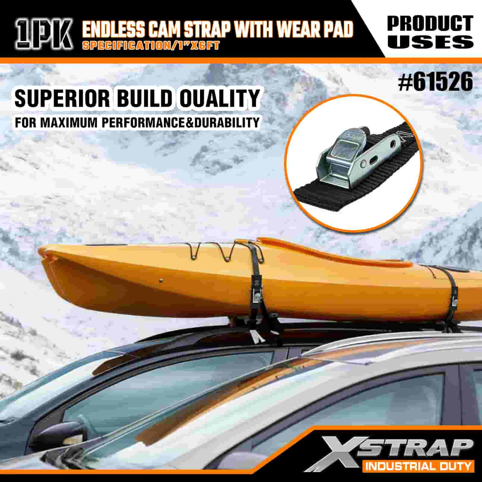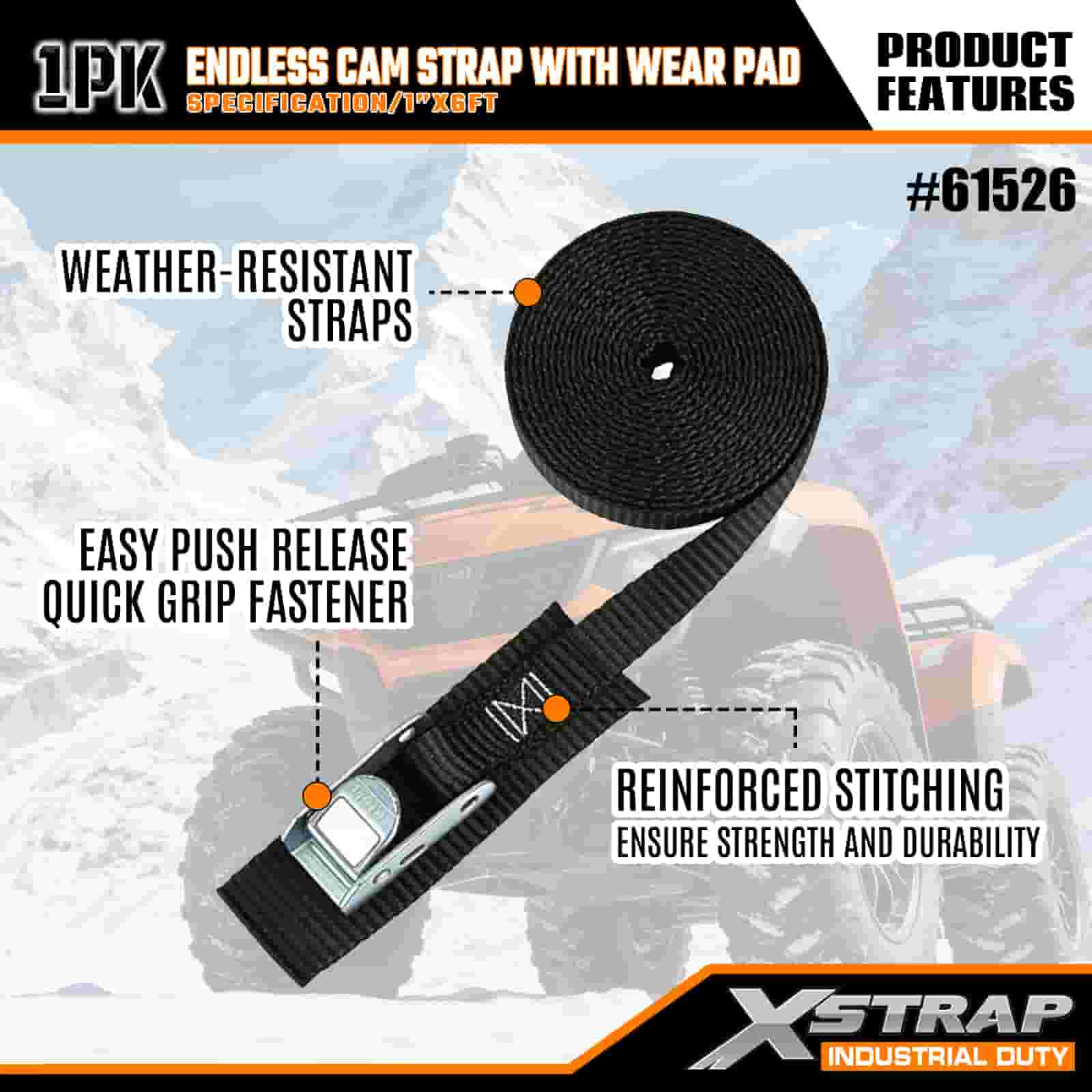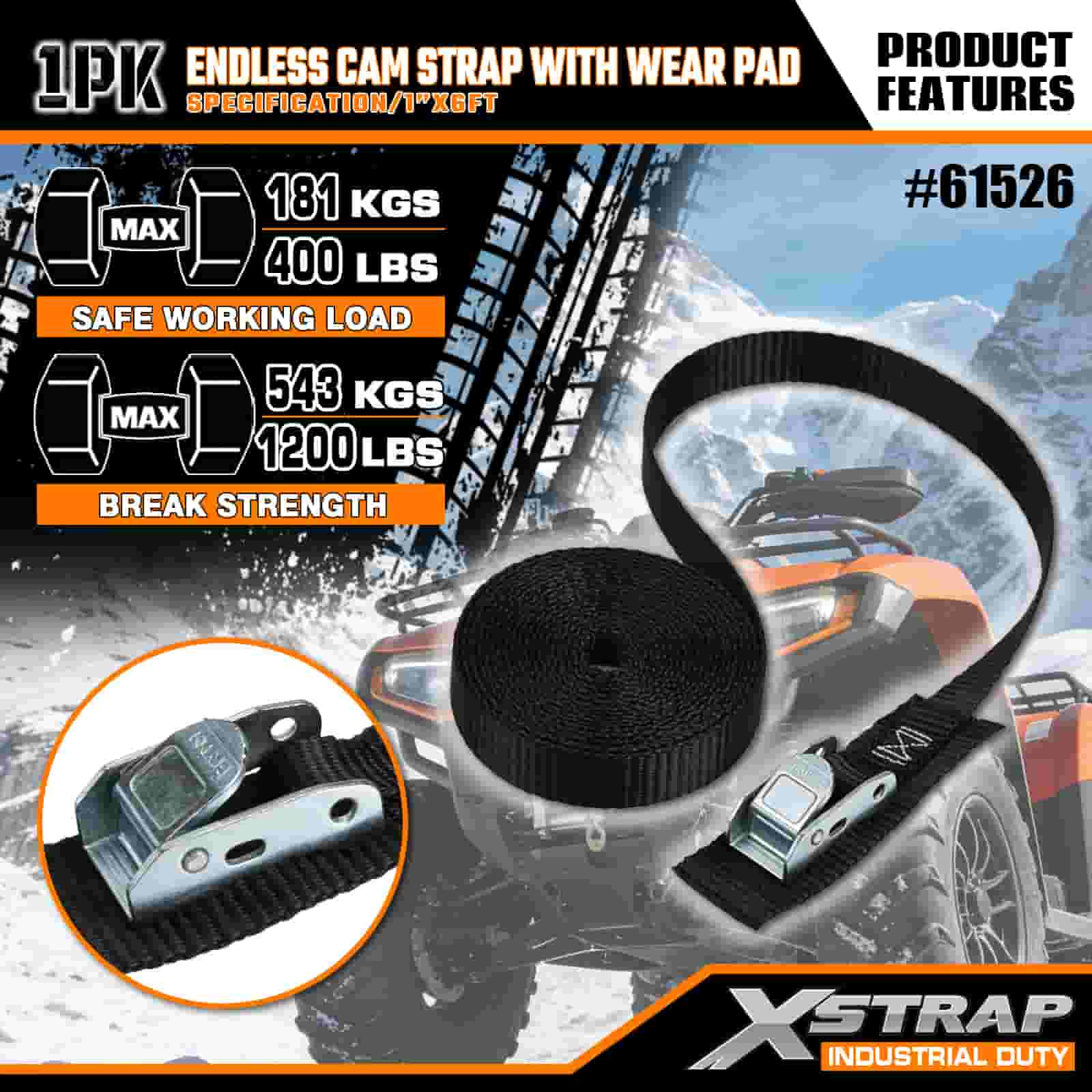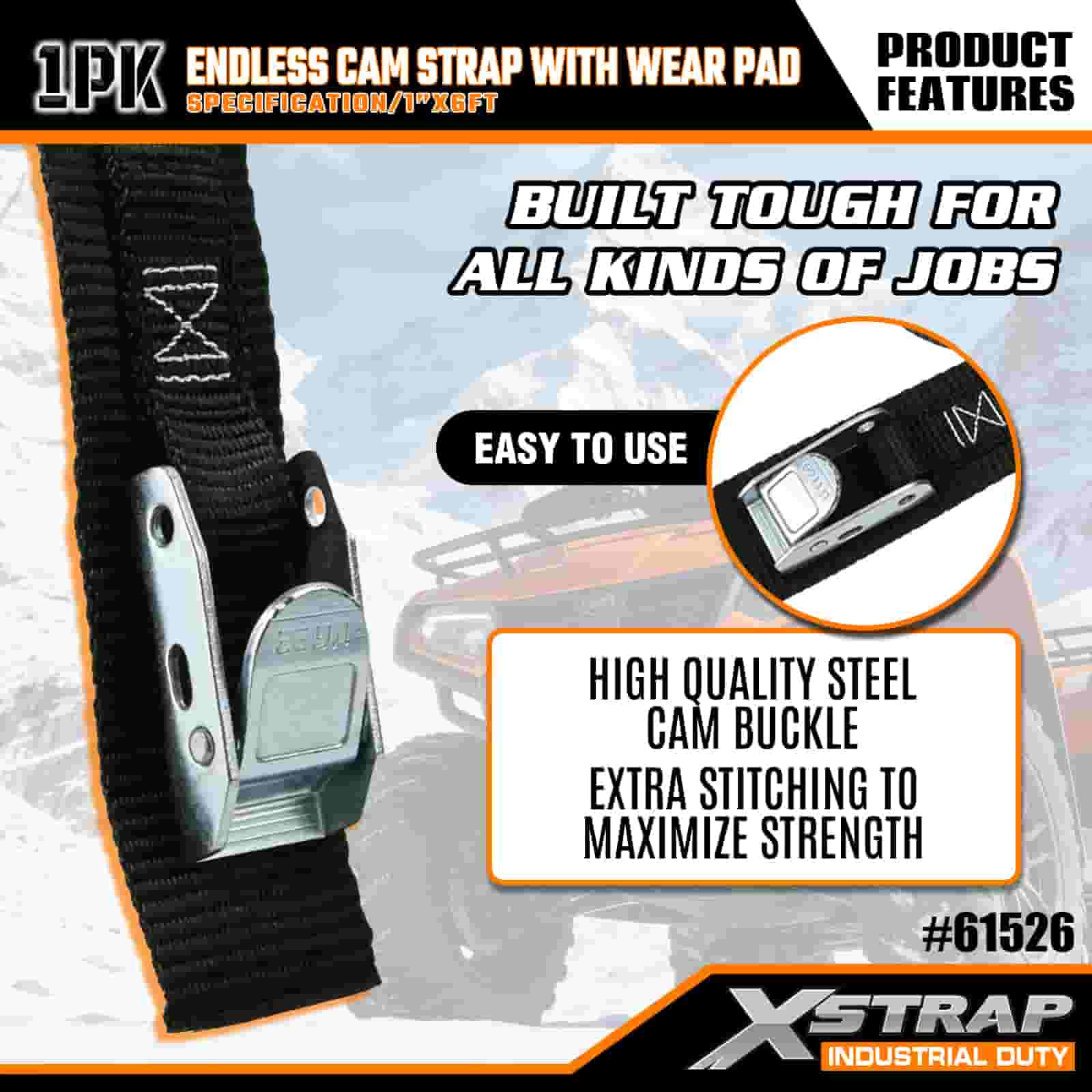 Xstrap Endless Cam Strap con cuscinetto antiusura, cinghia di ancoraggio in poliestere da 1" x 6', cinghia con fibbia a camma, capacità di 400 libbre Cinghie di fissaggio per ancoraggio del carico per professionisti seri per proteggere rimorchi di carico, rimorchi a pianale, barche da sci, piccole auto.