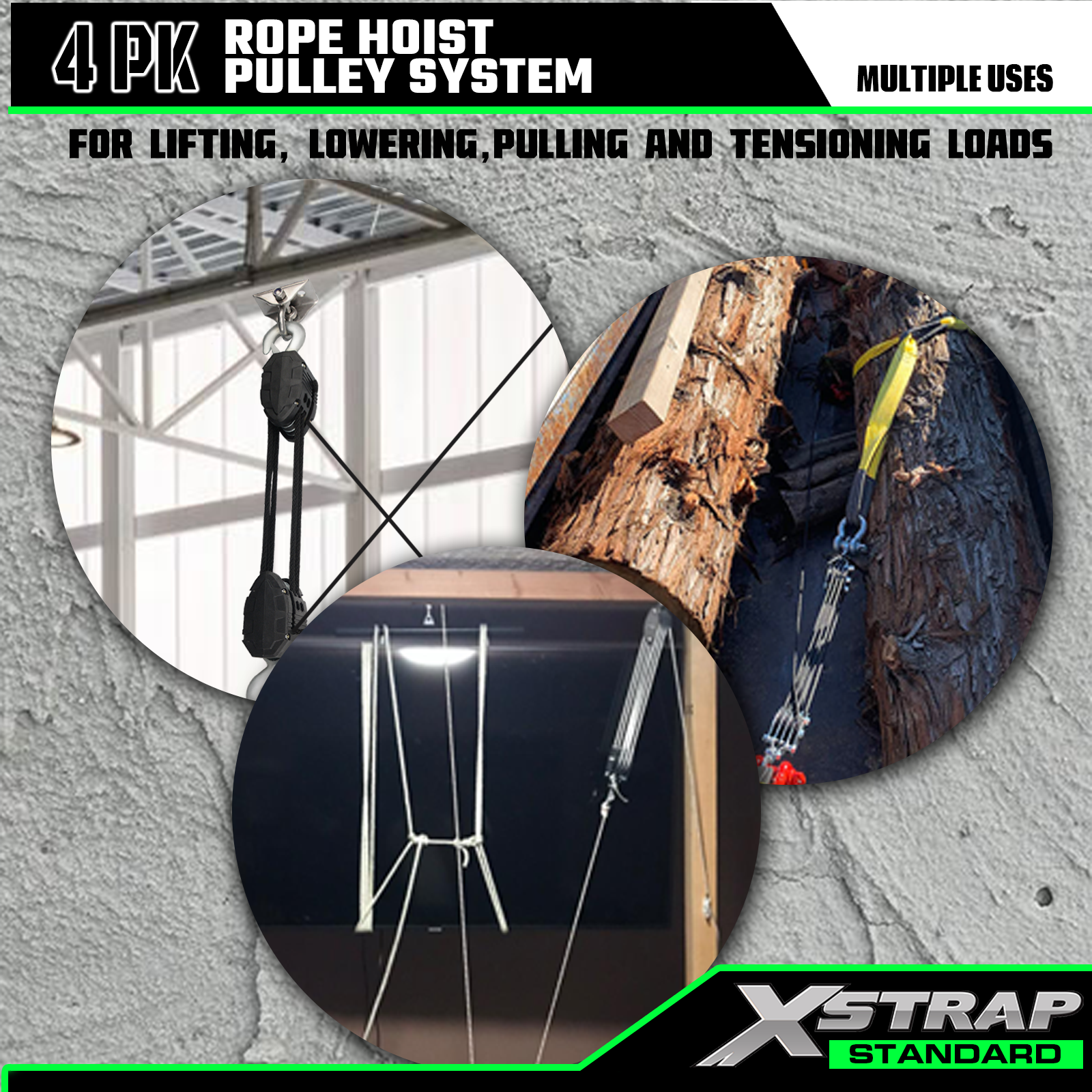 Questo è il nostro paranco a fune XSTRAP STANDARD da 50 piedi, blocco ruota da 2000 libbre per carichi pesanti e sistema di pulegge per il sollevamento di oggetti pesanti con guanti da lavoro, 2 anelli morbidi, 1 gancio oscillante per magazzino in garage.