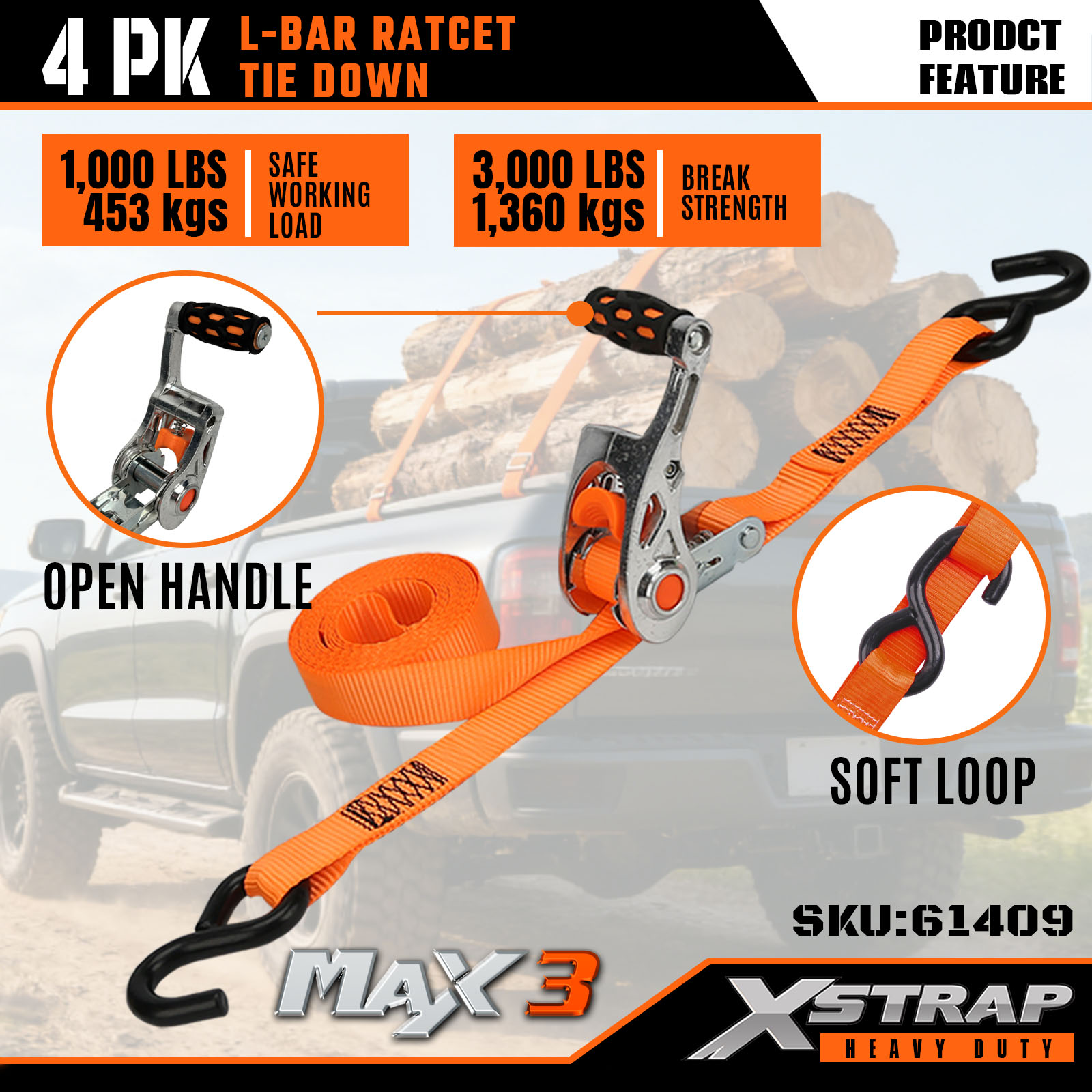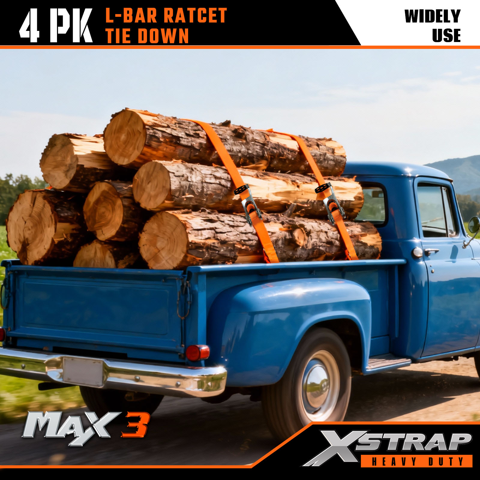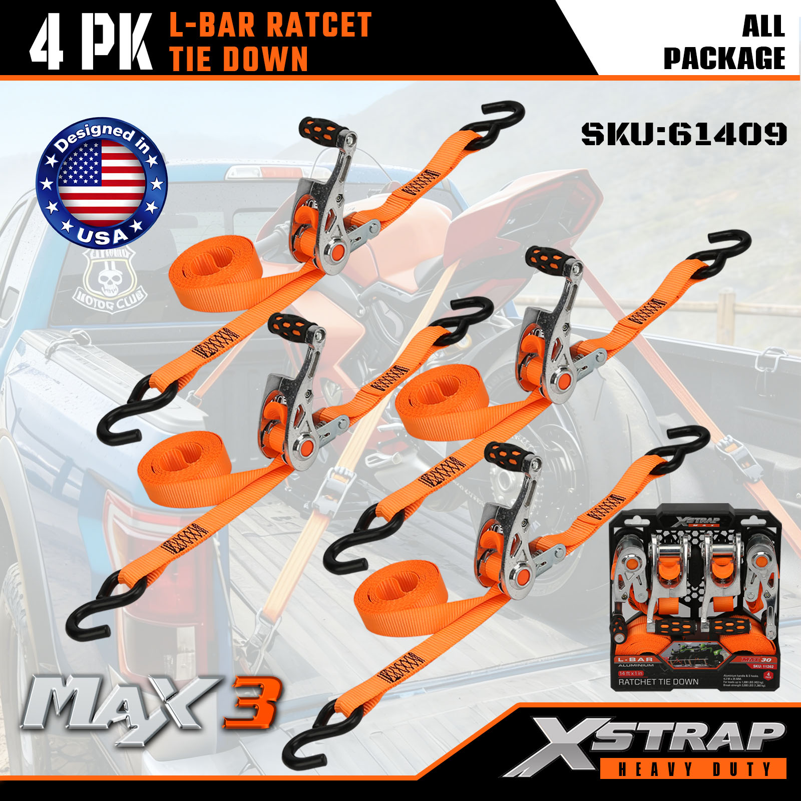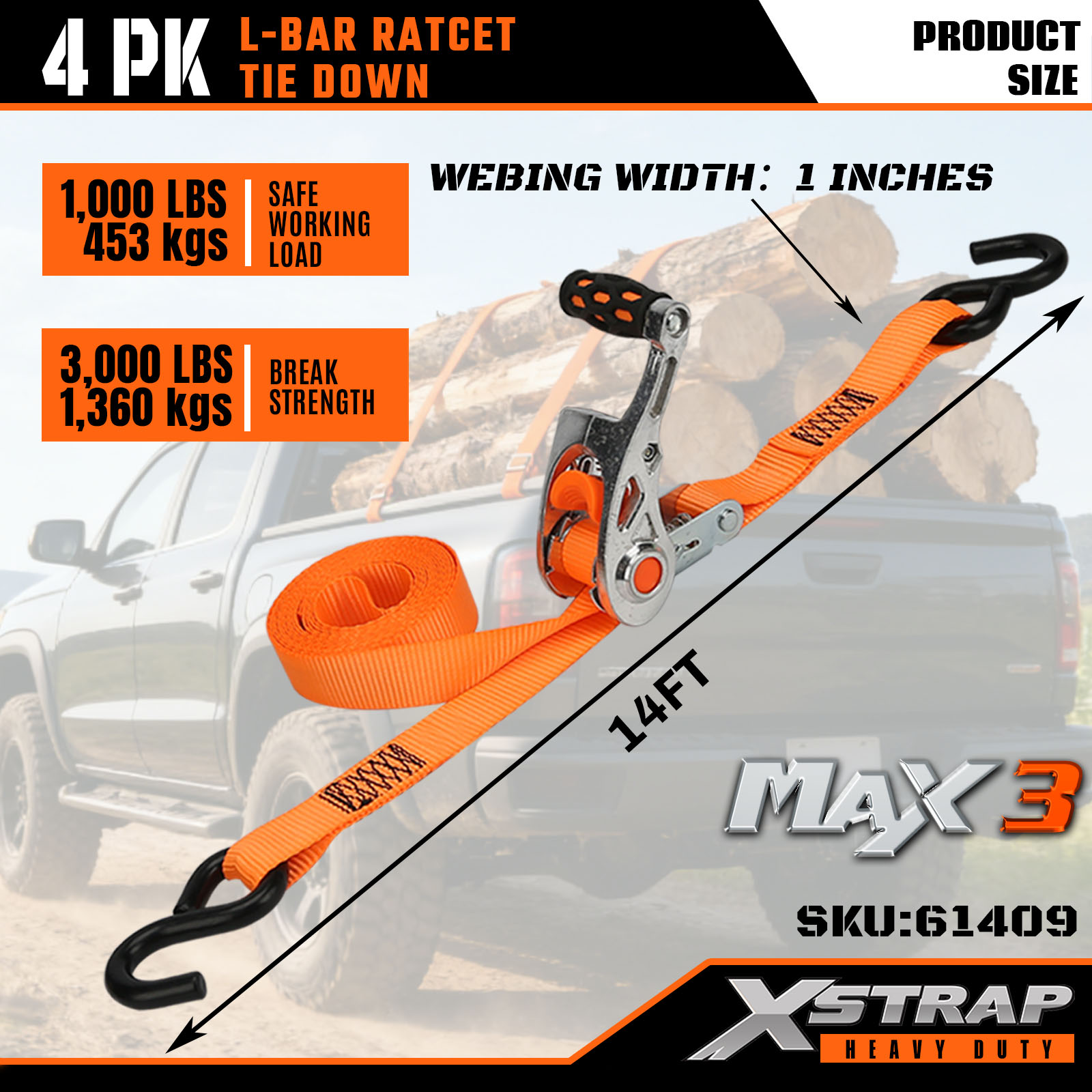 Xstrap Confezione da 4 Cinghie di ancoraggio con barra a L, cinghia di ancoraggio in poliestere da 1" x 14' con cricchetto, capacità di 1000 libbre Cinghie di fissaggio per carico con ganci a S per camion, SUV, portabagagli per auto e moto.