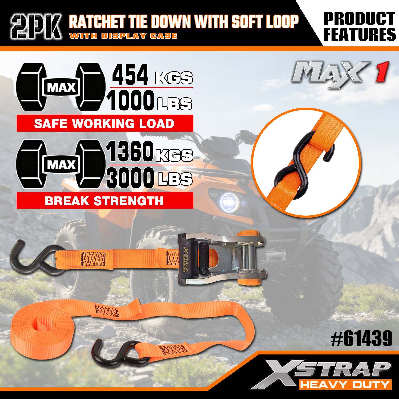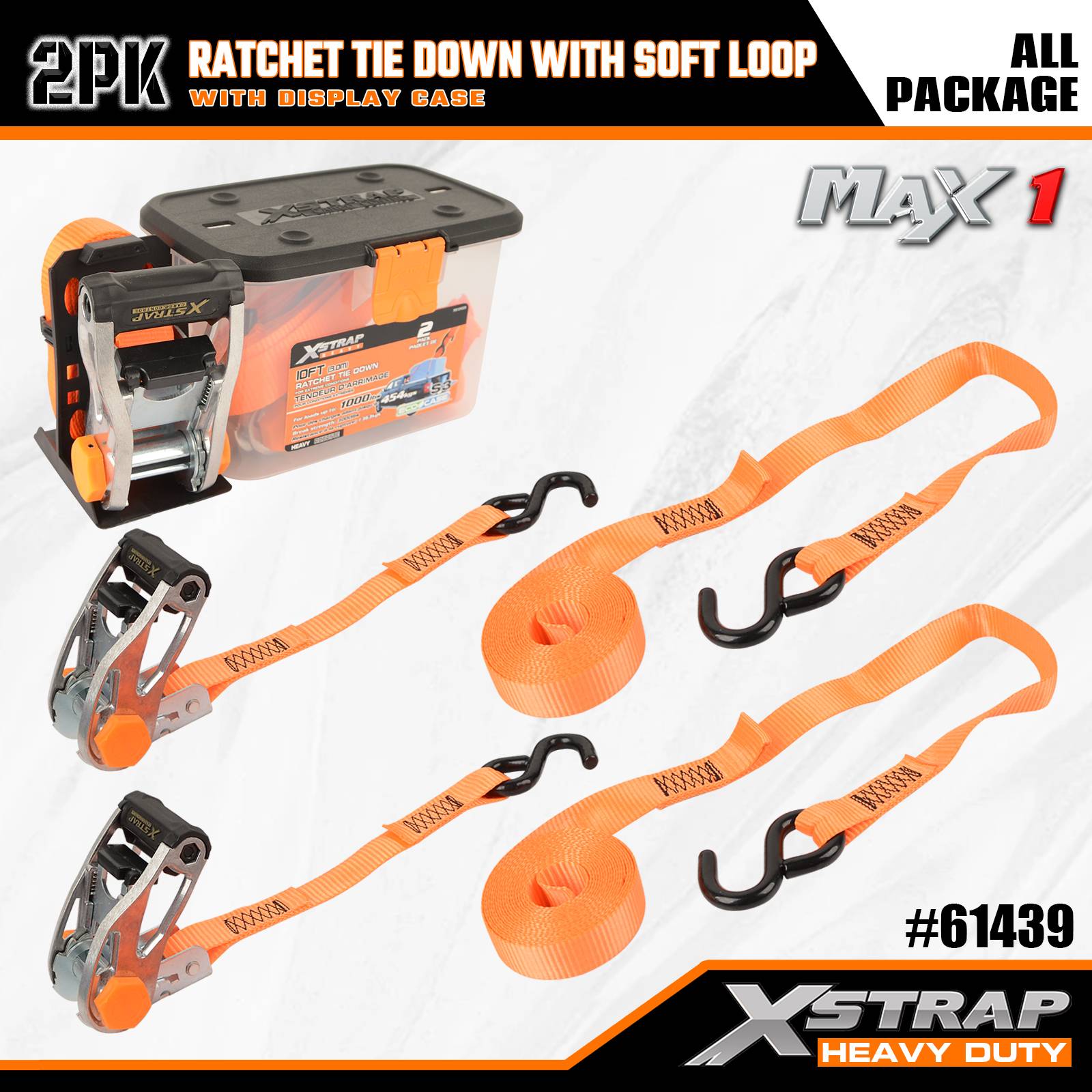 Xstrap 2 pacchi con cricchetto con passante morbido, cinghia in poliestere da 1-1/16" x 10' con cricchetto, capacità di 1000 libbre Cinghie di fissaggio per carico con ganci a S per camion, SUV, portabagagli per auto e moto.
