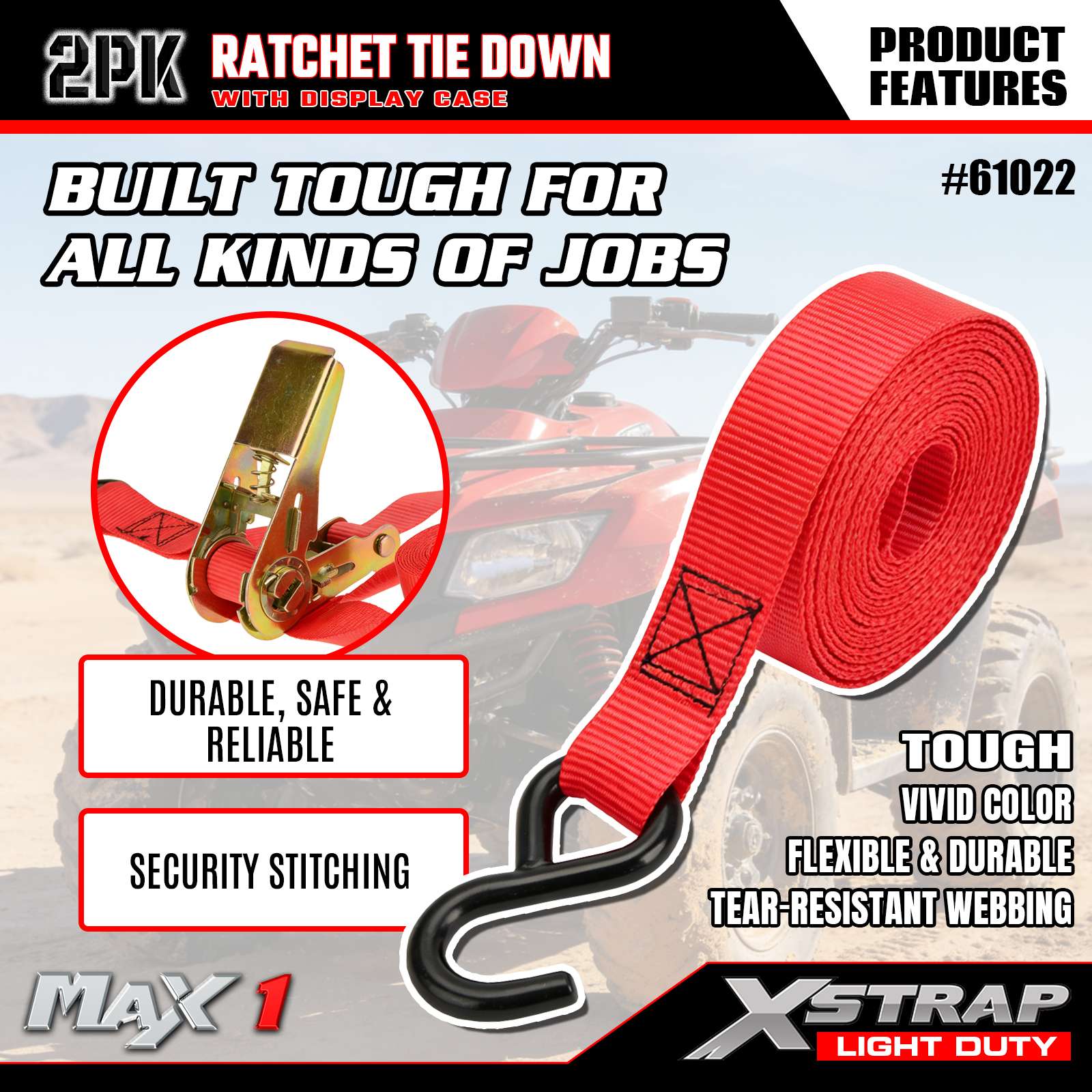 Le cinghie di fissaggio a cricchetto Xstrap 2PK misurano 1 pollice x 10 piedi, il carico di lavoro sicuro è di 300 libbre e la resistenza alla rottura è di 900 libbre.
