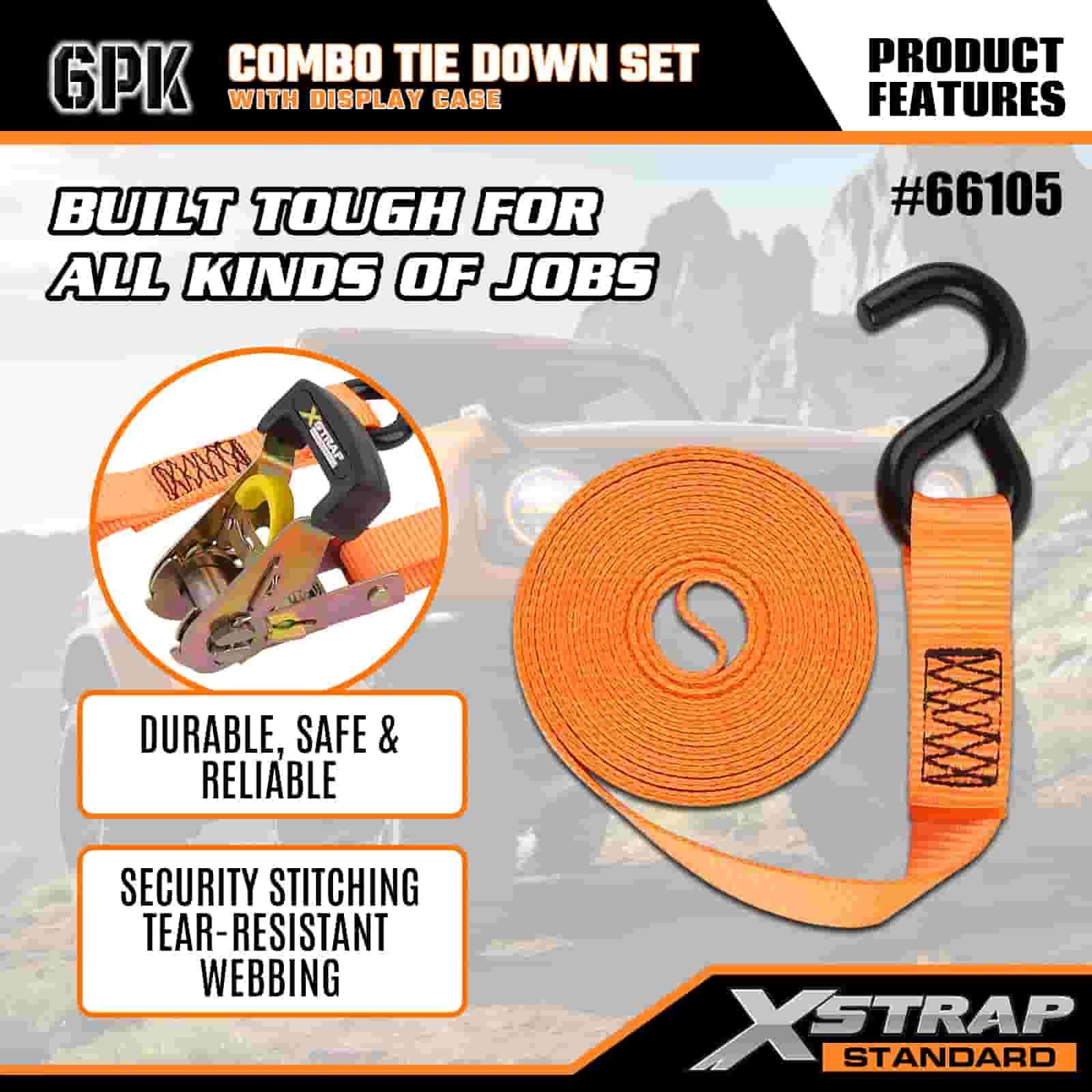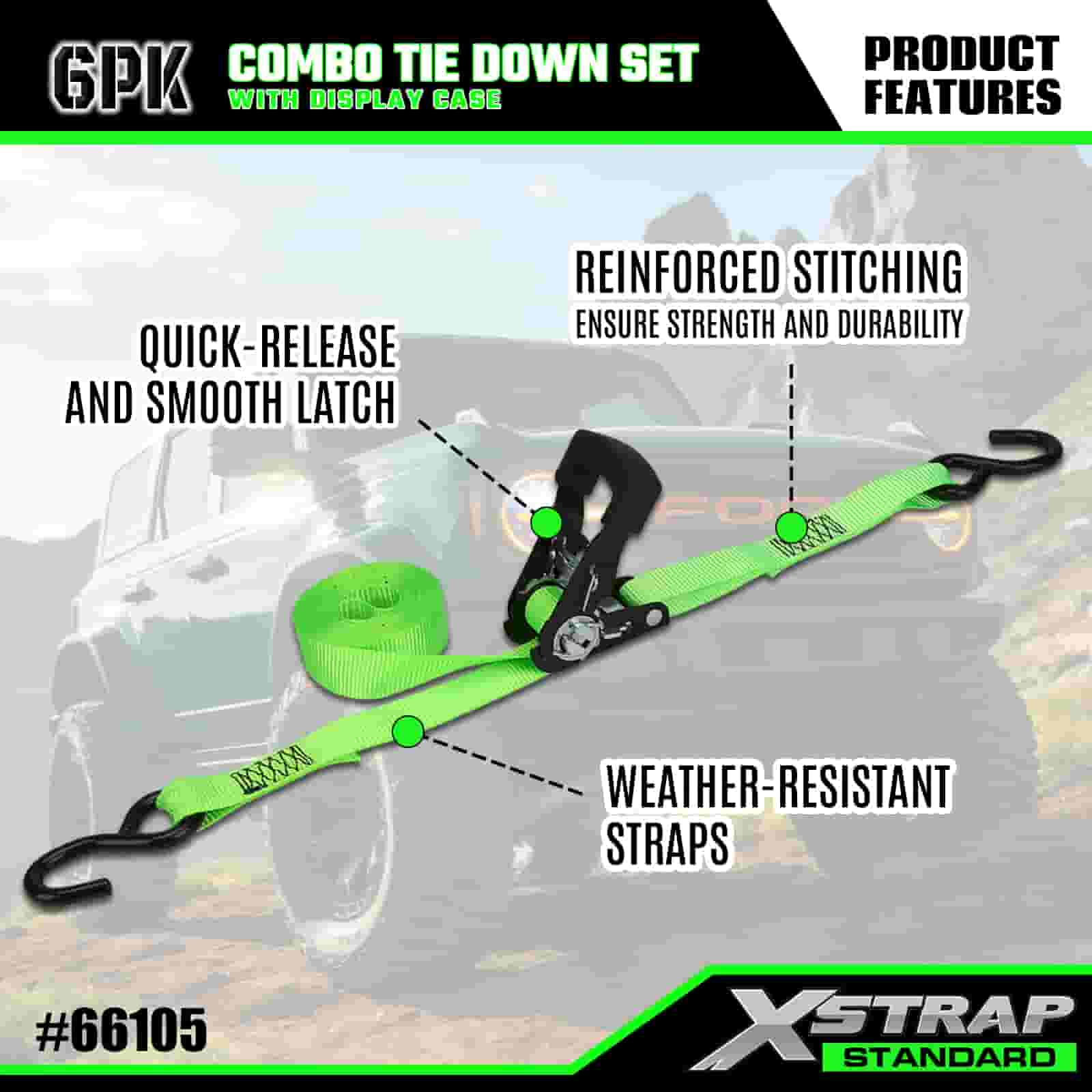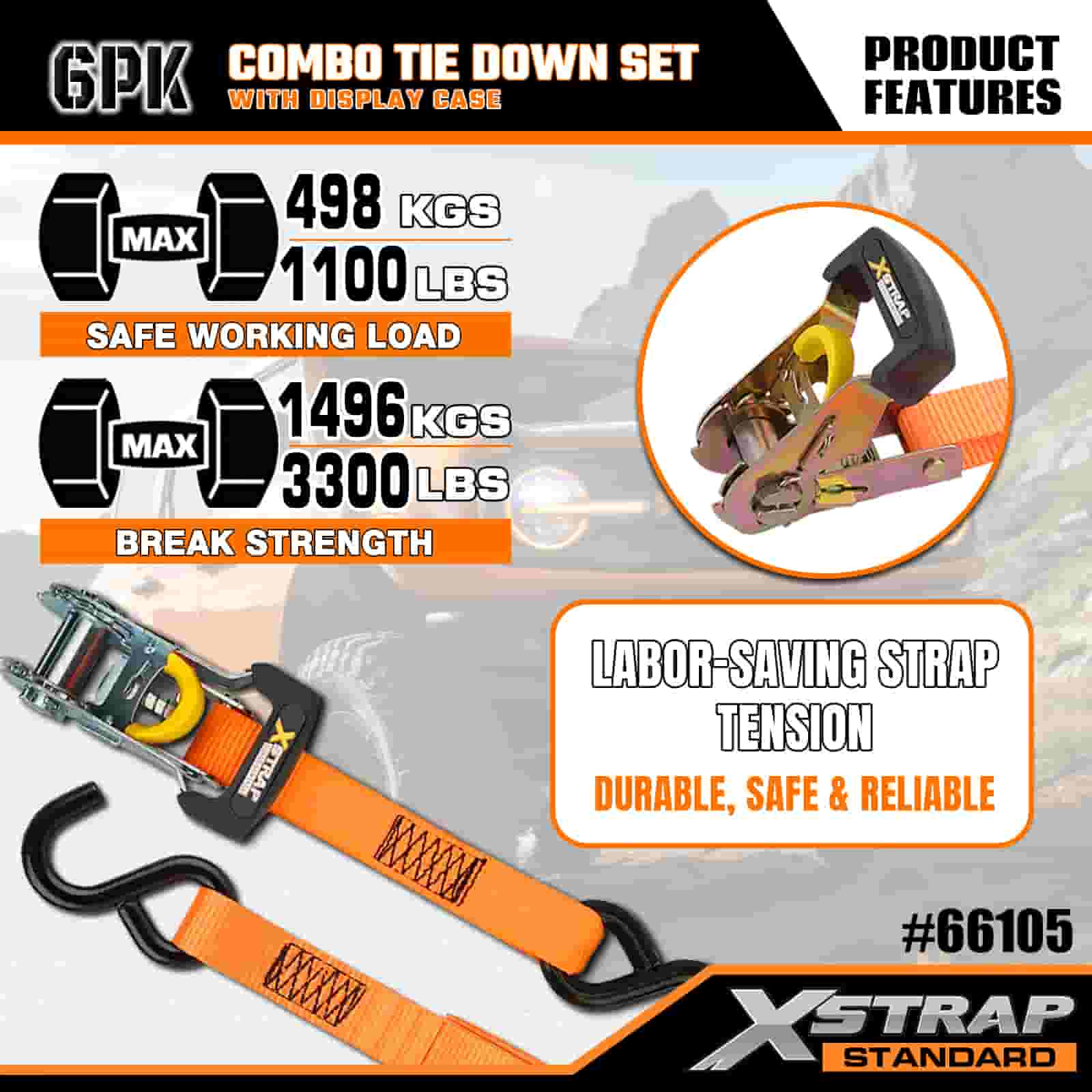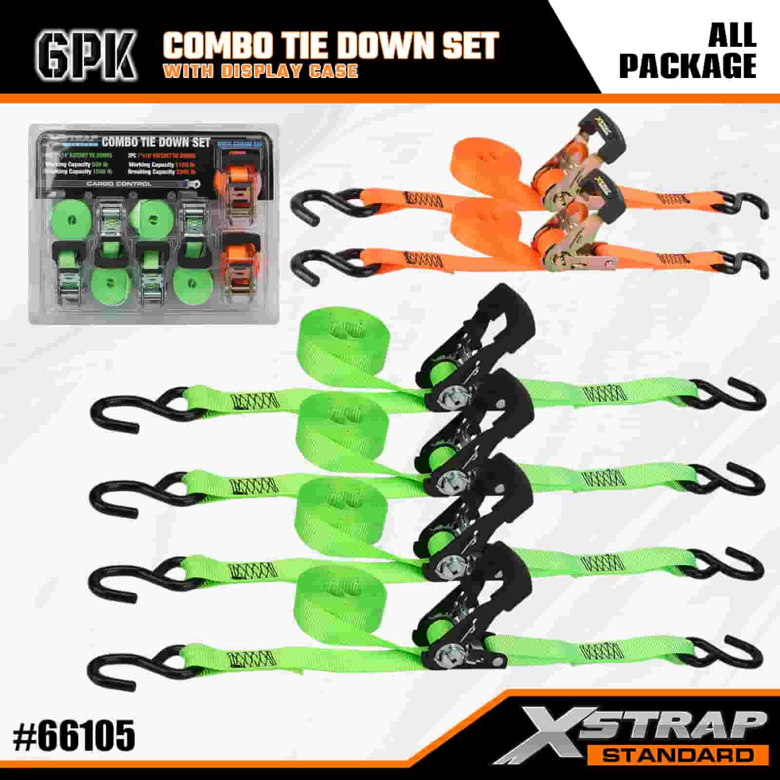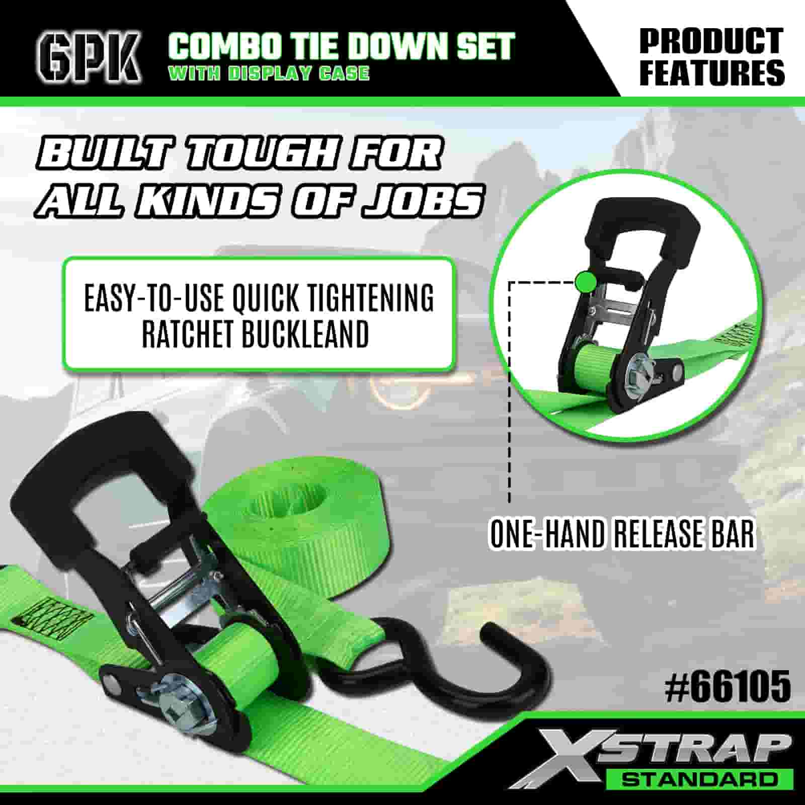 - Confezione espositiva combinata organizzata: viene fornito in una vetrina ordinata ed etichettata che separa 4 cinghie di fissaggio verdi leggere e 2 cinghie di fissaggio arancioni pesanti che mantengono il set in ordine per lo stoccaggio, il trasporto e una facile selezione della cinghia giusta per ogni lavoro.