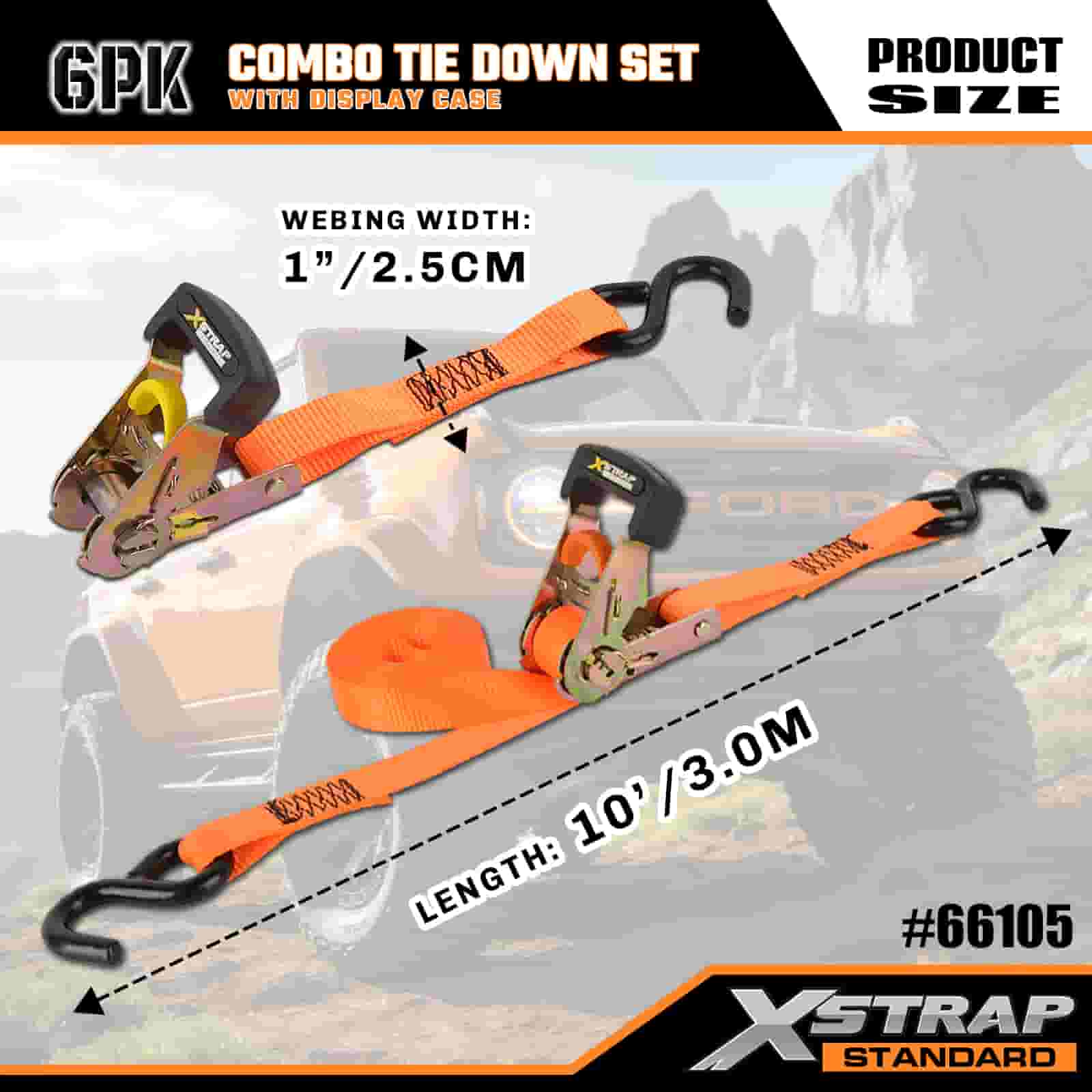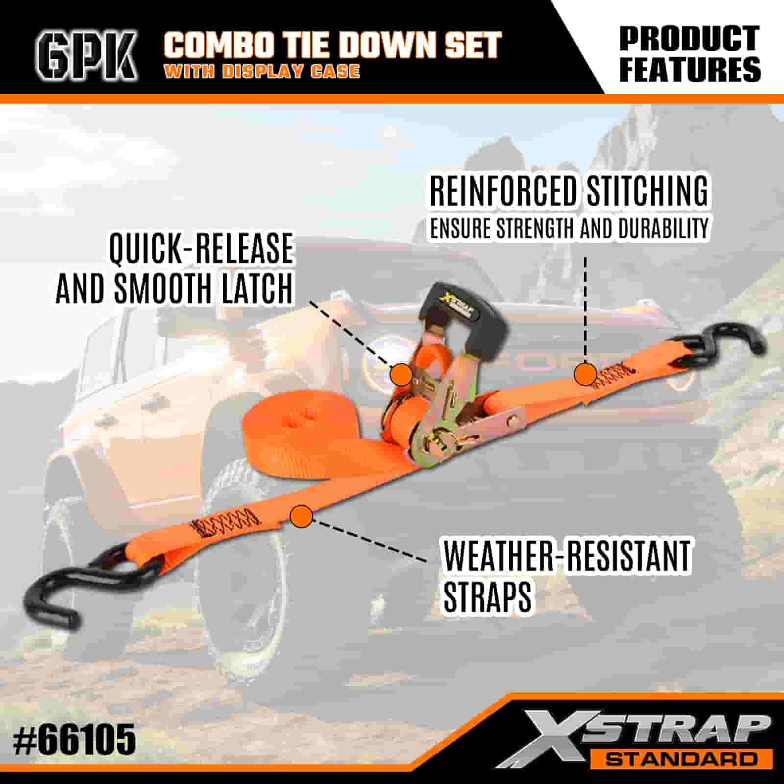 Xstrap Confezione da 6 cinghie con cricchetto in alluminio, cinghie di ancoraggio per carico da 1" x 14' e 1" x 10' in poliestere, cinghie di fissaggio per carico con capacità di 500 libbre e 1100 libbre con ganci a S per il controllo del carico di camioncini, SUV, portapacchi per auto, motociclette.