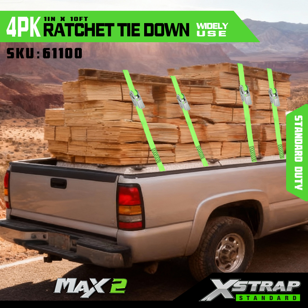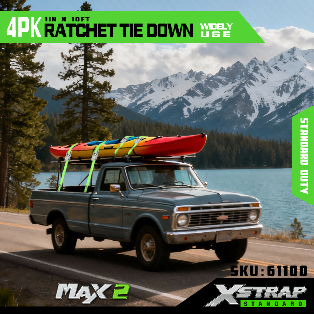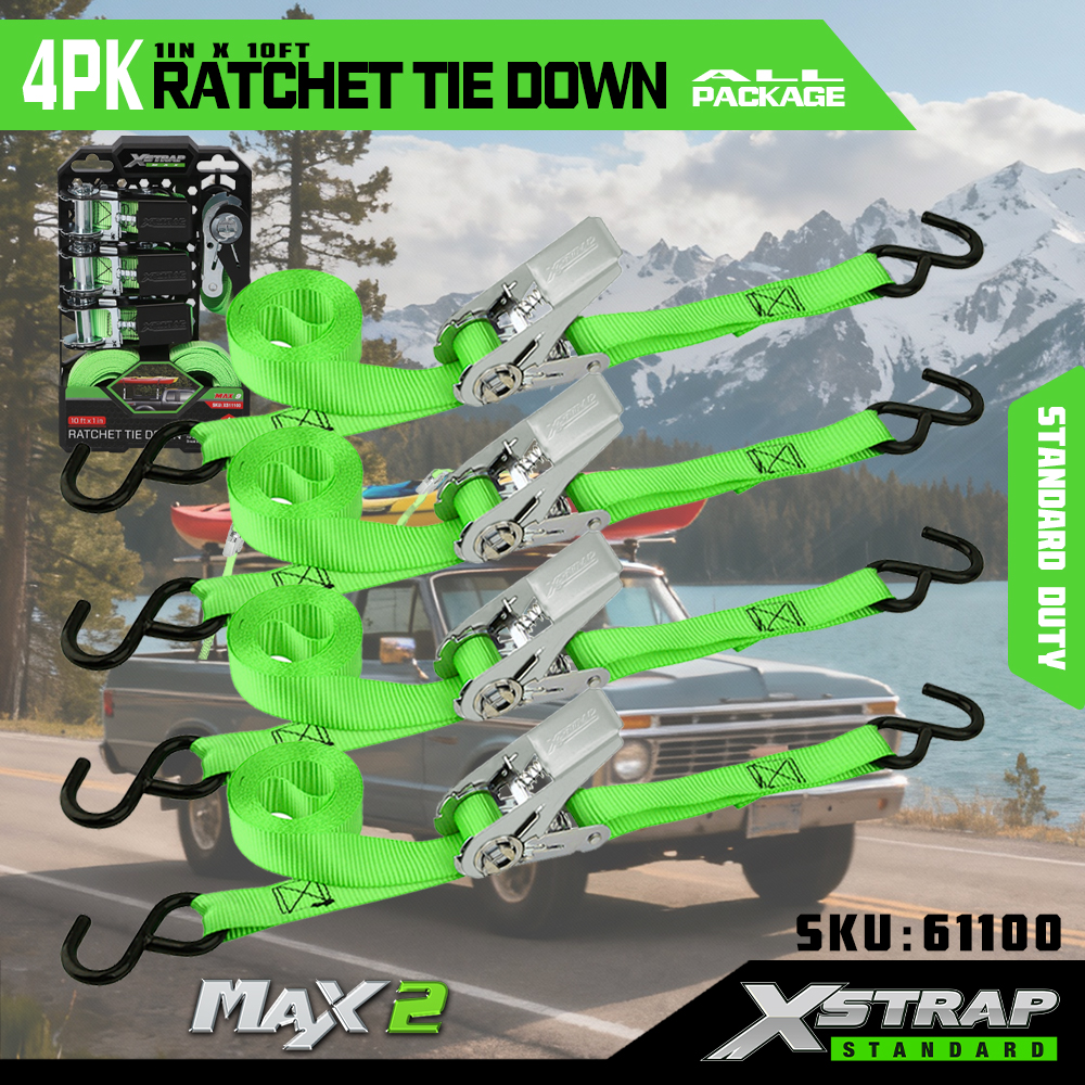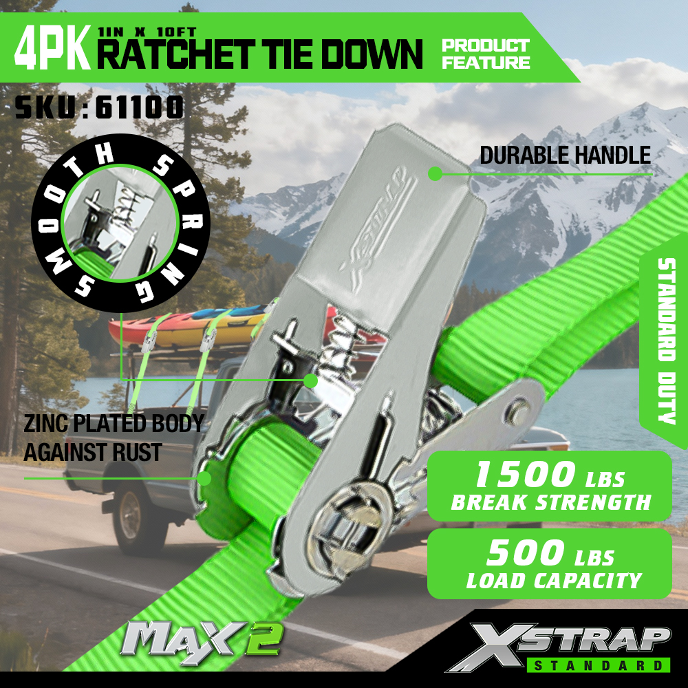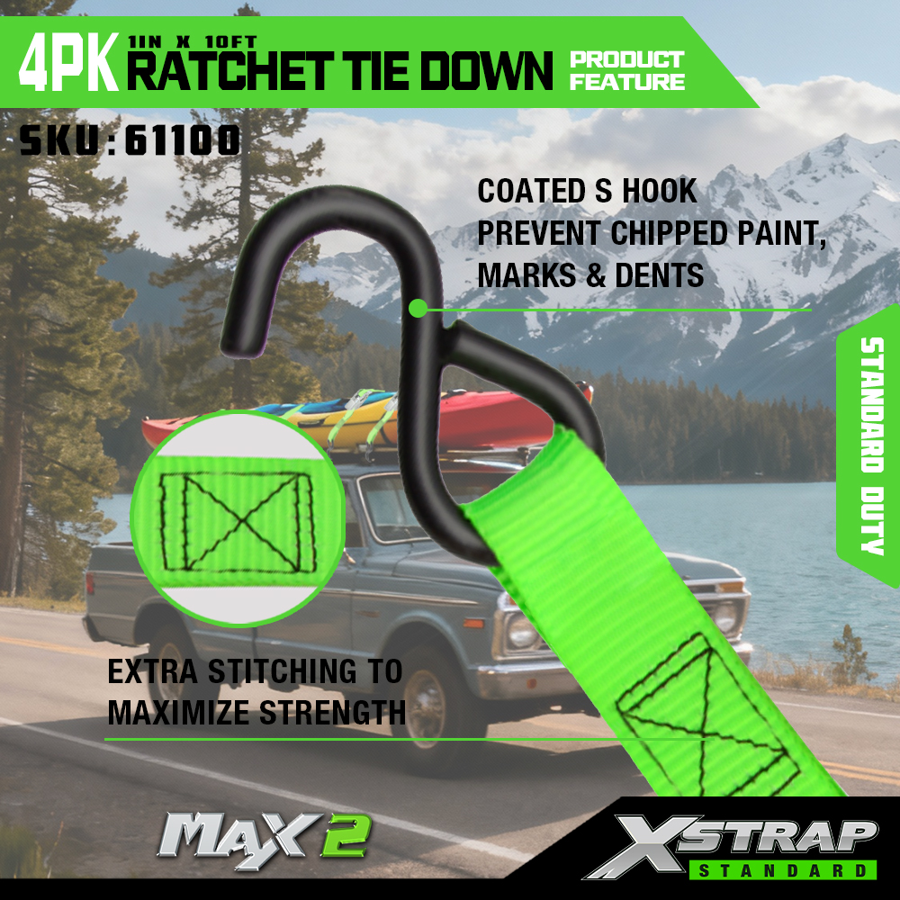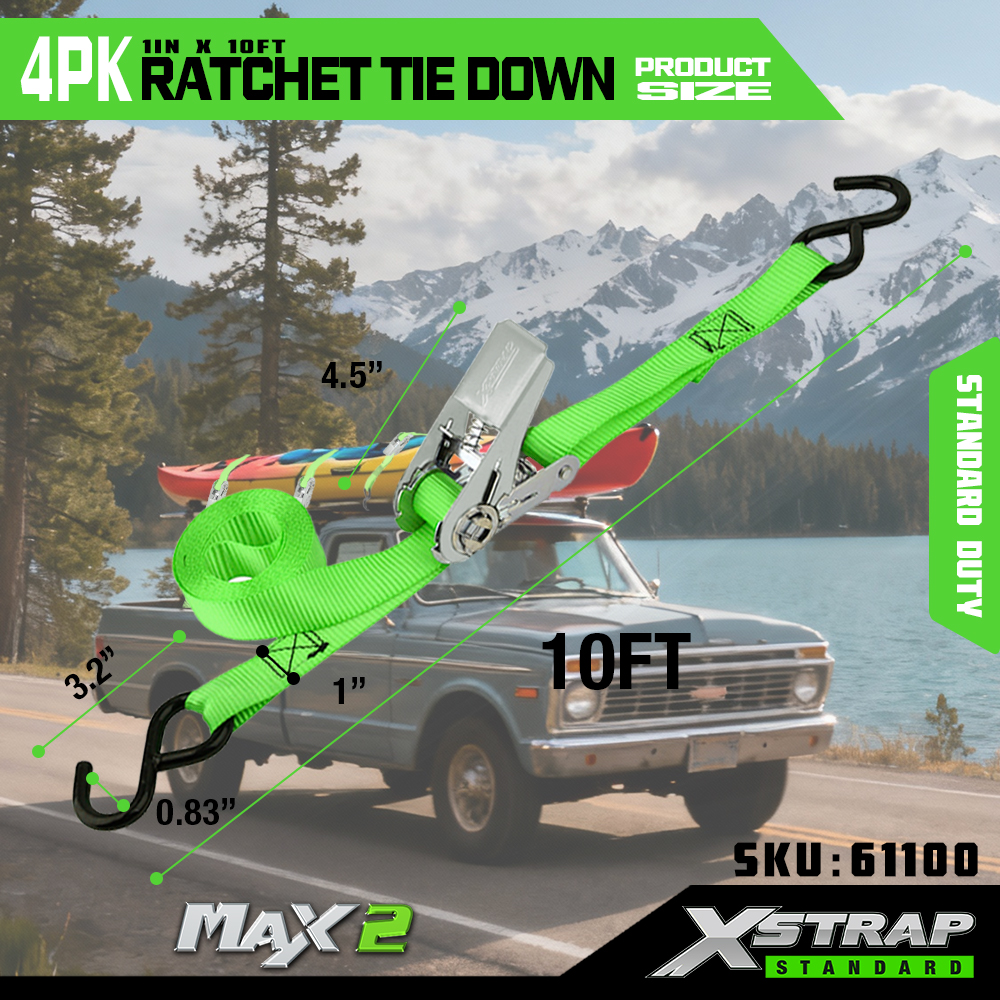 Xstrap Confezione da 4 cinghie con cricchetto, cinghia in poliestere da 1" x 15', cinghia con cricchetto da tirare, capacità di 500 libbre, cinghie di fissaggio per carico con ganci a S per camioncino, motociclette da rimorchio leggere, barche da pesca leggere, moto d'acqua, motoslitte.