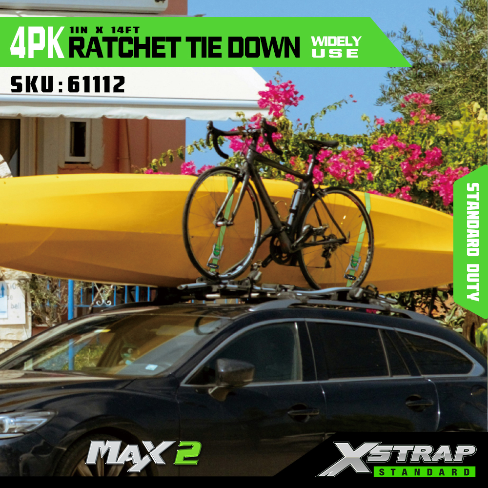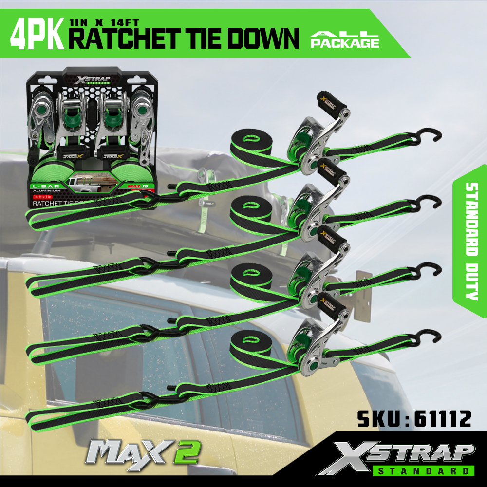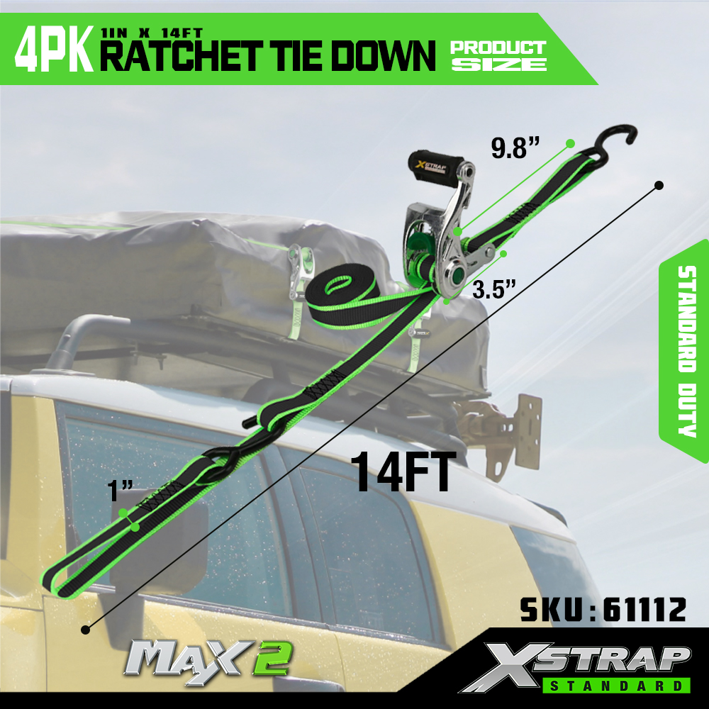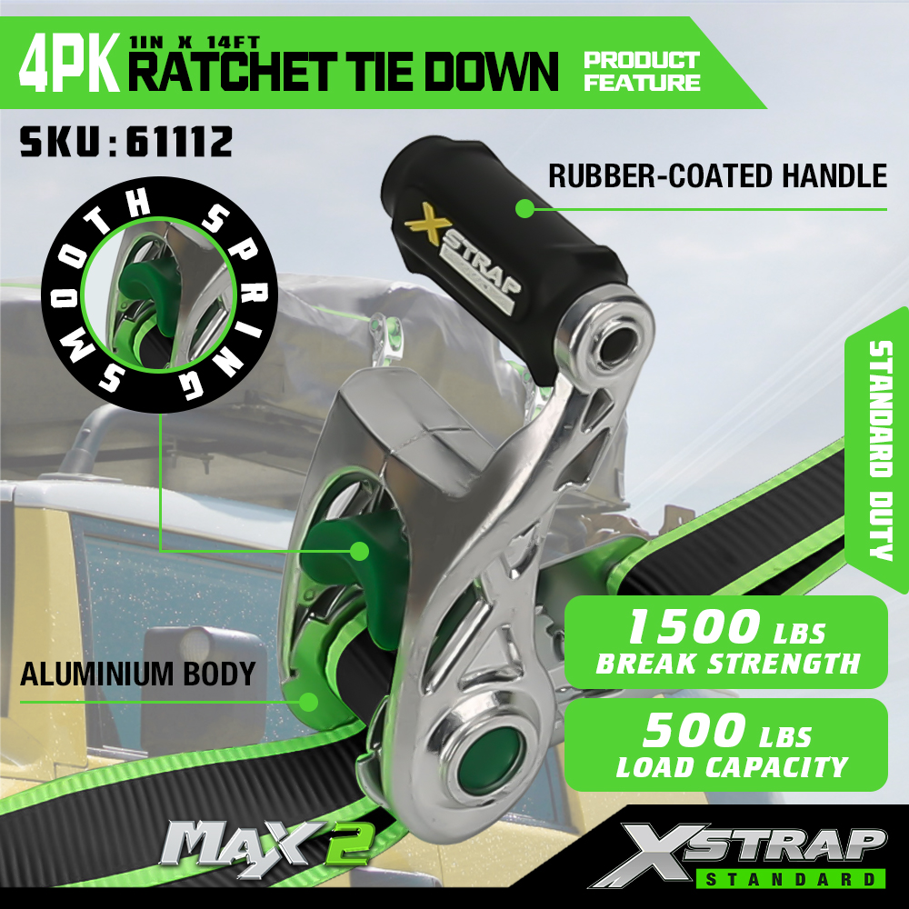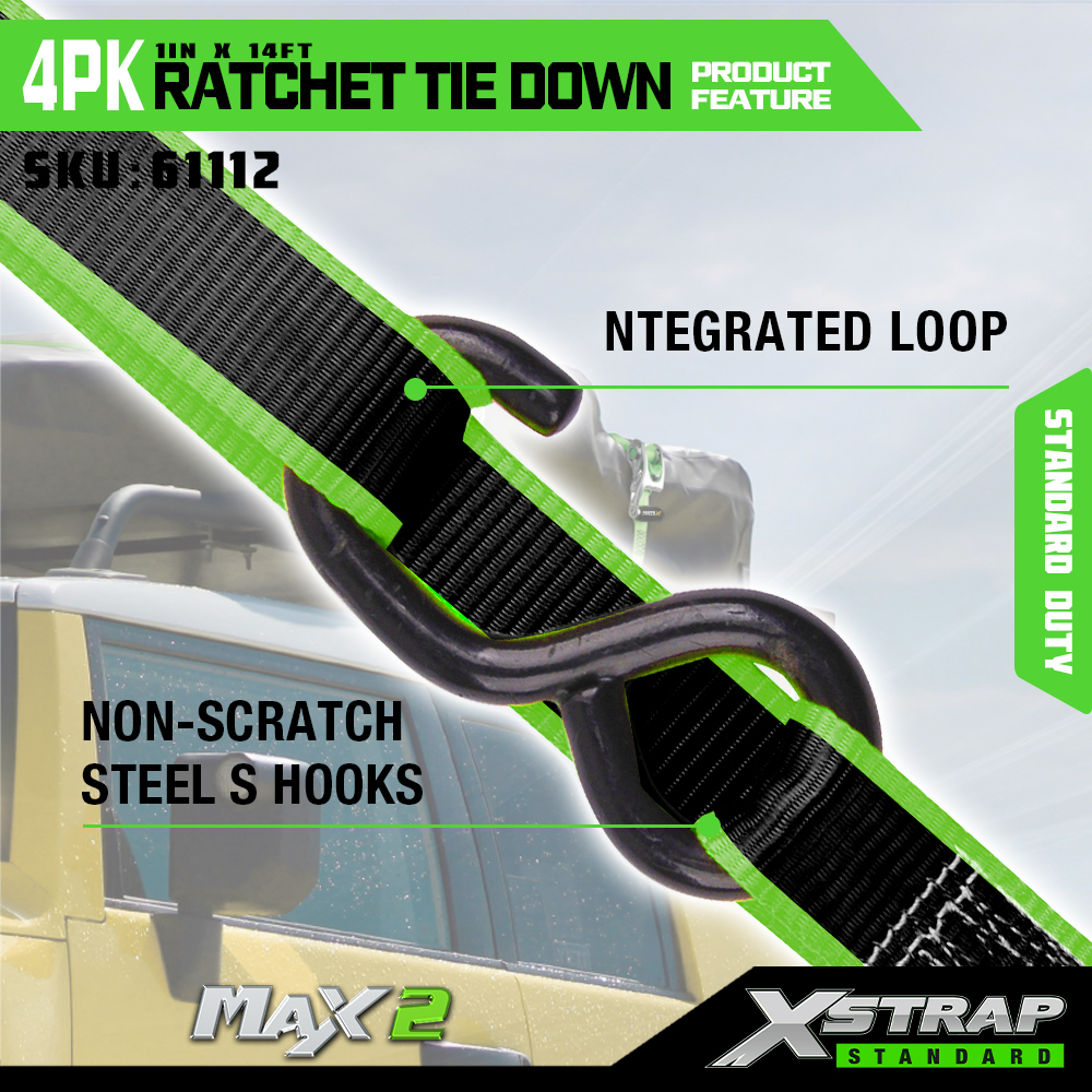 Xstrap Confezione da 4 Cinghie a Cricchetto con Maniglia Aperta, Cinghia di Fissaggio a Cricchetto in Poliestere da 1" x 14' con Passante Morbido, Cinghie di Fissaggio per Carico con Capacità di 1500 libbre (500 libbre) con Cricchetto in Alluminio e Ganci a S per Carico, Camion, Tosaerba, ATV