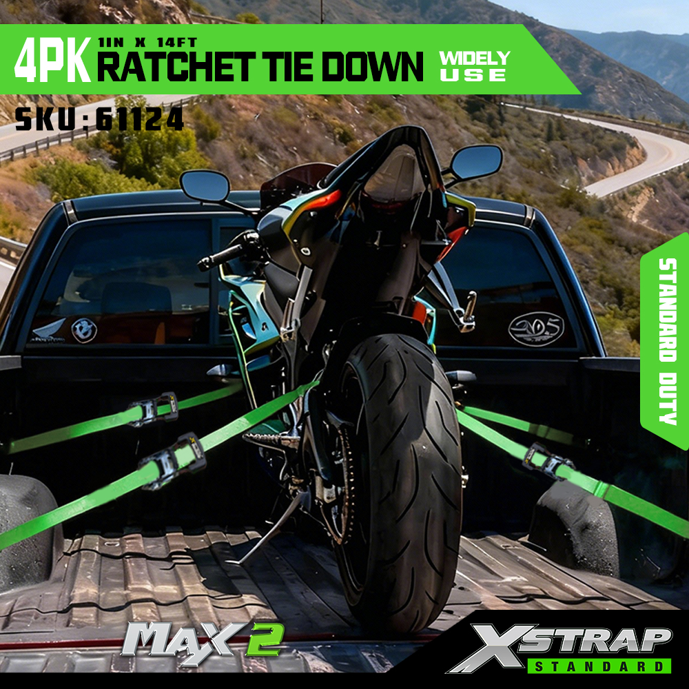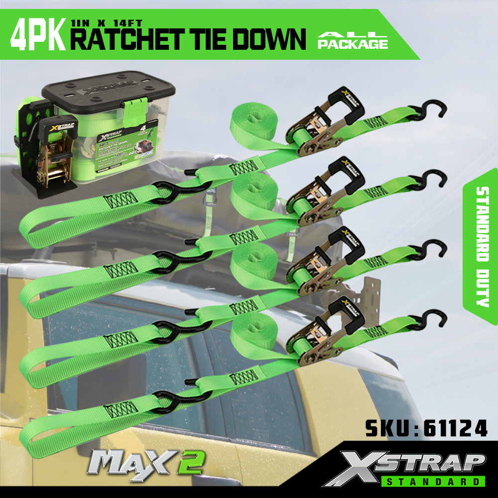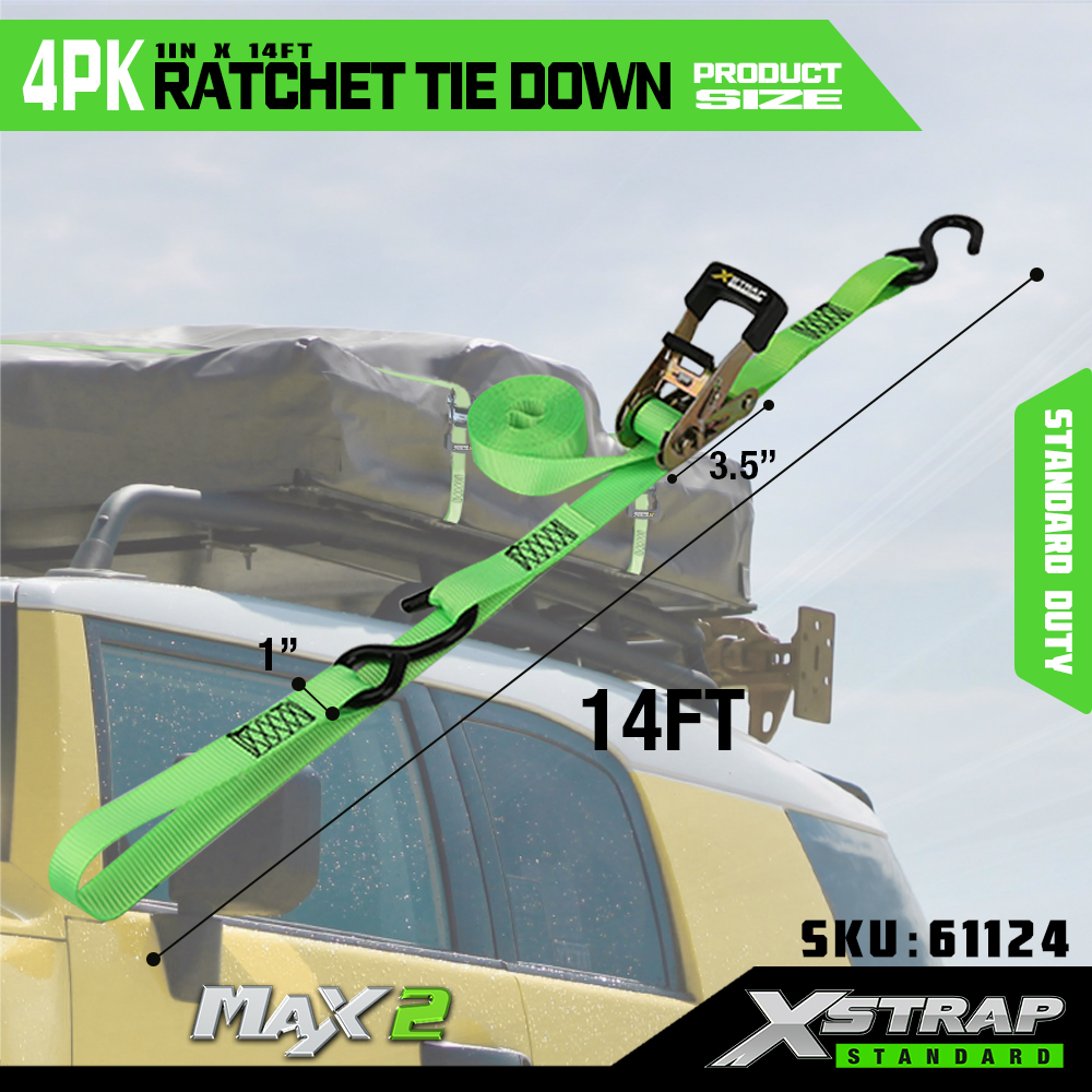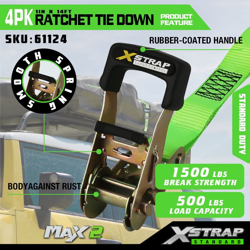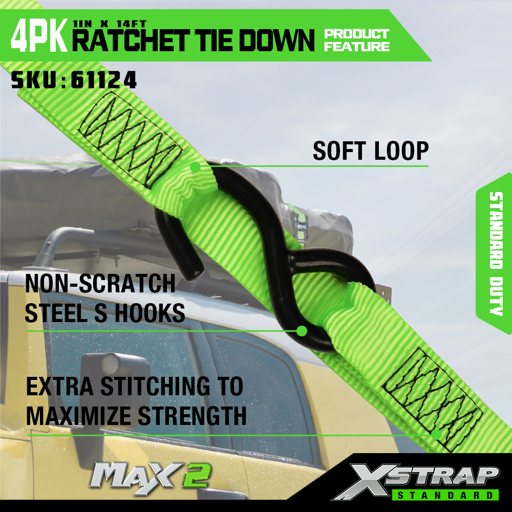 Xstrap Confezione da 4 cinghie a cricchetto, cinghia a cricchetto in poliestere da 1"x 14' con passante morbido, capacità di 1500 libbre (500 libbre) Cinghie di fissaggio per carico con cricchetto in metallo e ganci a S per carico, camion, tosaerba, ATV.