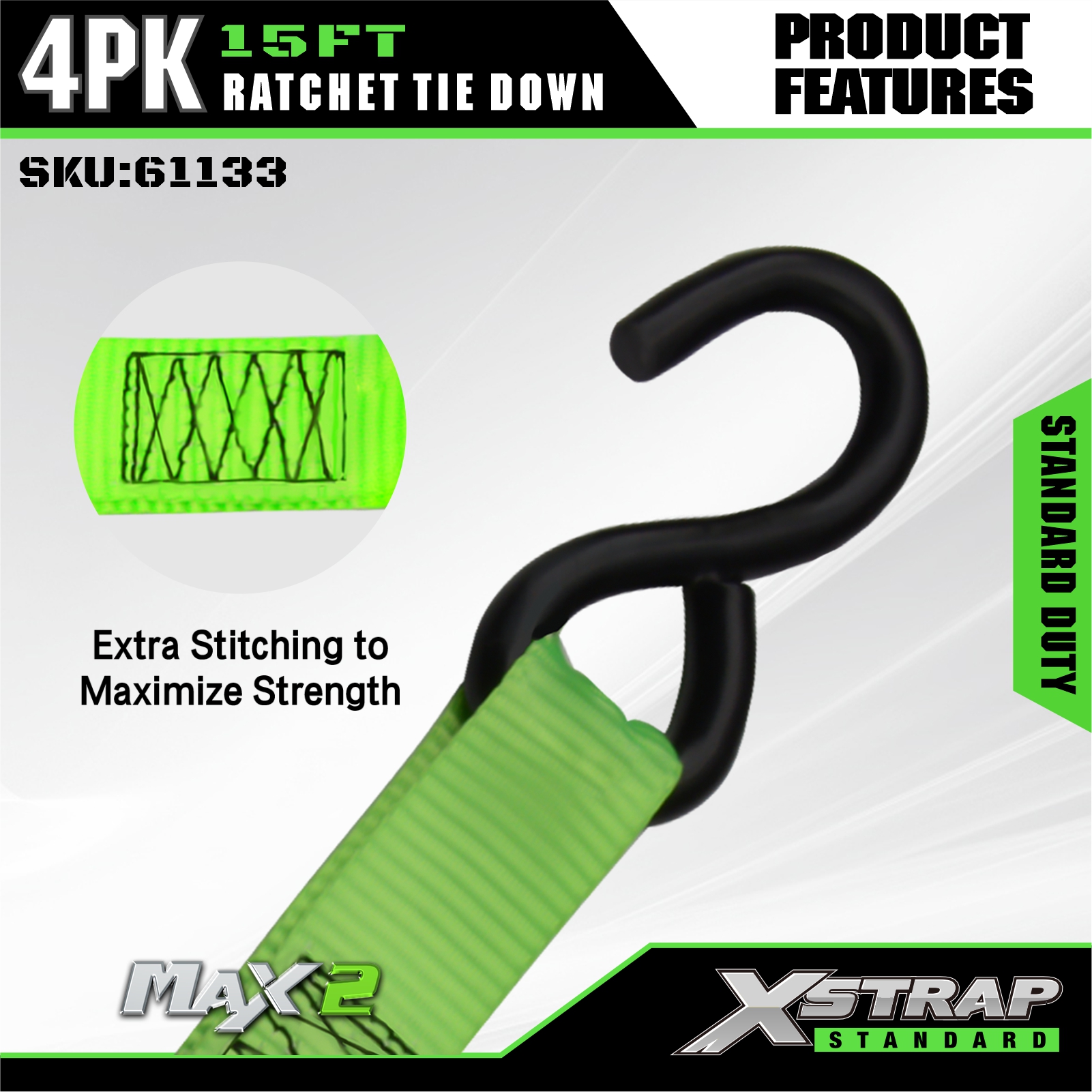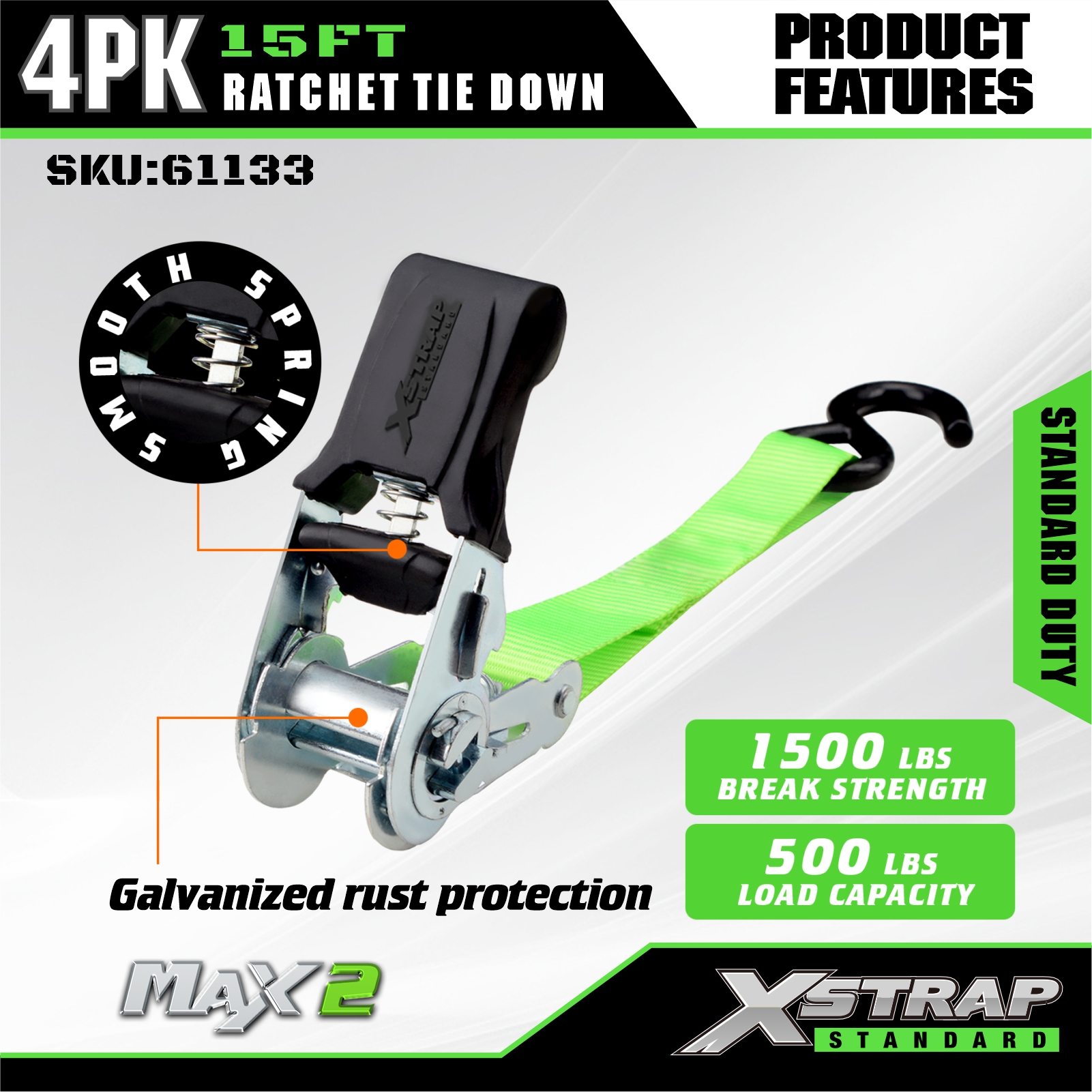 - Hardware protettivo e resistente alla ruggine: dotato di componenti a cricchetto in acciaio zincato (per combattere la corrosione) e ganci a S rivestiti di nero: il rivestimento protegge le superfici del veicolo/carico dai graffi garantendo al tempo stesso una presa salda e stabile.